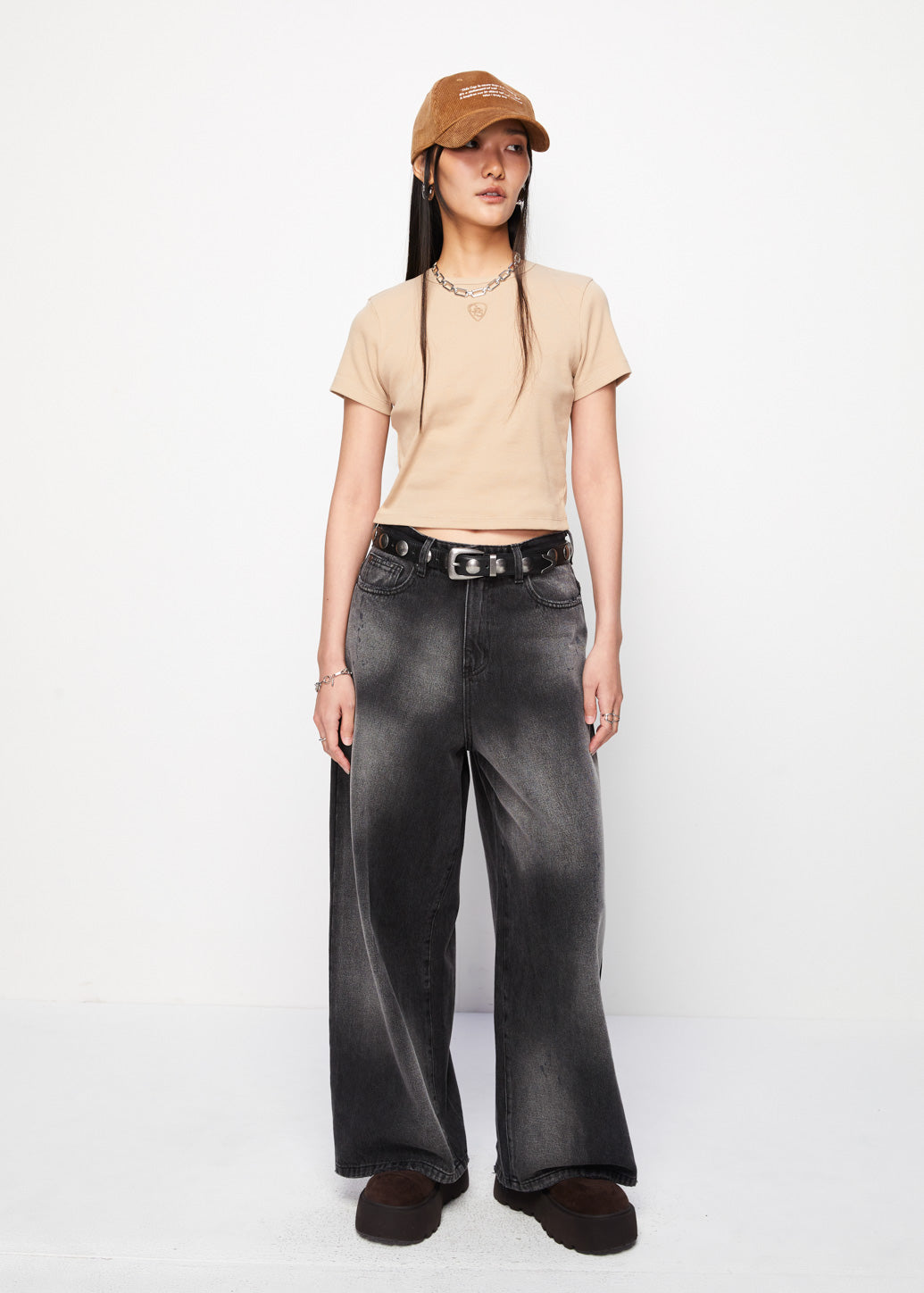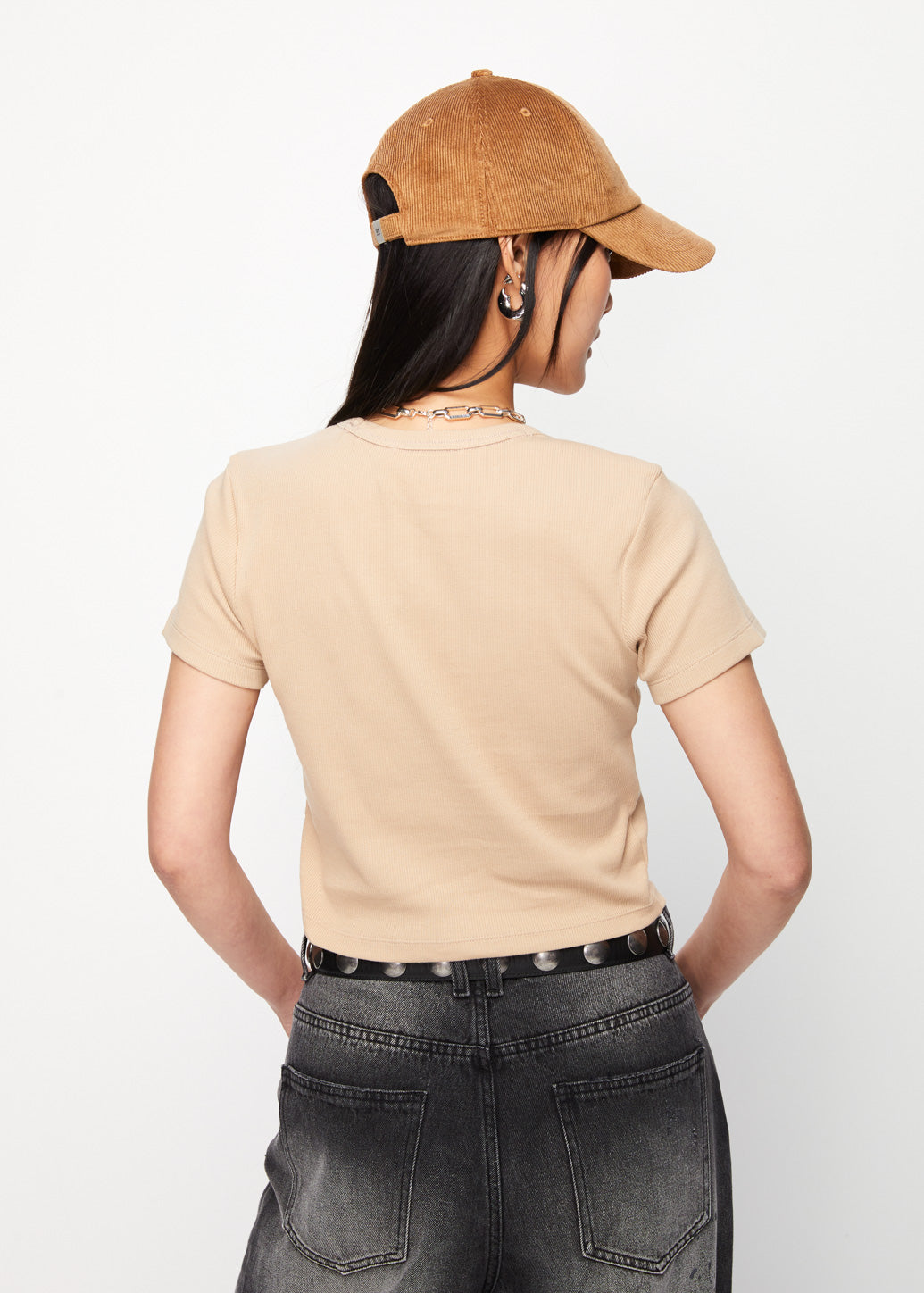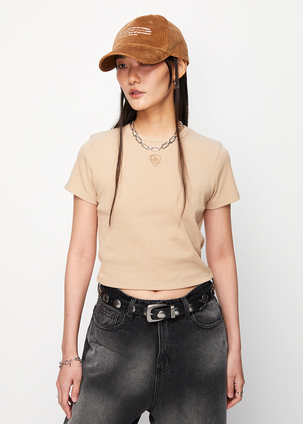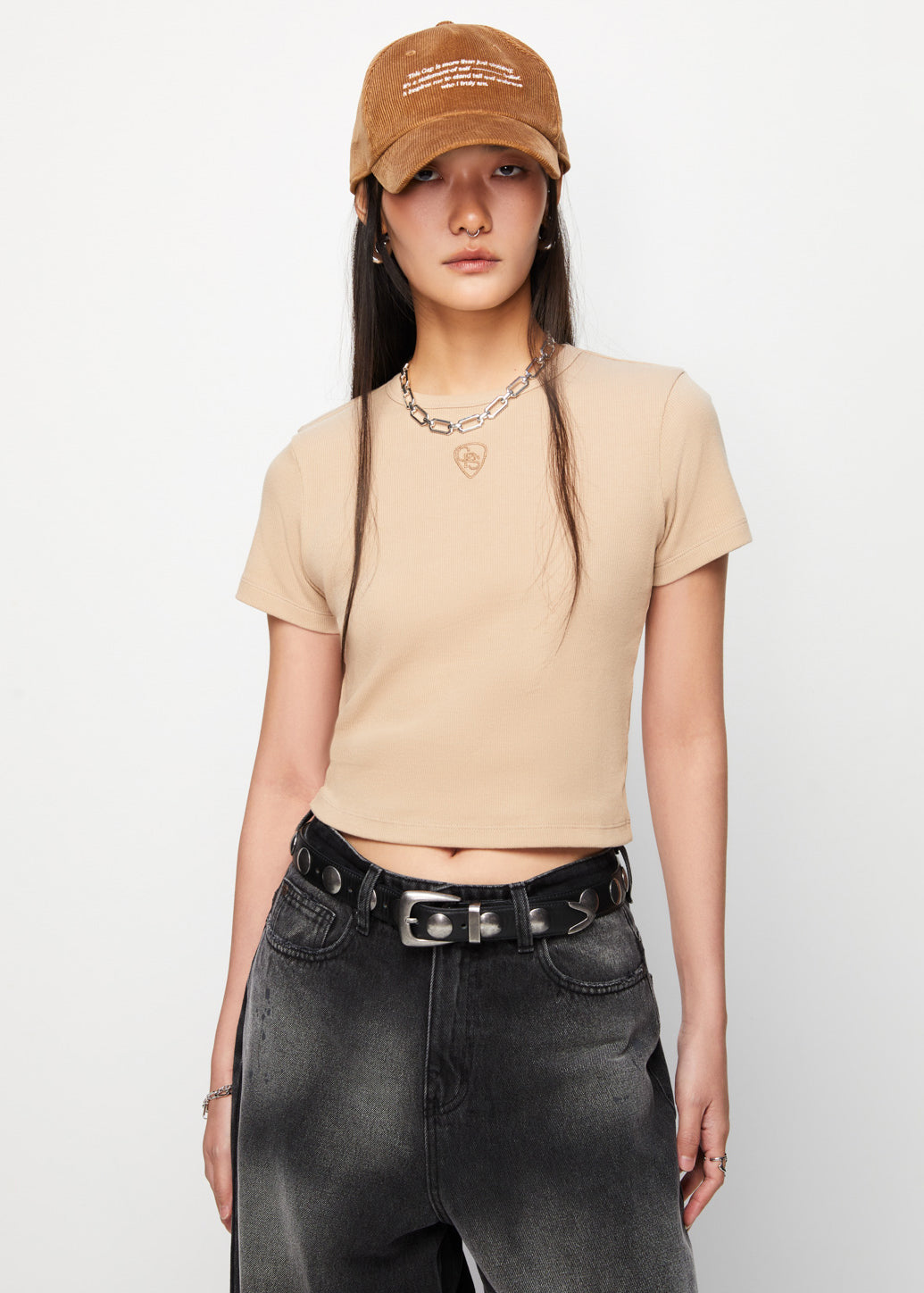 Short-sleeve cropped T-shirt with a minimal design, featuring an embroidered guitar pick logo on the front. Made from comfortable ribbed spandex fabric, perfect for pairing with jeans or denim skirts to elevate your casual look every day.