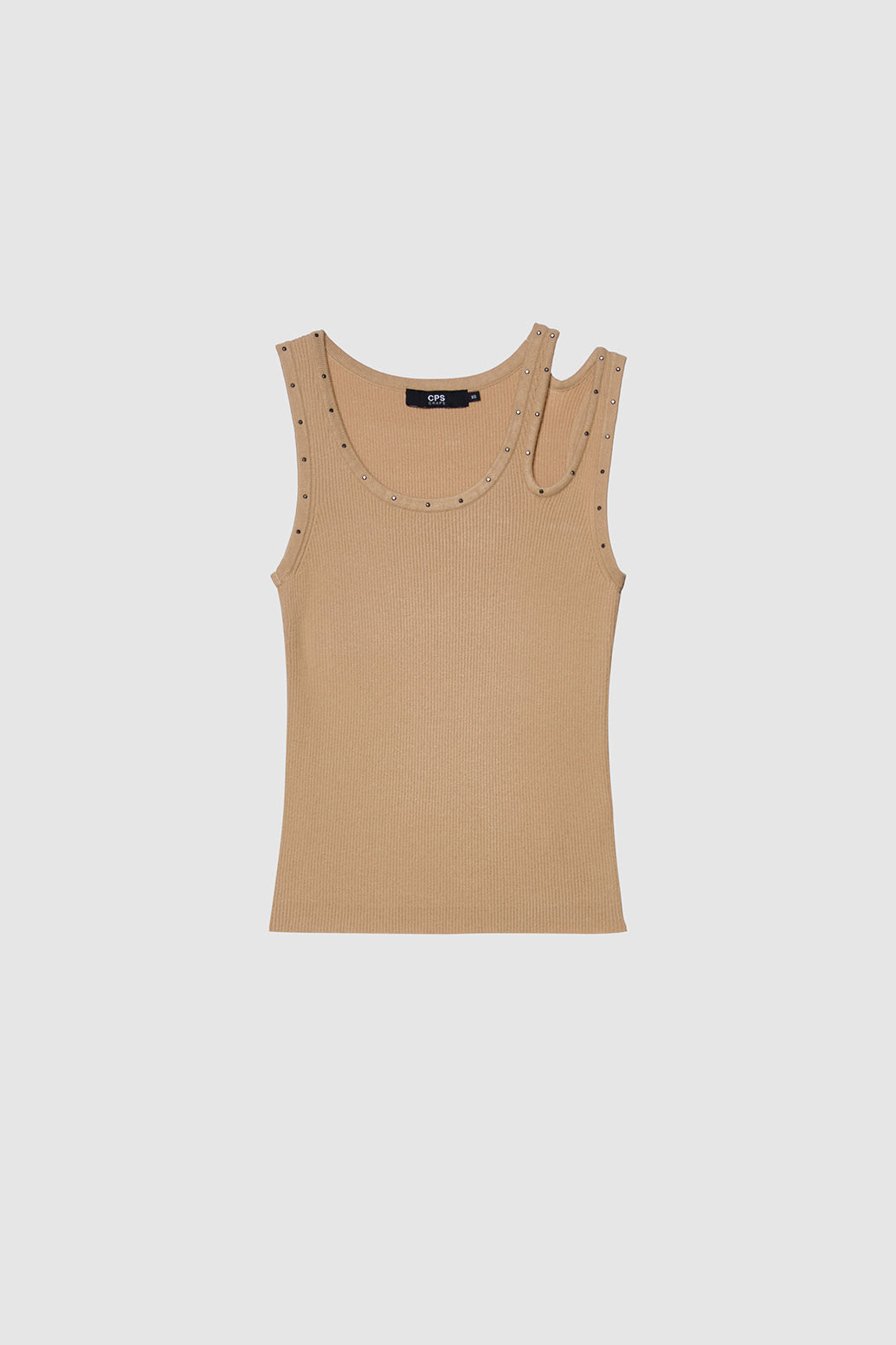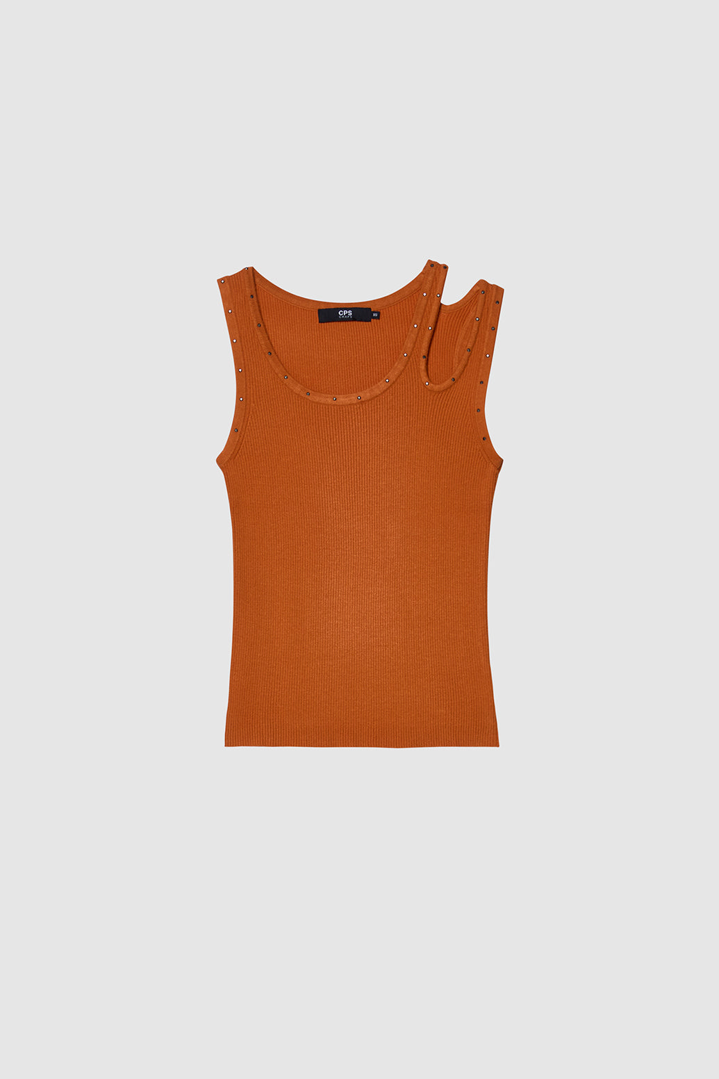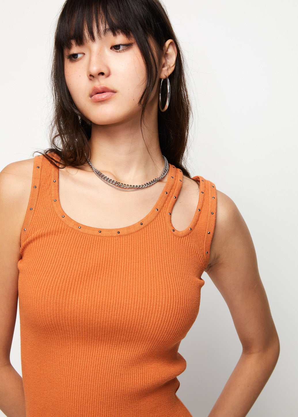 A tank top with a vintage rock vibe, featuring triple shoulder straps. Designed with an asymmetric neckline for a raw twist, accented by a studded diamond at the collar for a touch of glam. A versatile piece that pairs effortlessly with pants and skirts to create standout looks.
