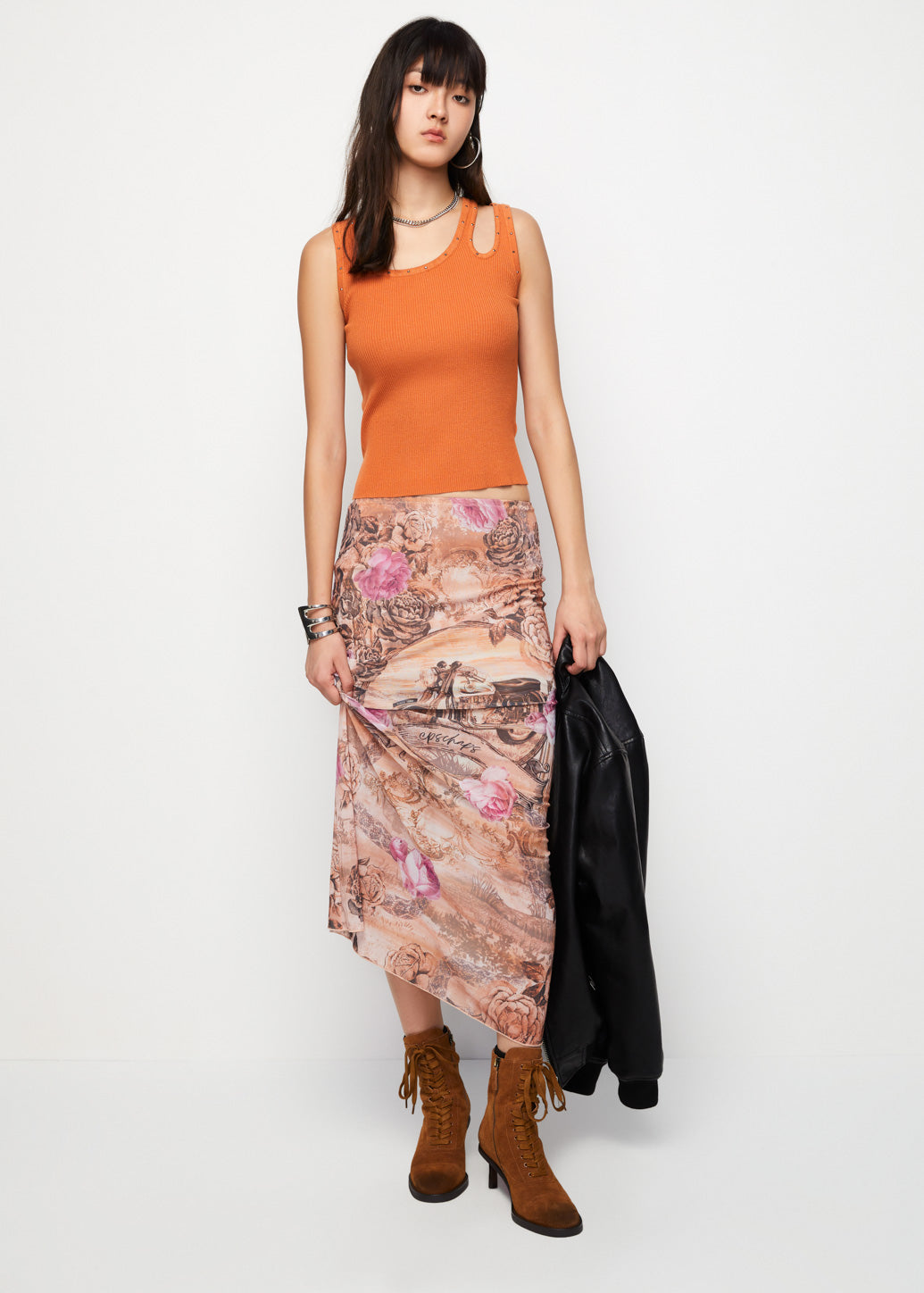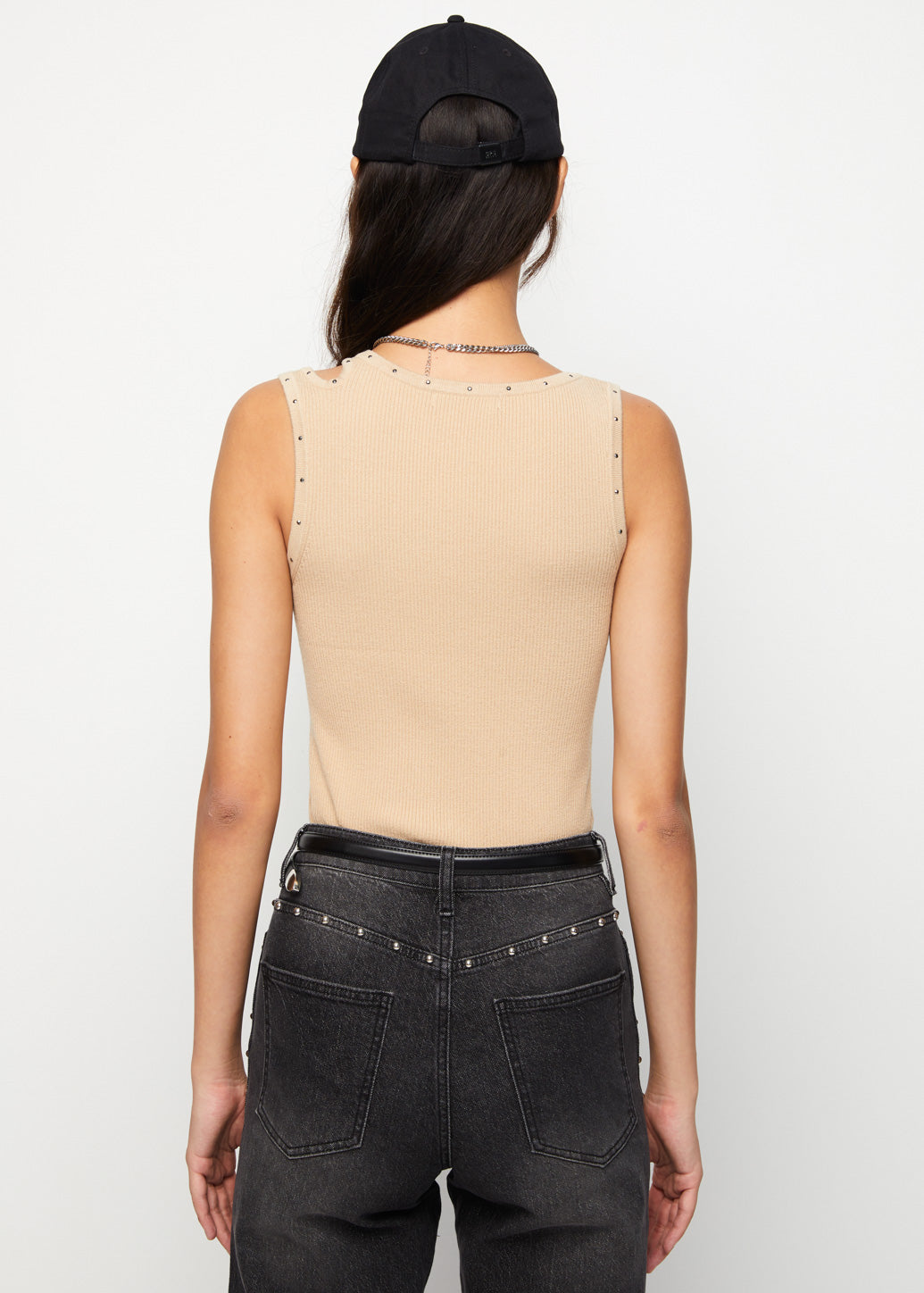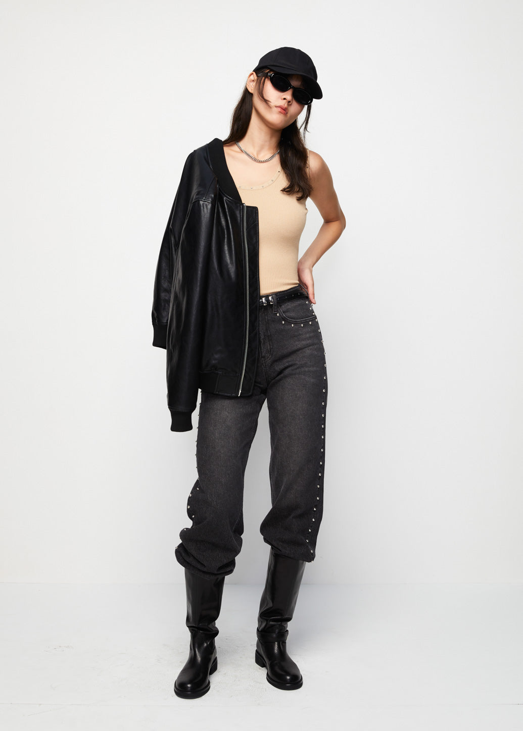 A tank top with a vintage rock vibe, featuring triple shoulder straps. Designed with an asymmetric neckline for a raw twist, accented by a studded diamond at the collar for a touch of glam. A versatile piece that pairs effortlessly with pants and skirts to create standout looks.