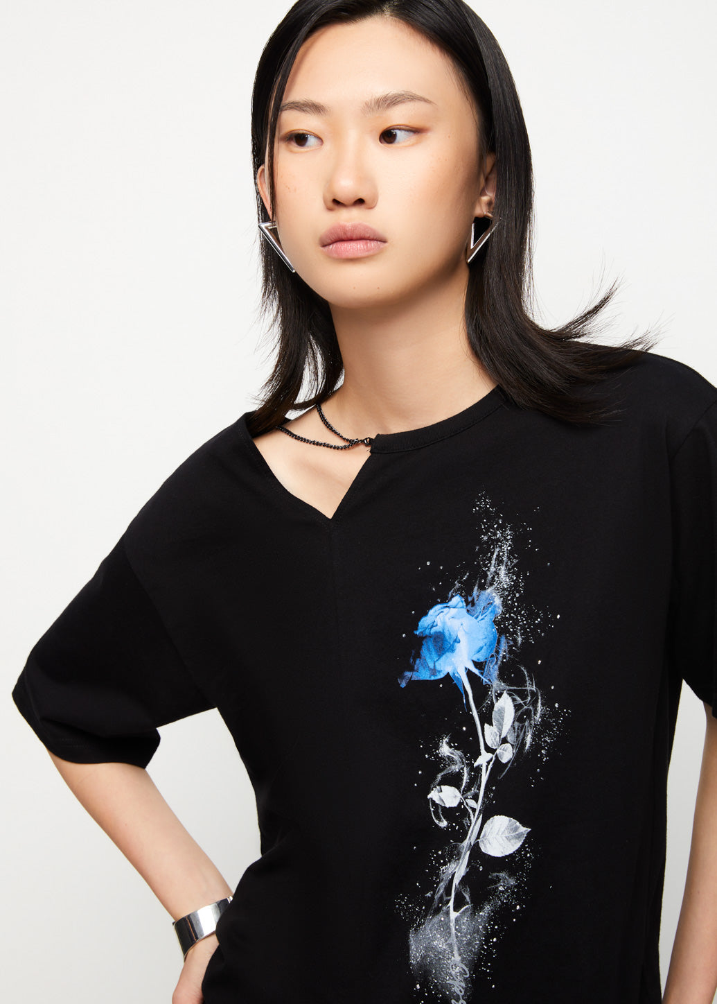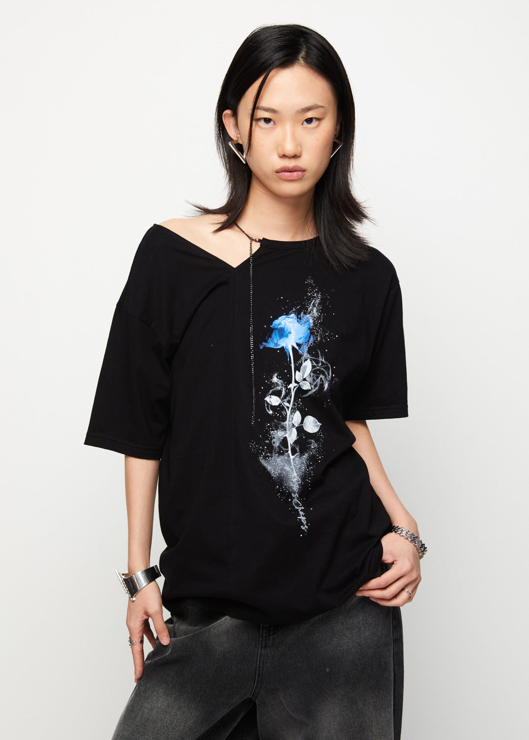Discover a cool look with our oversized t-shirt. It features a unique asymmetrical collar with a stylish chain detail on one side, adding an edgy touch. A floral print on the front perfectly blends femininity with a cool aesthetic. This piece is ideal for pairing with various styles of jeans to elevate your casual look.