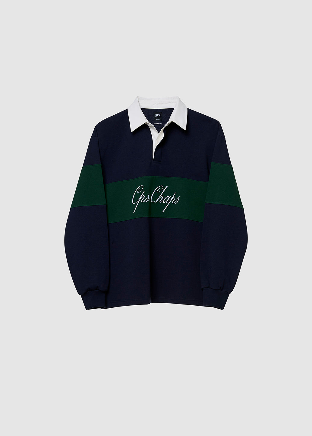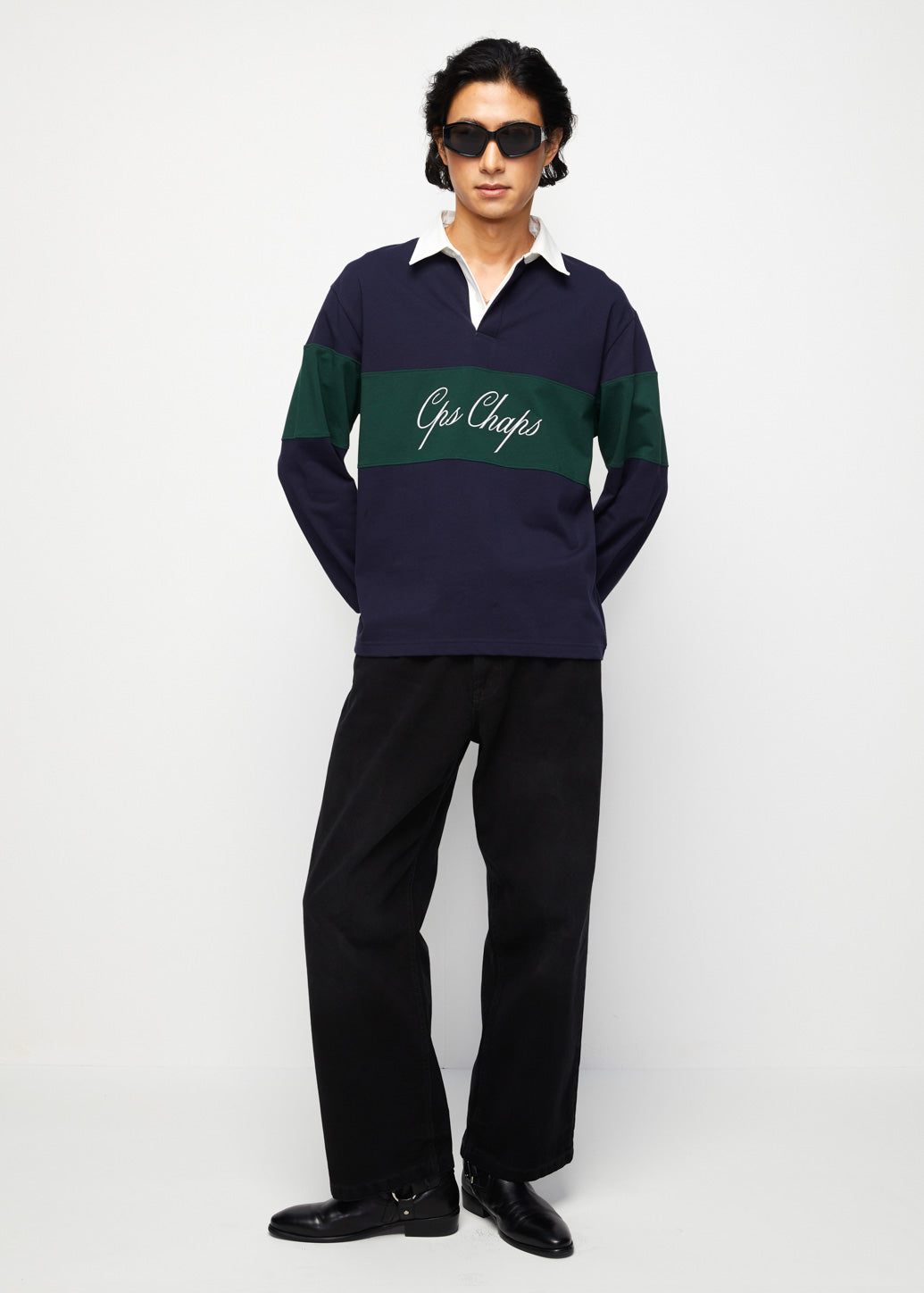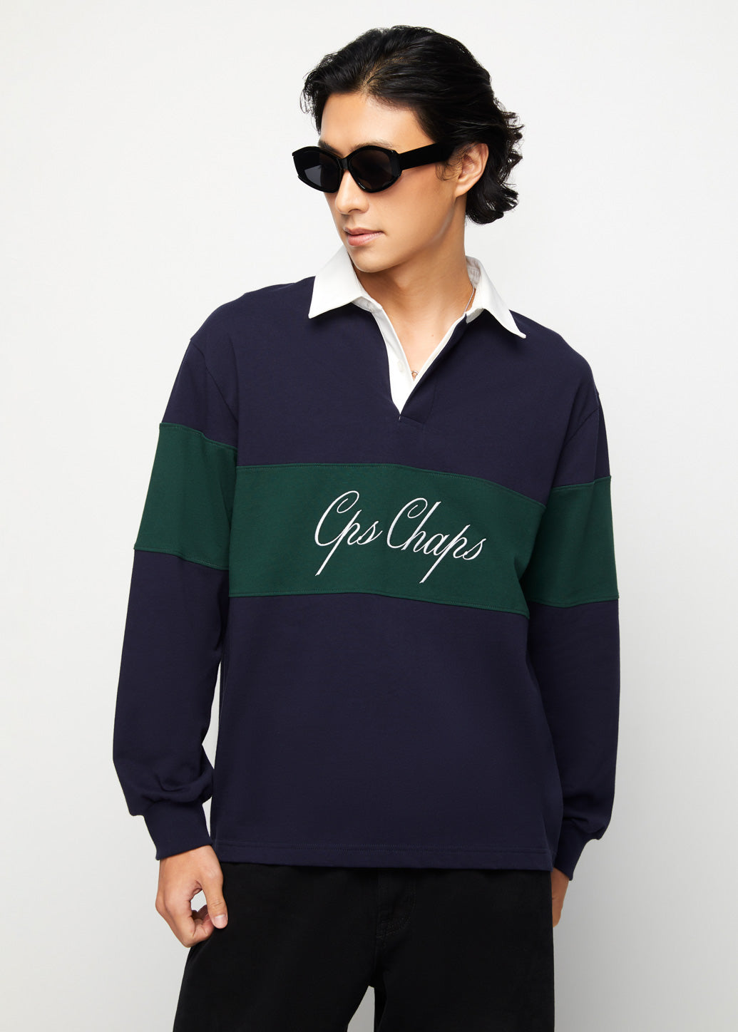Elevate your sporty style with a long-sleeve rugby jersey. This loose-fit polo features bold, contrasting stripes and an brand name on the front for a distinctive touch. Pair it with your favorite jeans or chinos to create a cool and contemporary vintage preppy look.