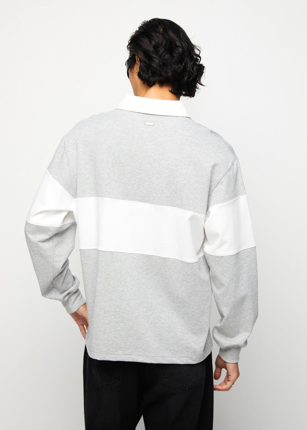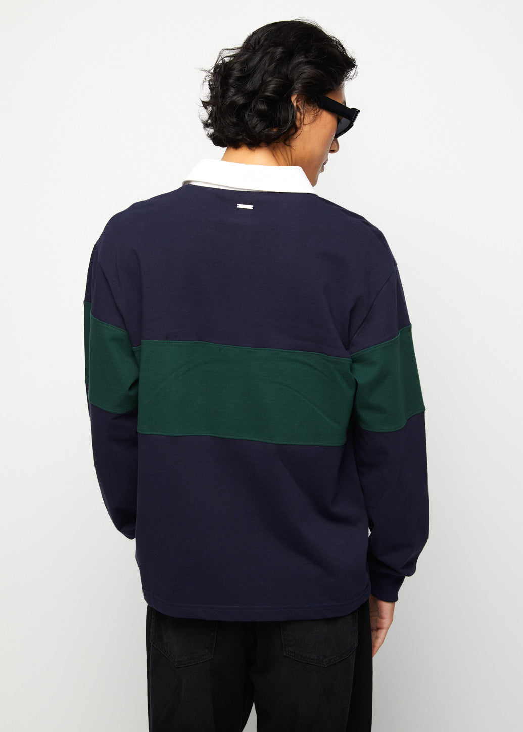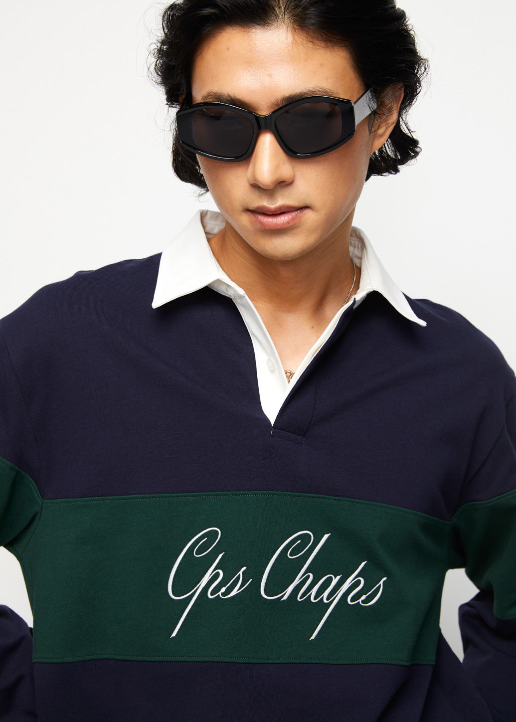 Elevate your sporty style with a long-sleeve rugby jersey. This loose-fit polo features bold, contrasting stripes and an brand name on the front for a distinctive touch. Pair it with your favorite jeans or chinos to create a cool and contemporary vintage preppy look.