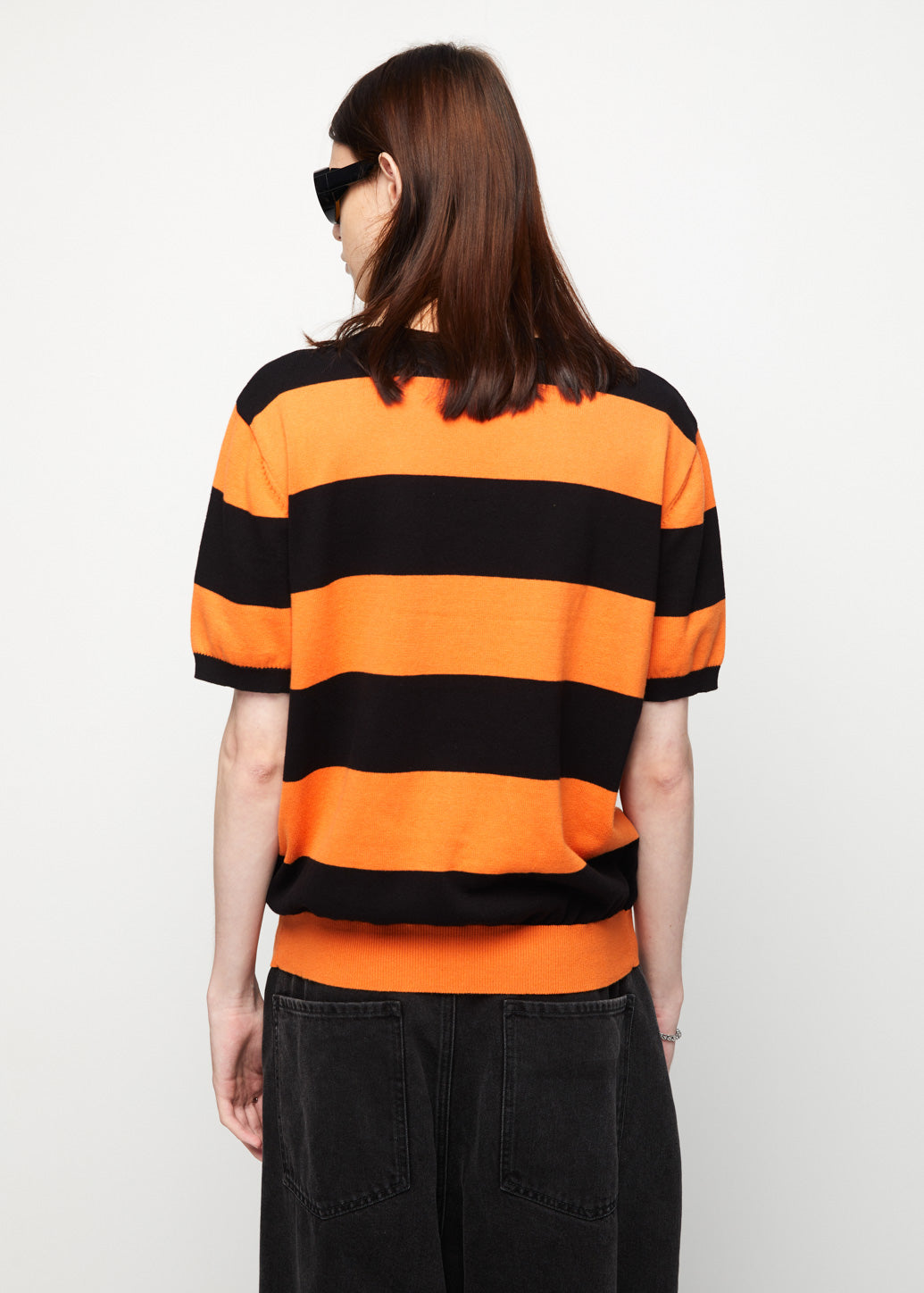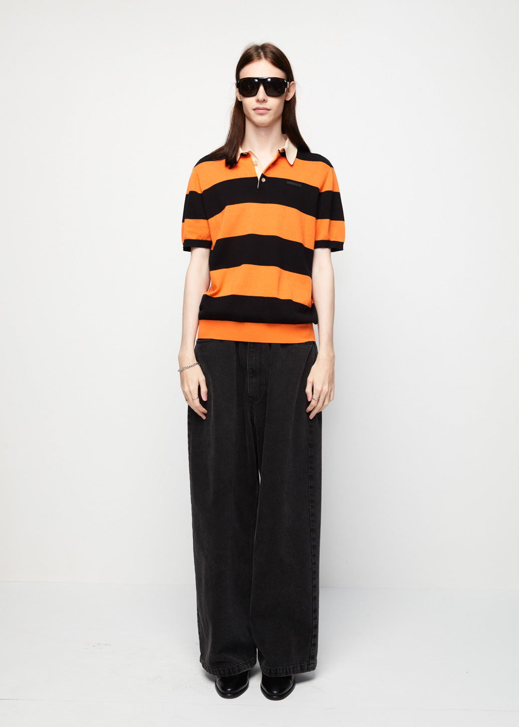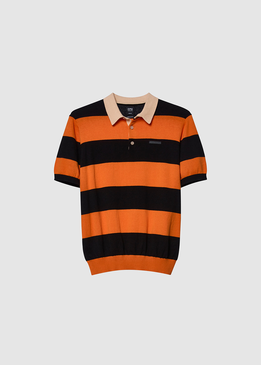 Short-sleeve rugby polo with orange stripe detailing, featuring vibrant tones that reflect classic vintage sports style. Finished with a chest logo patch for a unique touch, this piece adds retro charm to any outfit and occasion.