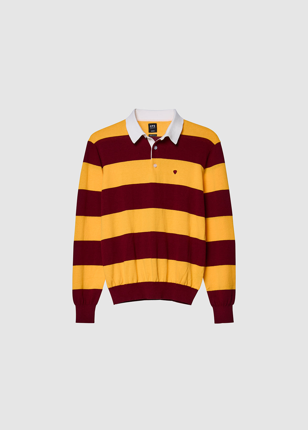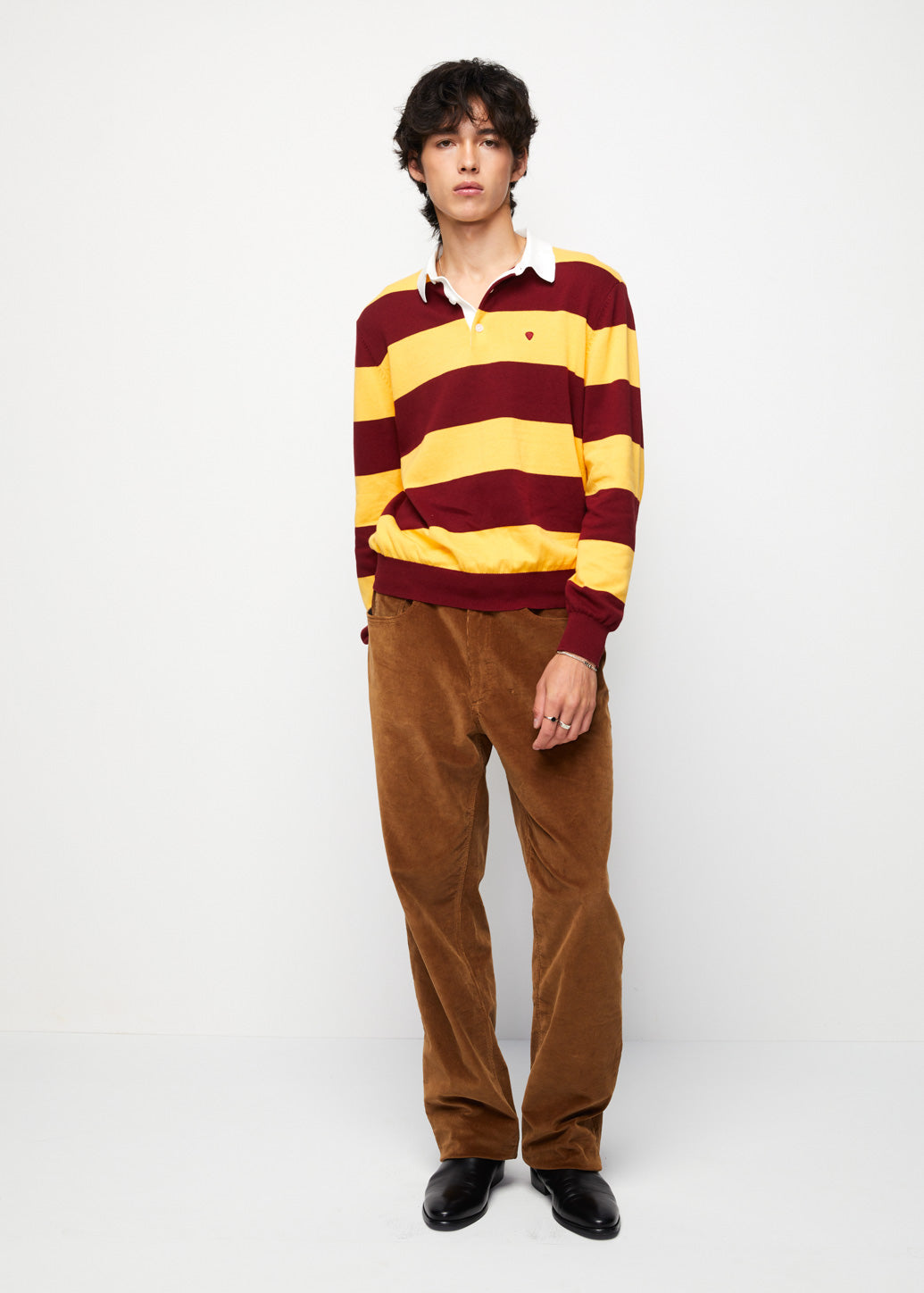 Long-sleeve rugby polo with stripes in a relaxed fit, featuring ribbed cuffs and hem for a snug finish. Accented with a guitar logo embroidery on the chest, it exudes vintage workwear vibes and keeps a preppy street style, whether worn alone or layered under a jacket.