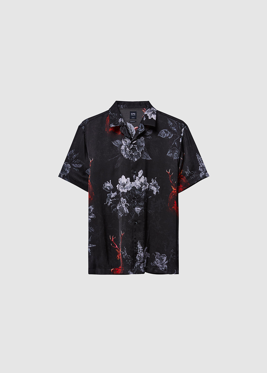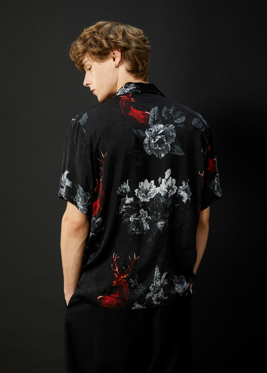 This black short-sleeve hawai shirt is the new holiday essential. It features an iconic graphic print of Red reindeer and White Christmas, masterfully blending three core colors for instant festive style. Throw it on with any bottom; this is your update to a confident, edgy "Christmas Rock" look all season long.
