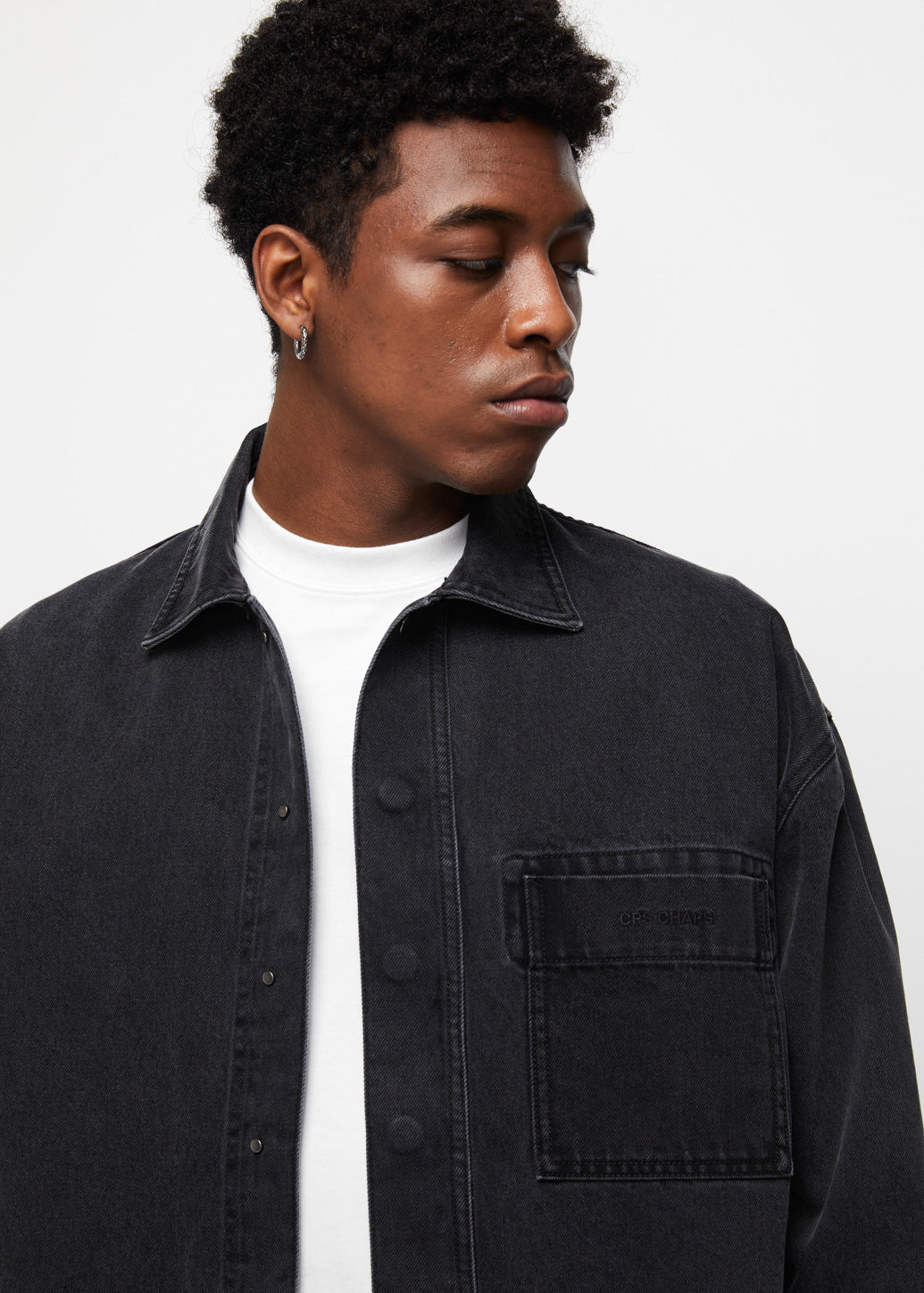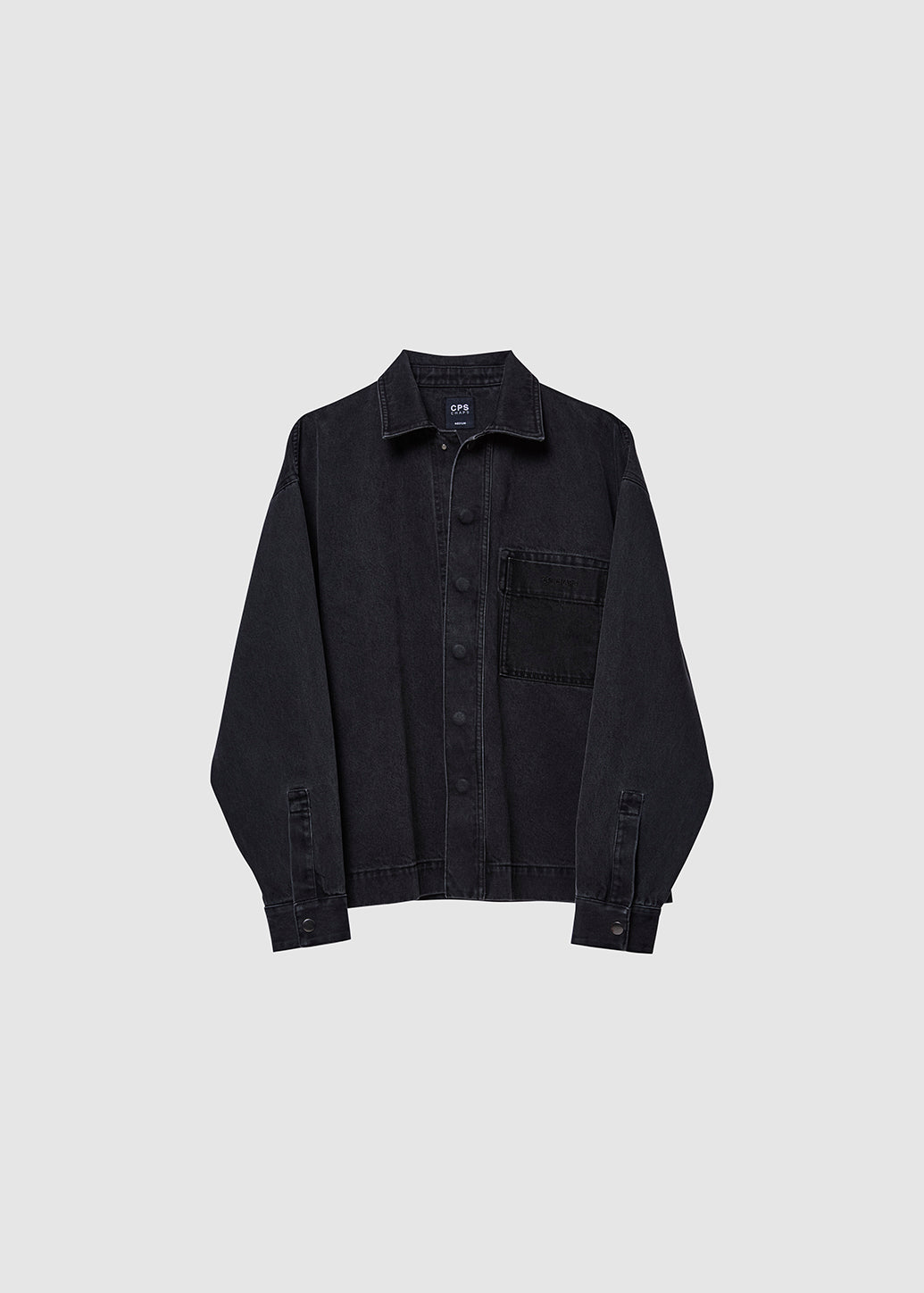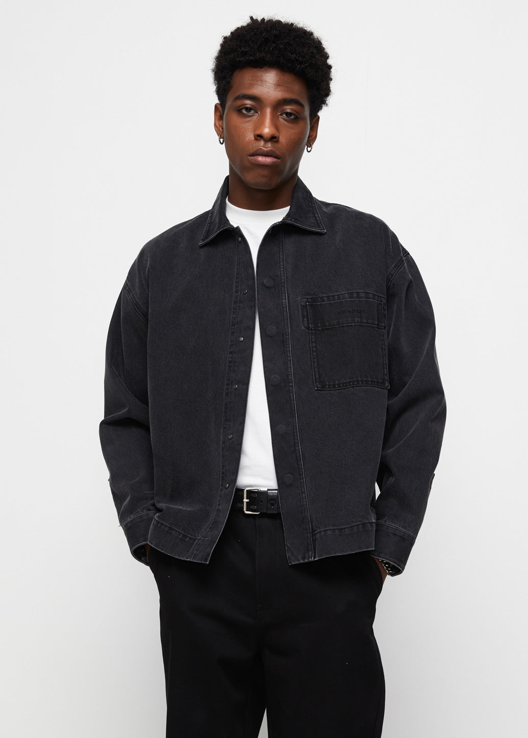 The essential Black Denim Shacket features a classic silhouette with chest pockets. The sleek design is elevated by a subtle, tone-on-tone logo print detail on the pocket. It’s the ultimate piece for instant street style. Wear it solo for an effortless statement or layer it for a guaranteed iconic look.