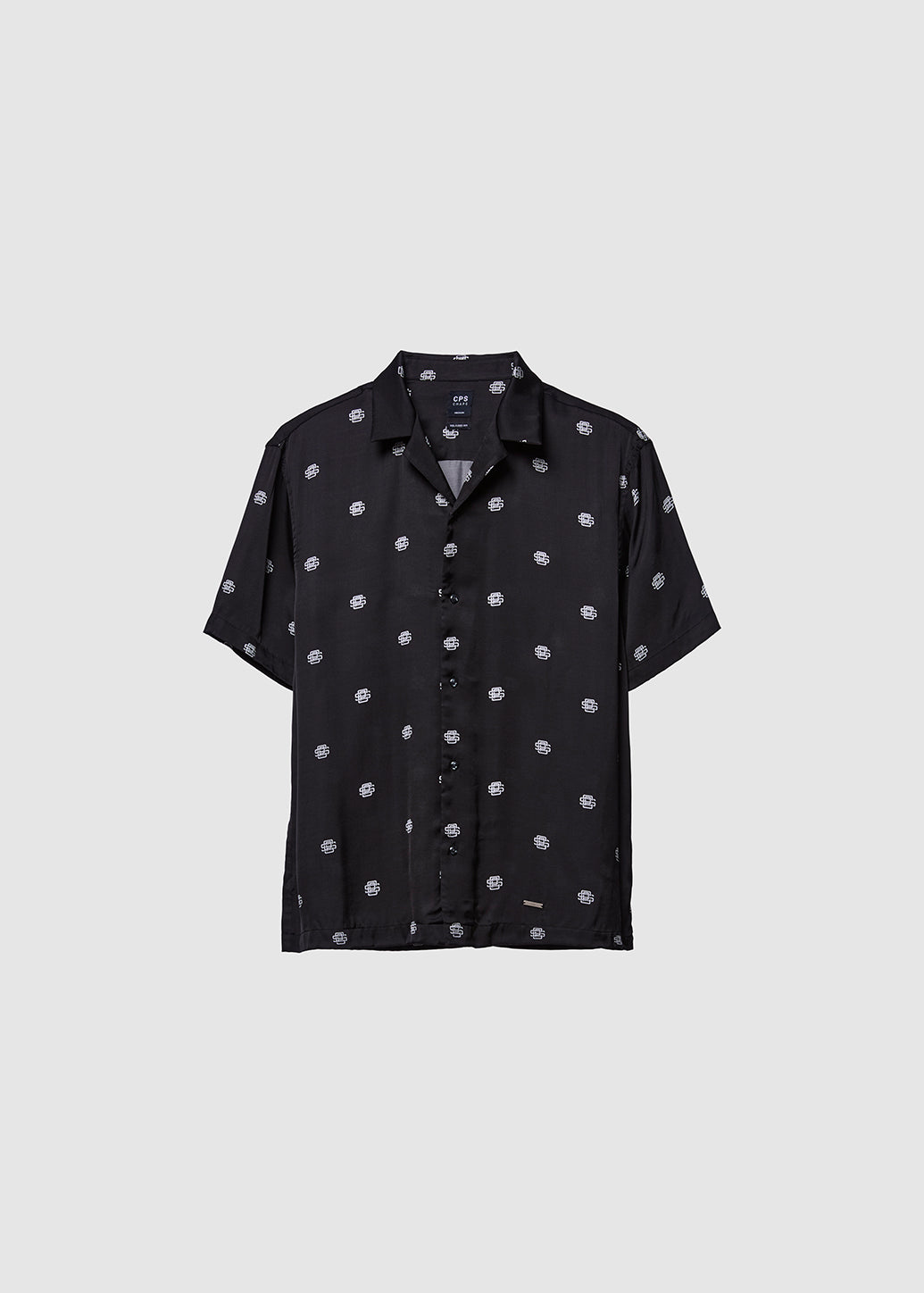 Upgrade your look with modern cool. This black short-sleeve hawai shirt makes a confident statement with a white monogram logo print. It instantly injects a distinctive modern fashion edge into your wardrobe. Throw it on for a casual look or rock it for a cool party vibe.
