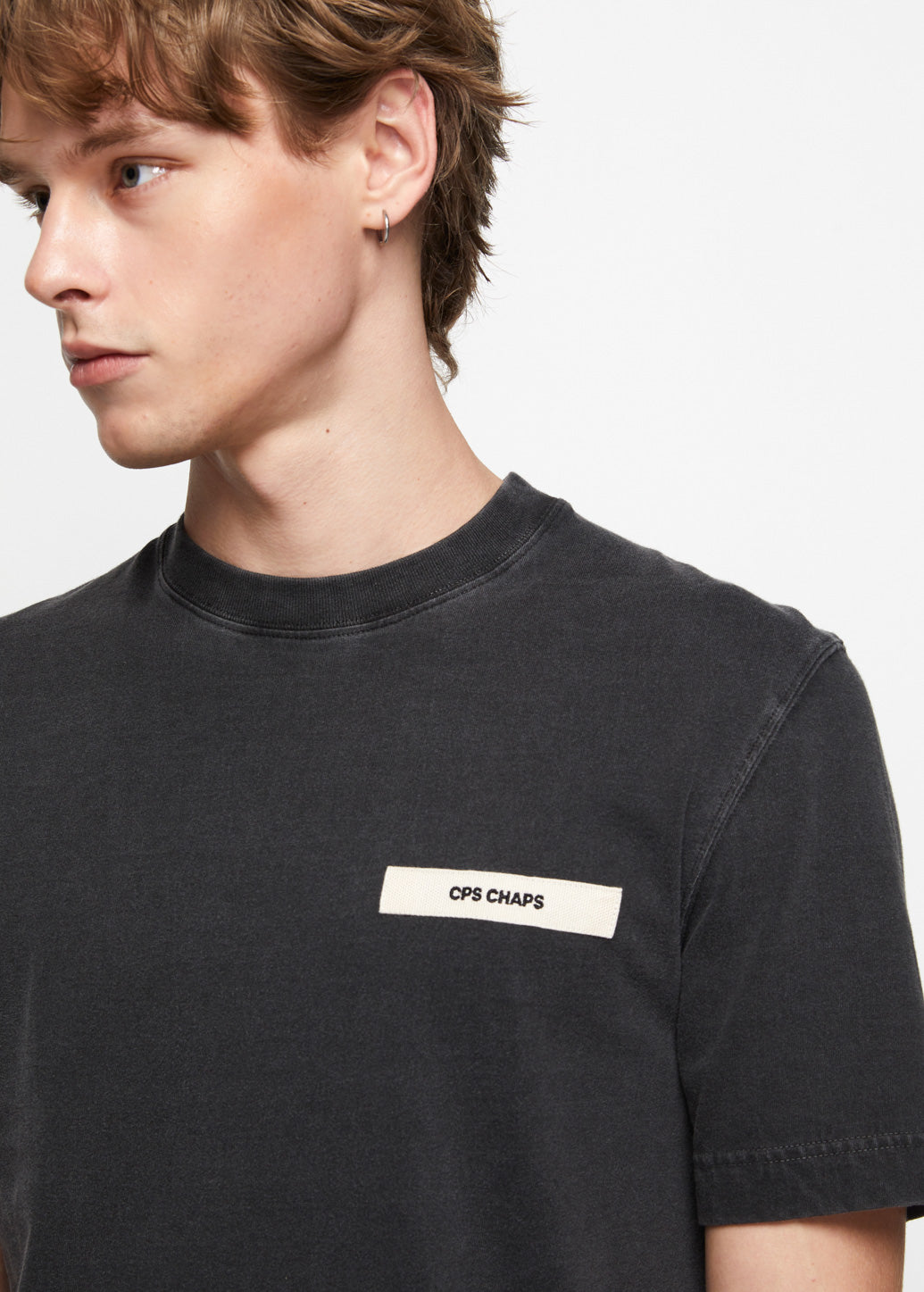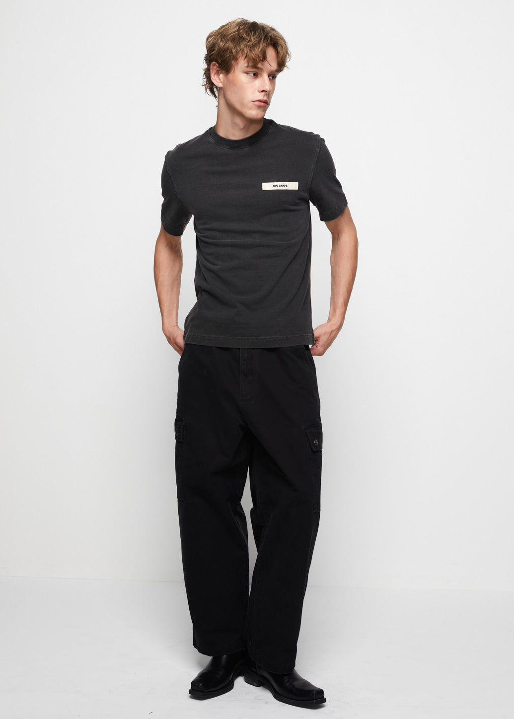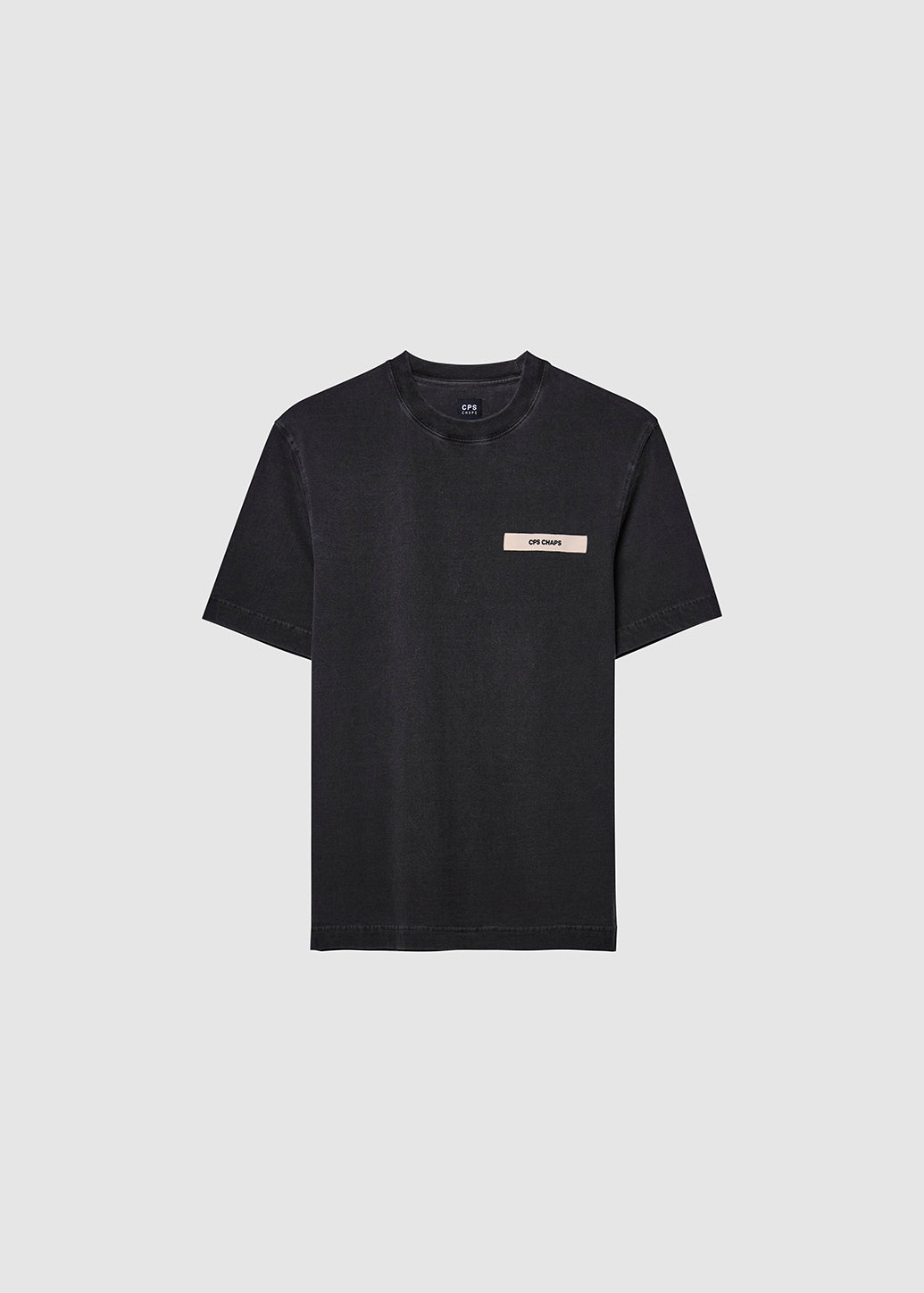 Black short-sleeve fitted T-shirt featuring a logo patch detail on the chest. Designed with a minimal yet stylish touch, it pairs effortlessly with jeans or cargo pants for a modern street-style look.