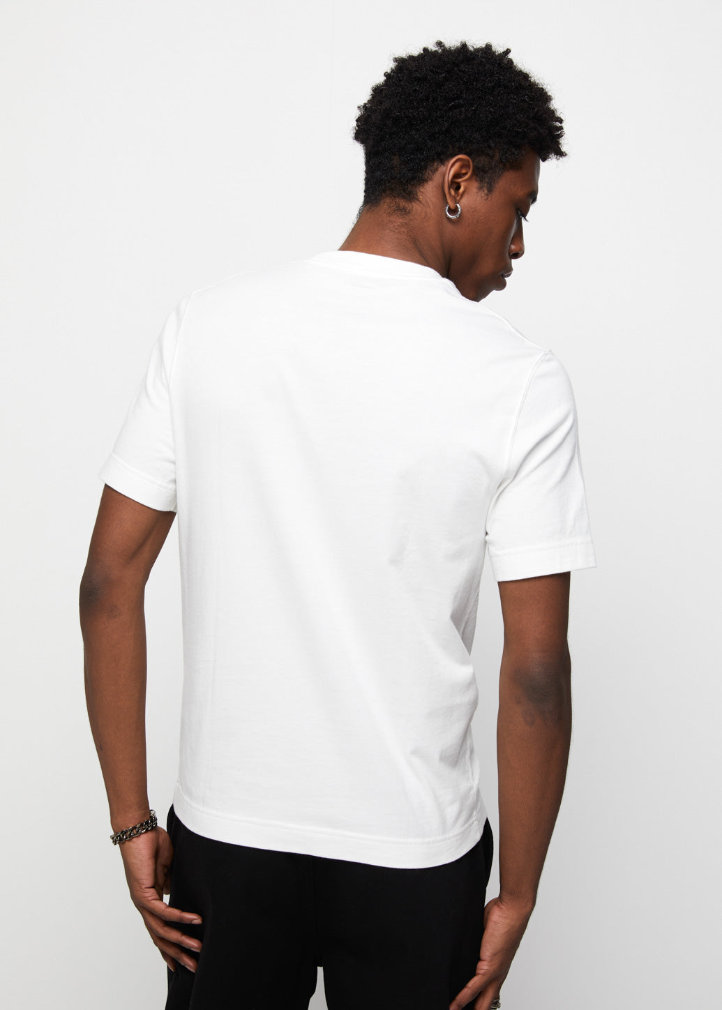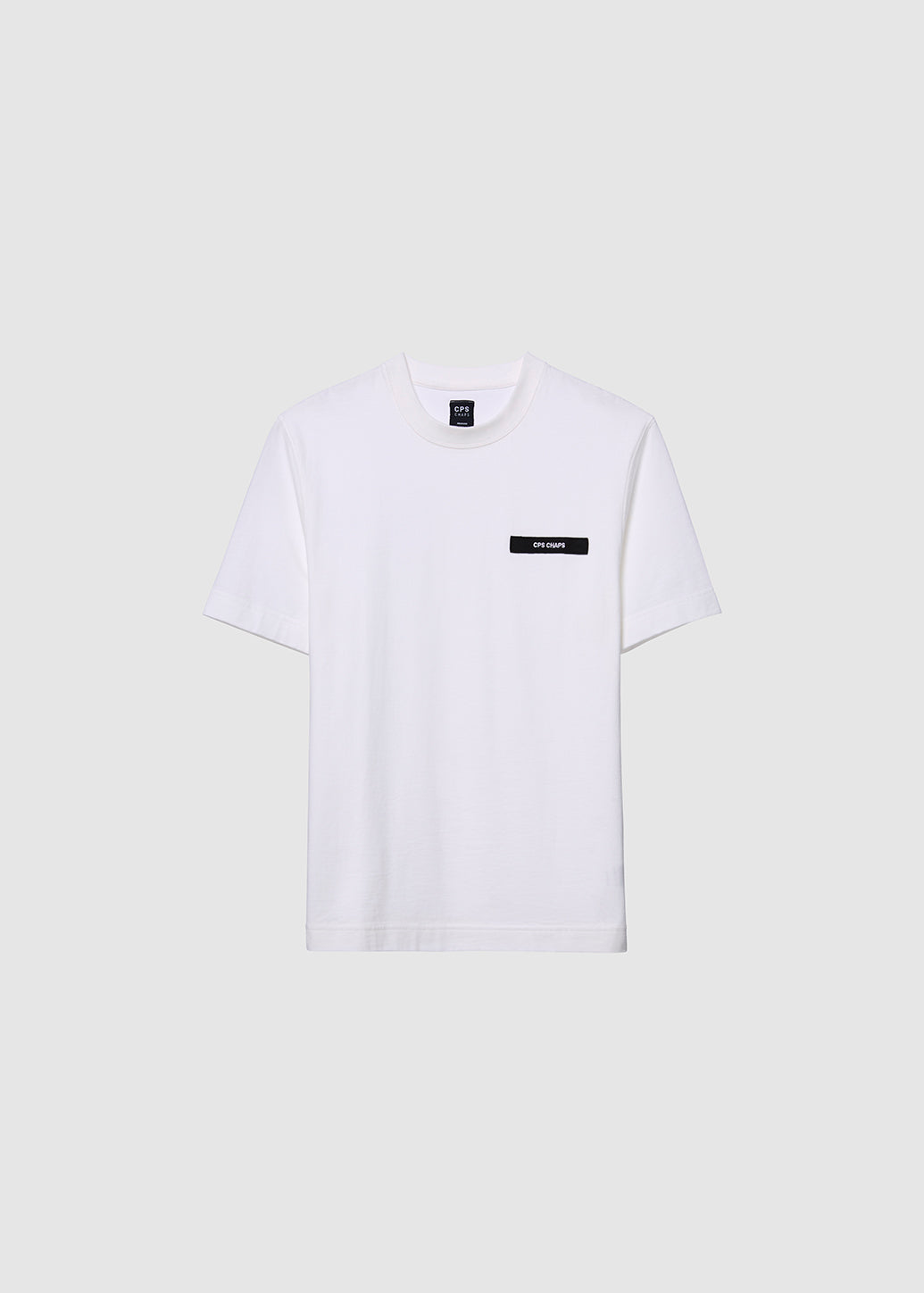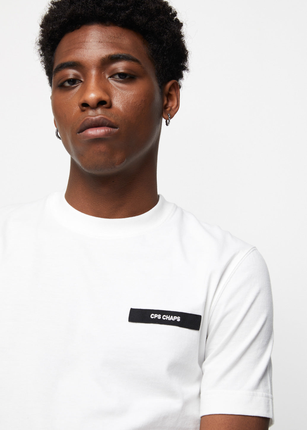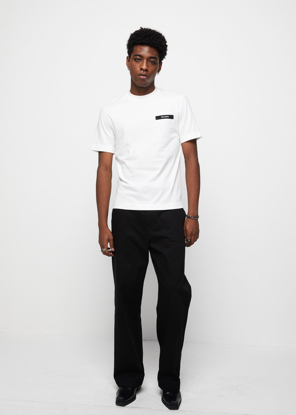 White short-sleeve fitted T-shirt featuring an embroidered logo patch on the chest. Adds a stylish minimal touch to casual looks, easily pairing with jeans or cargo pants for a versatile street-style vibe.