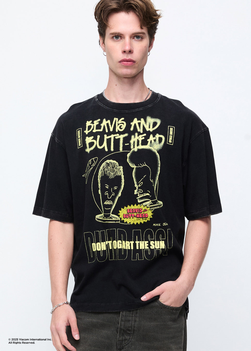 This unisex T-shirt features a statement graphic of the ultimate teen troublemakers, Beavis and Butt-Head, channeling serious old-school vintage vibes. The subtle distressed/ripped detailing adds a raw, rebellious finish. Throw it on with jeans or layer it under your favorite jacket—it’s the perfect, standout piece to dominate any street look.