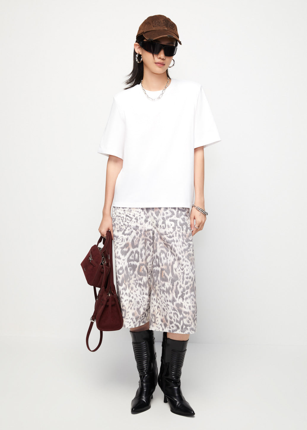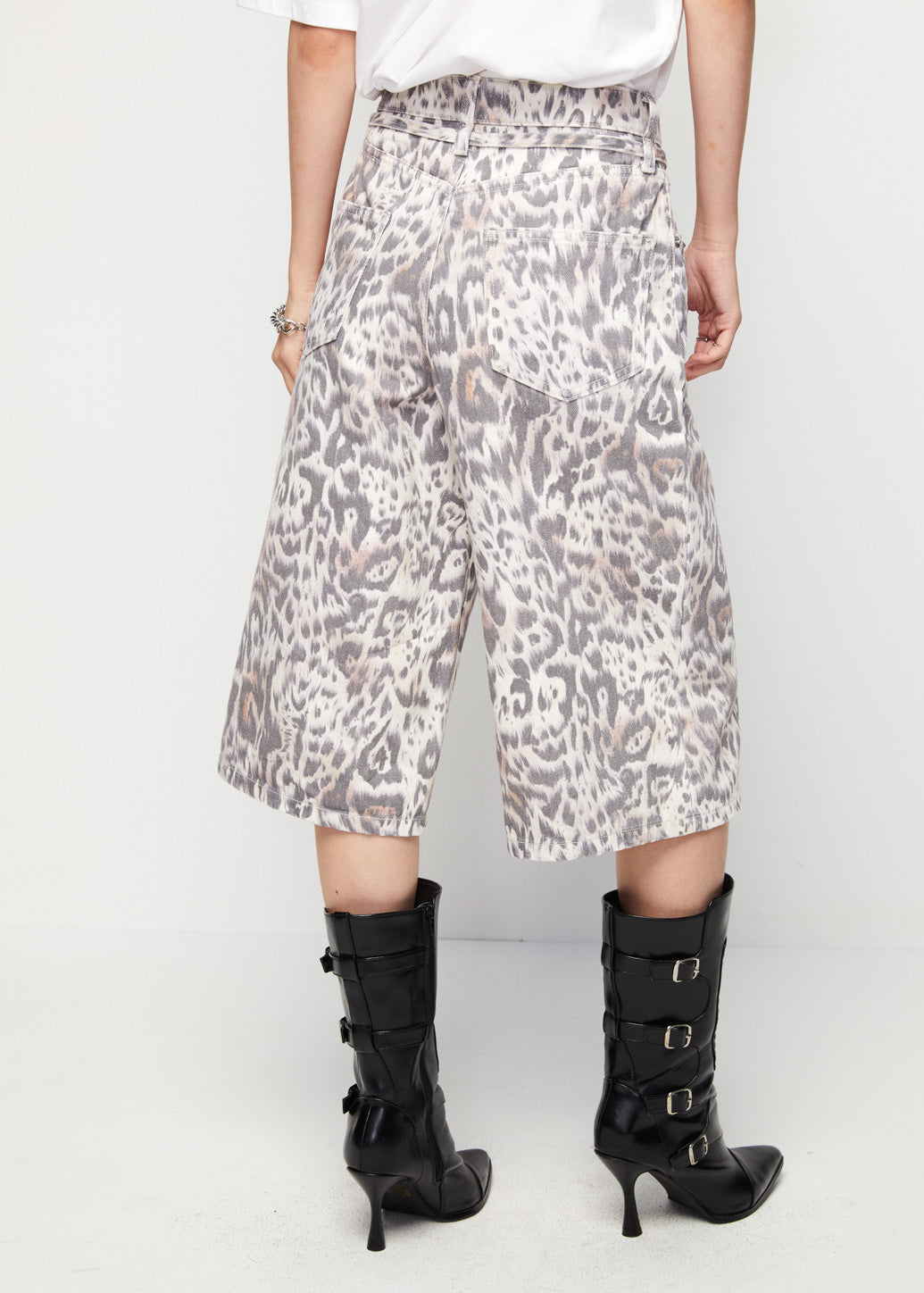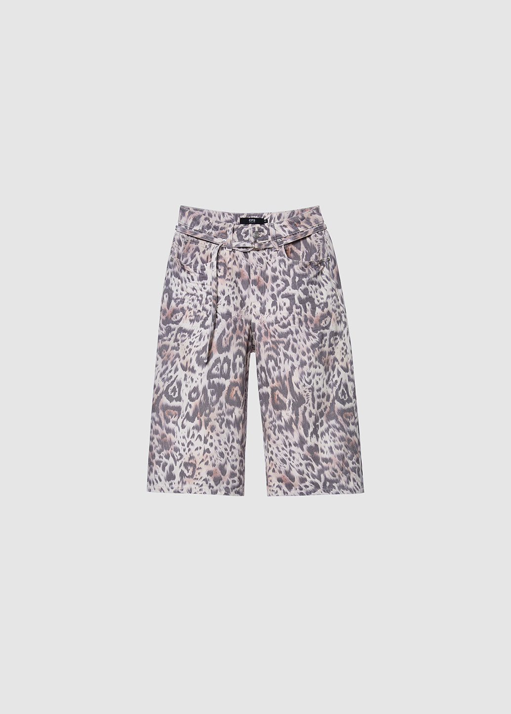 Step into a cool and confident look with our modern straight-cut jorts. They stand out with a bold leopard print and a matching thin belt. The shorts exude an edgy and raw aesthetic that can be matched with a variety of tops to create a casual utility look.