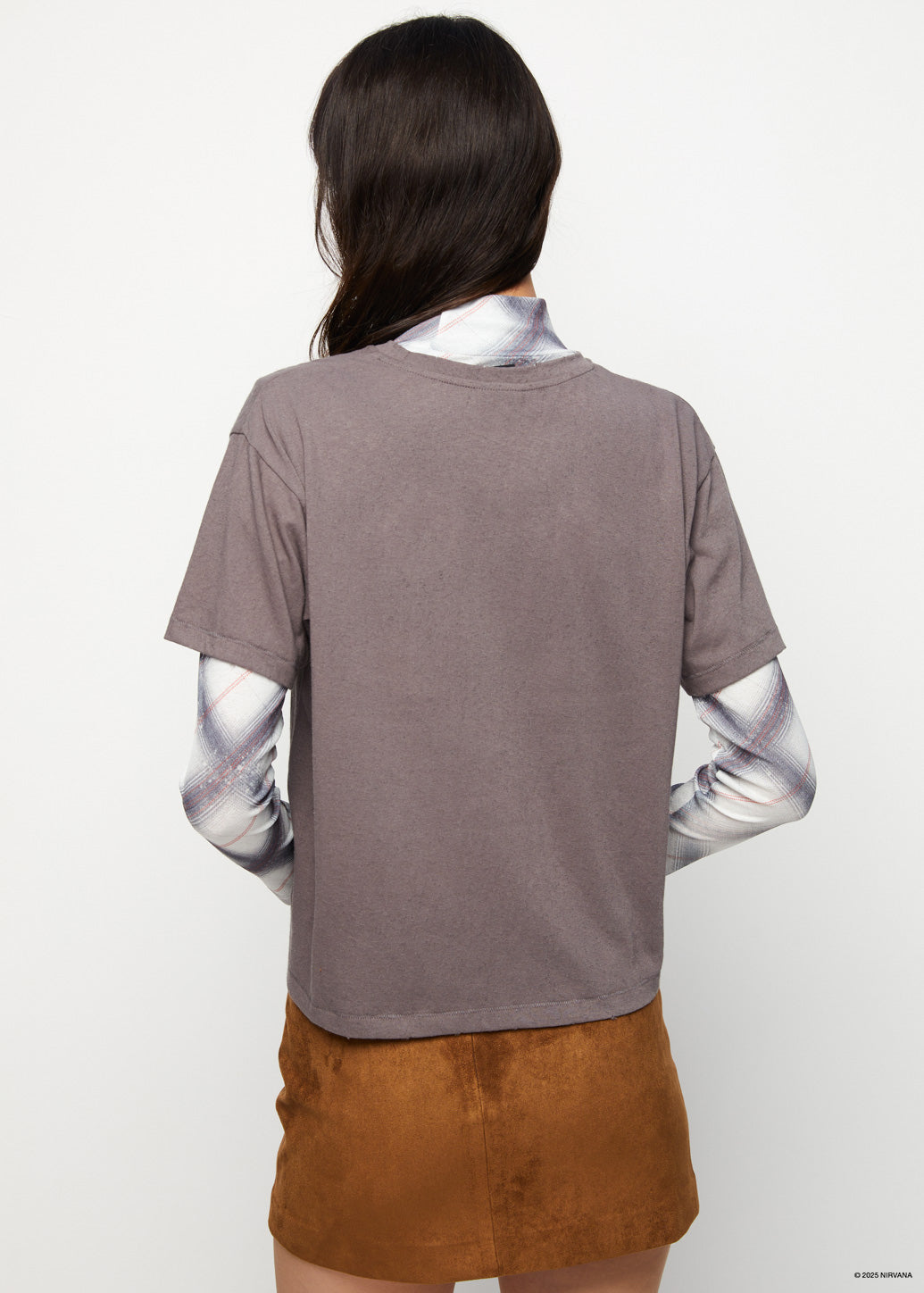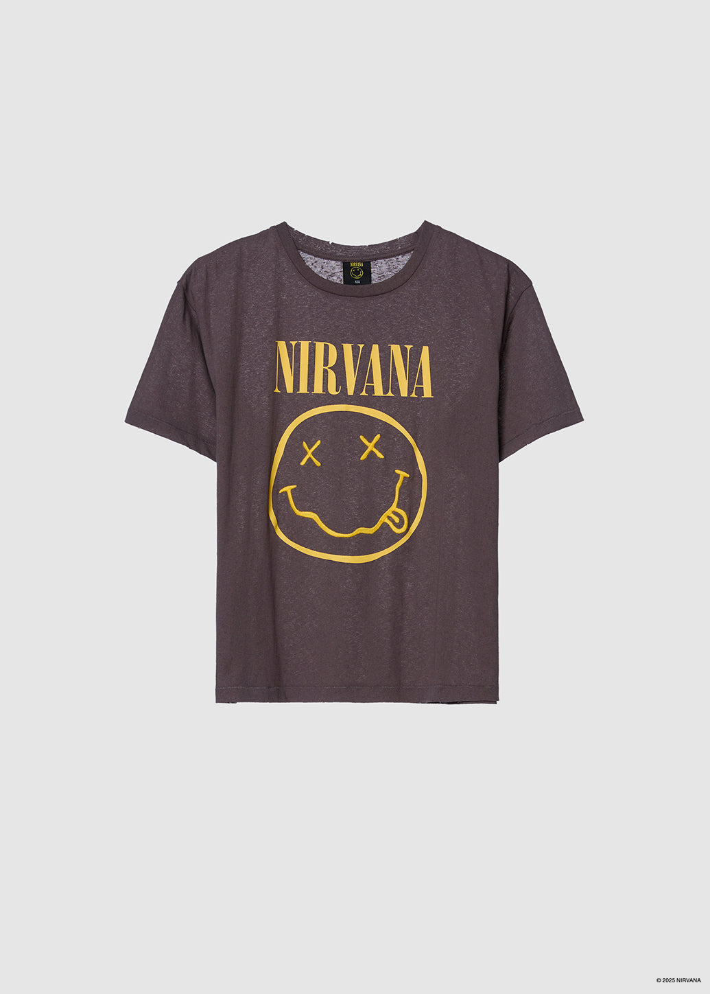 Black short-sleeve T-shirt featuring Nirvana’s iconic yellow smiley face graphic. Finished with a raw-cut hem for a rugged edge, it pairs perfectly with jeans to complete a standout street-style casual look.