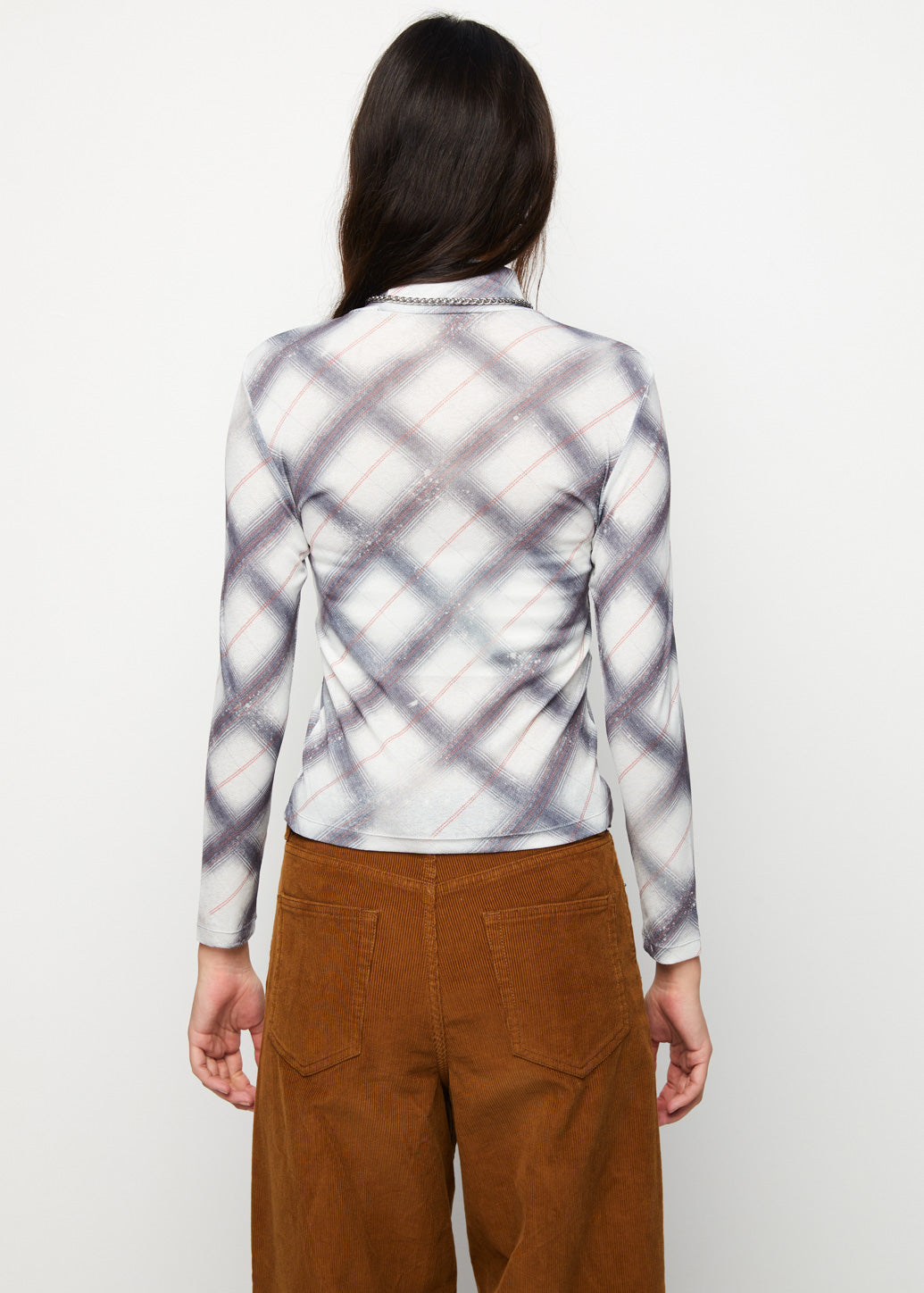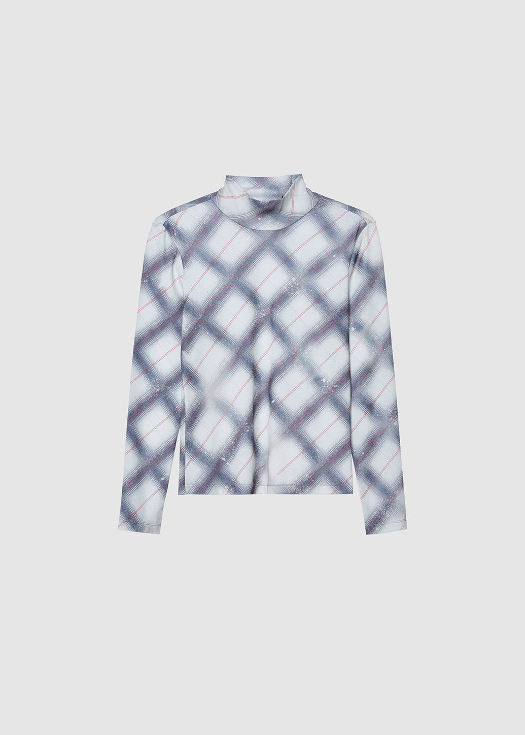 Create a stylish winter look with this long-sleeve shirt featuring a simple design highlighted by a checked print. The mock neck adds a subtle and sleek detail, making it perfect for layering in winter or wearing alone, offering warmth and effortless style.