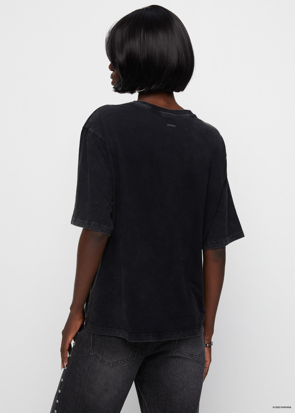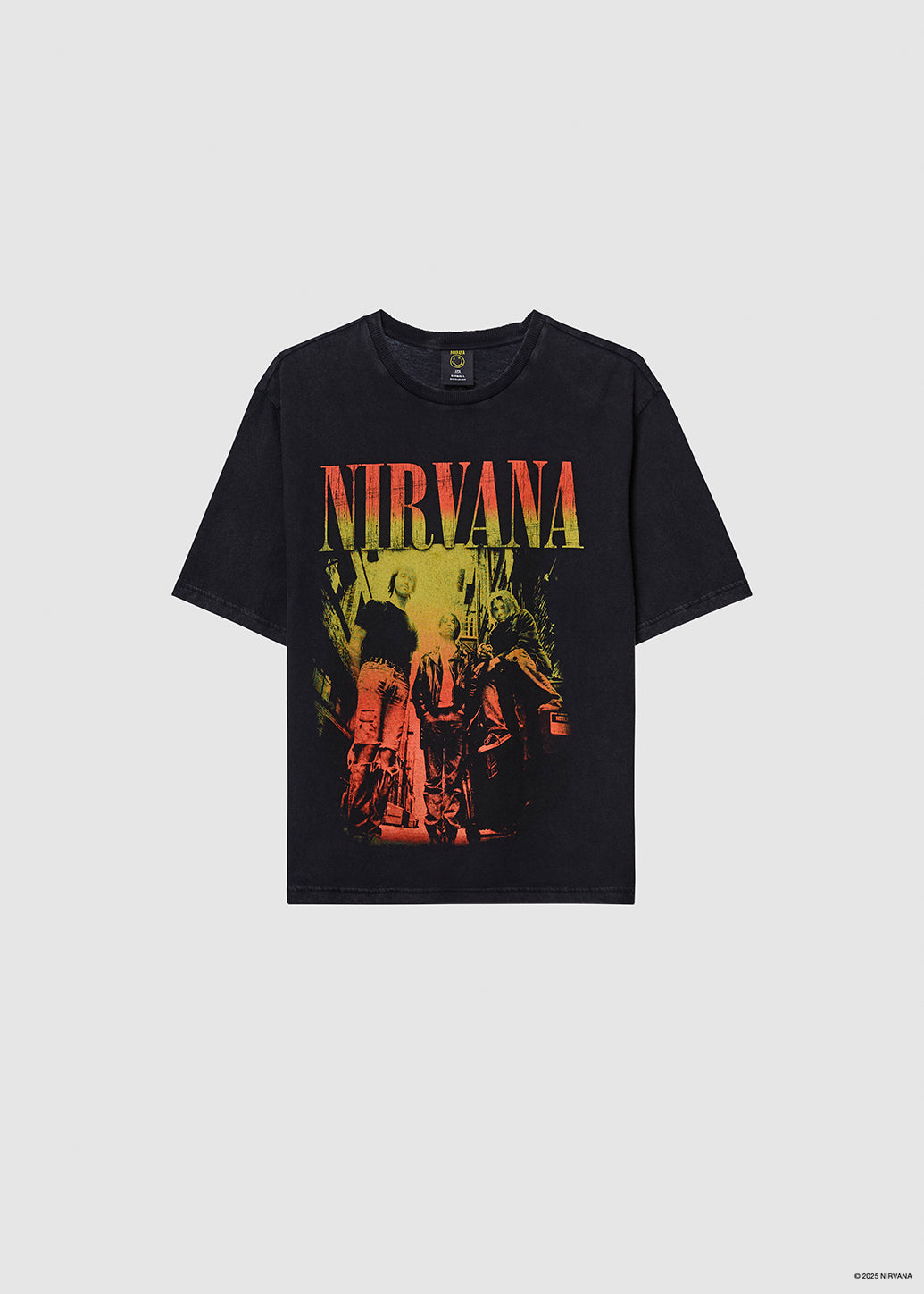 Back to basics with this black t-shirt. The design is elevated by a vibrant Nirvana rock band graphic in a cool red and orange tone, with a faded wash that gives it a vintage aesthetic. This tee is a perfect way to express your confident style and is a timeless piece for any street fashion look.