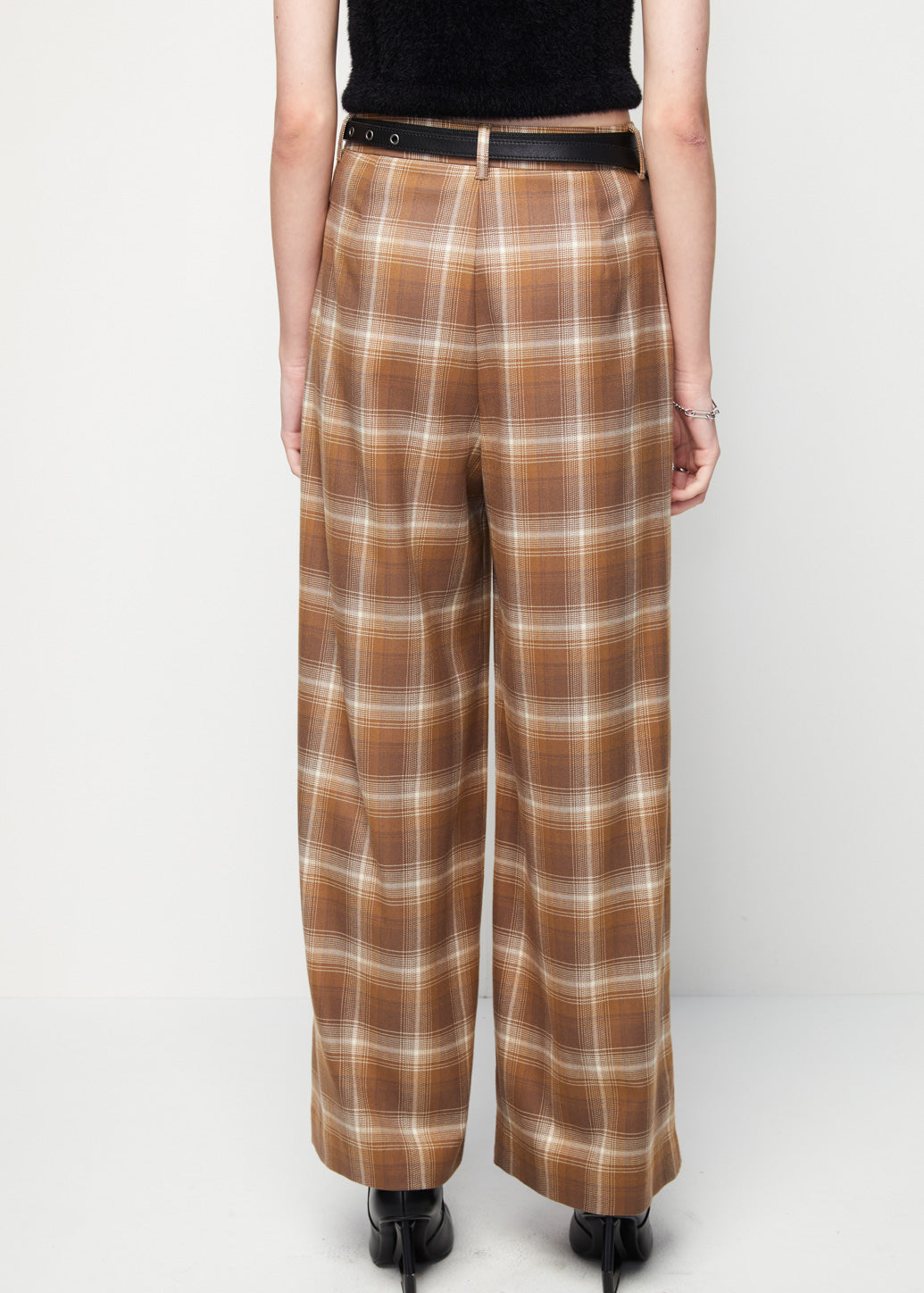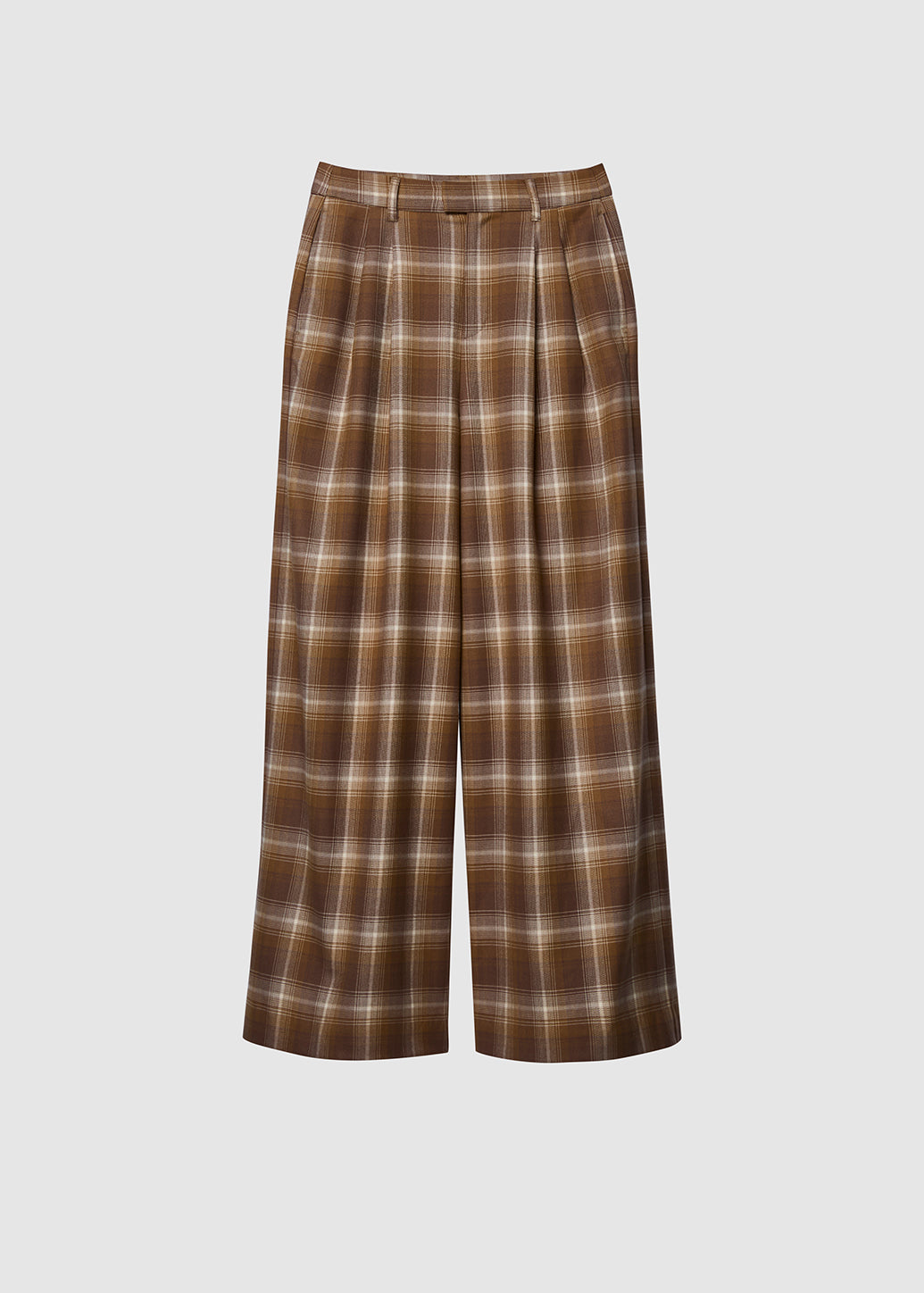 Update your winter style with a checked pleated pants. Designed in warm brown tones perfect for the season, it pairs effortlessly with a sweater to create a refined American preppy look with timeless elegance.