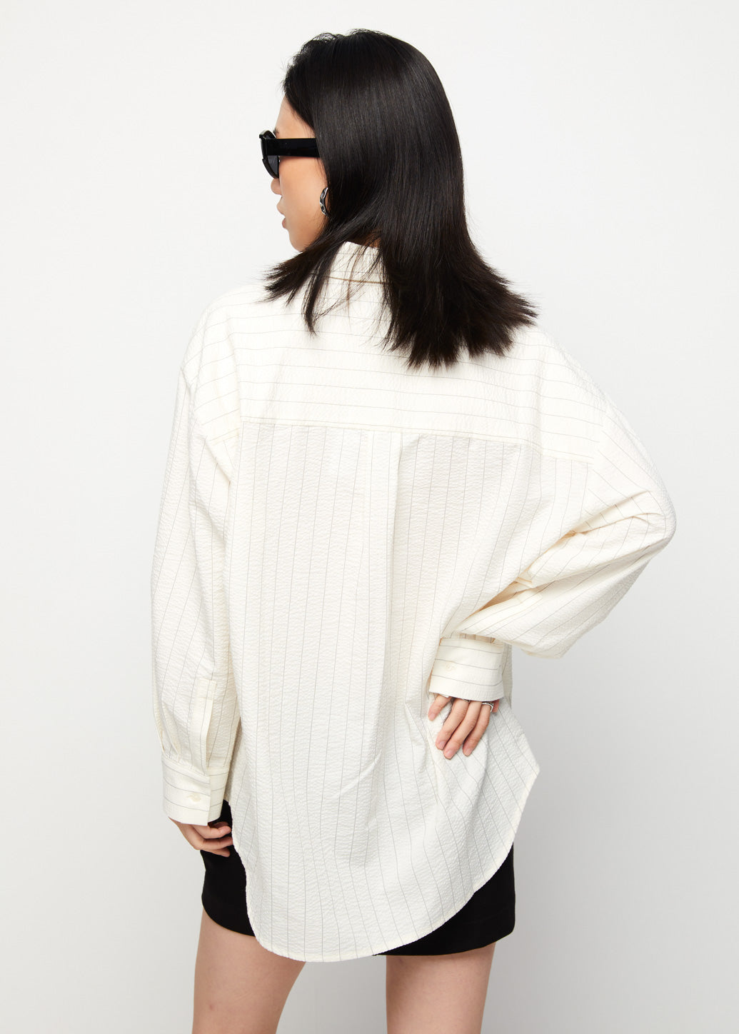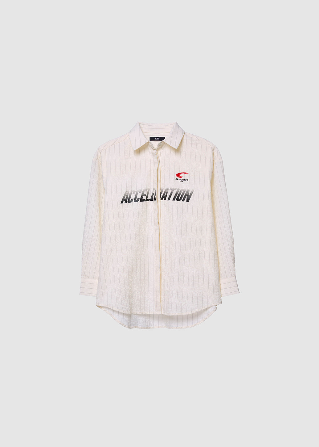Elevate your sporty look with our lightweight seersucker oversized shirt. It stands out with a unique, gradient-colored 'ACCELERATION' graphic that conveys power, speed, and cool racing energy. The oversized design adds a street flair that reflects limitless cool style.