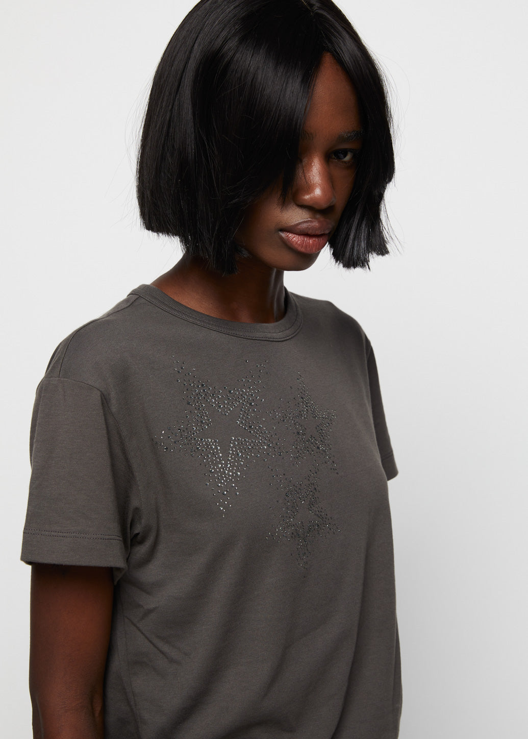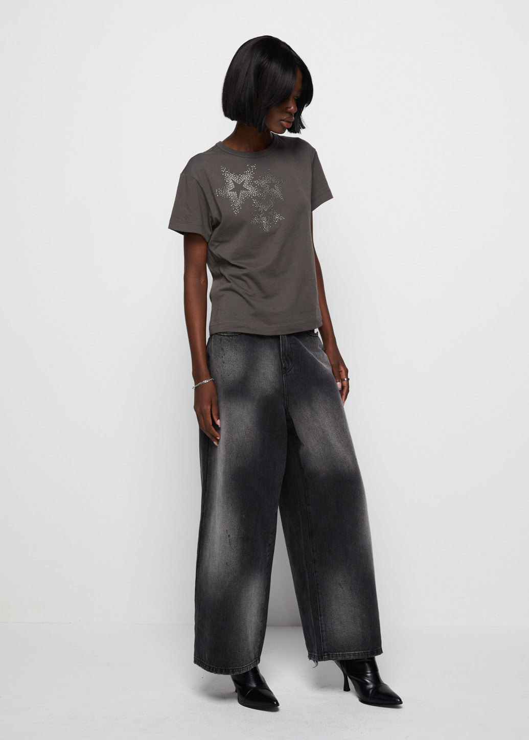 Create a chic casual look with this relaxed-fit, washed T-shirt, featuring a star graphic print embellished with sparkling rhinestone studs for a party-ready vibe. Pair it with jeans or a skirt to elevate your style with a touch of glam, making your party look effortlessly standout.