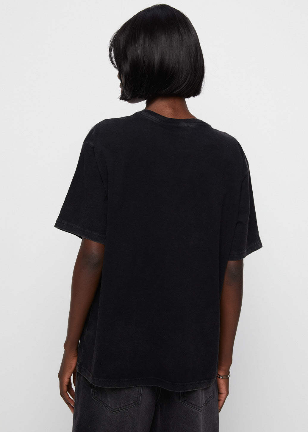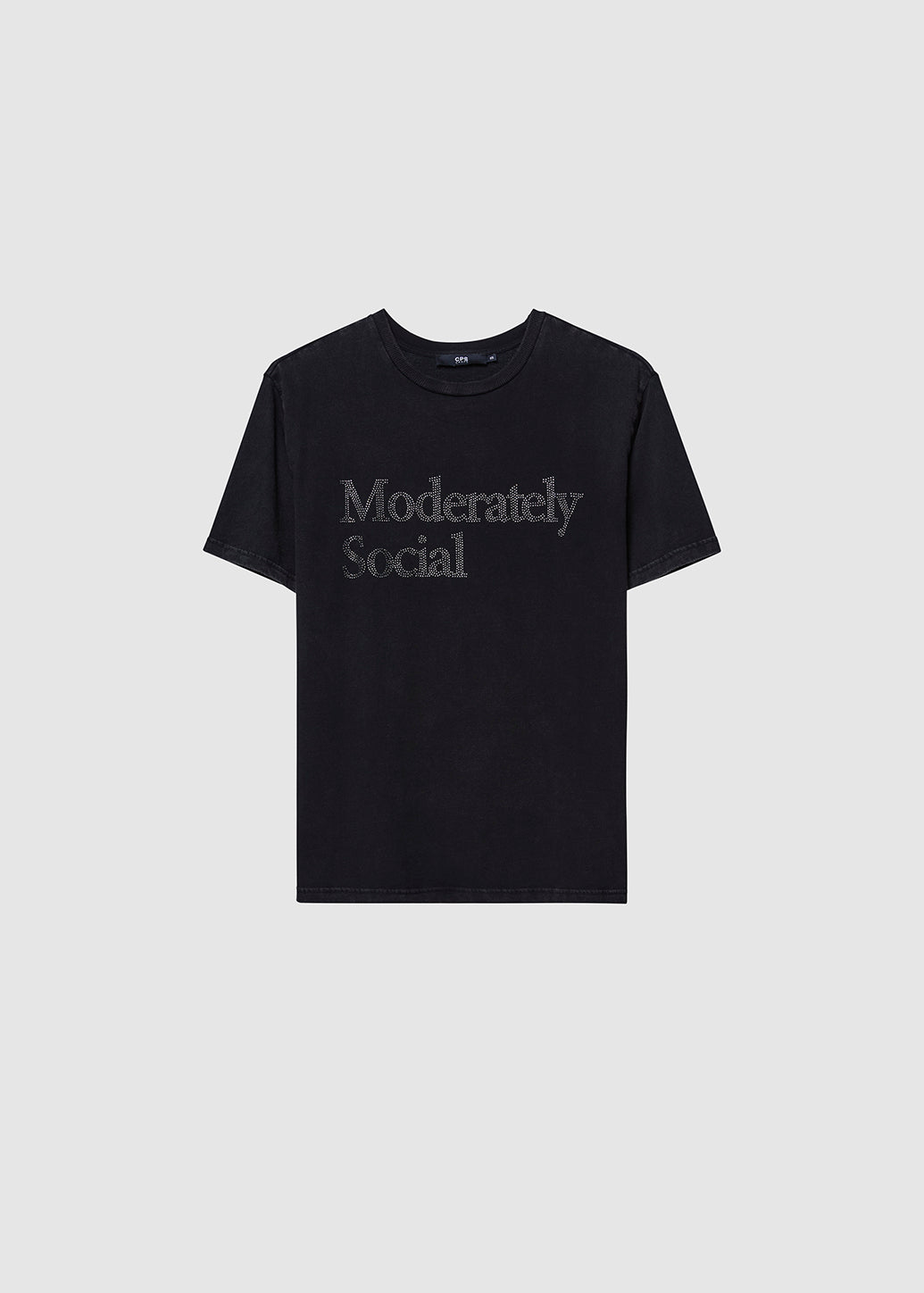 An oversized t-shirt comes with a cool 'Moderately social' graphic and a modern oversized fit. This tee is an ideal choice for pairing with wide-leg jeans, ensuring your look is both unique and stylish for any occasion.