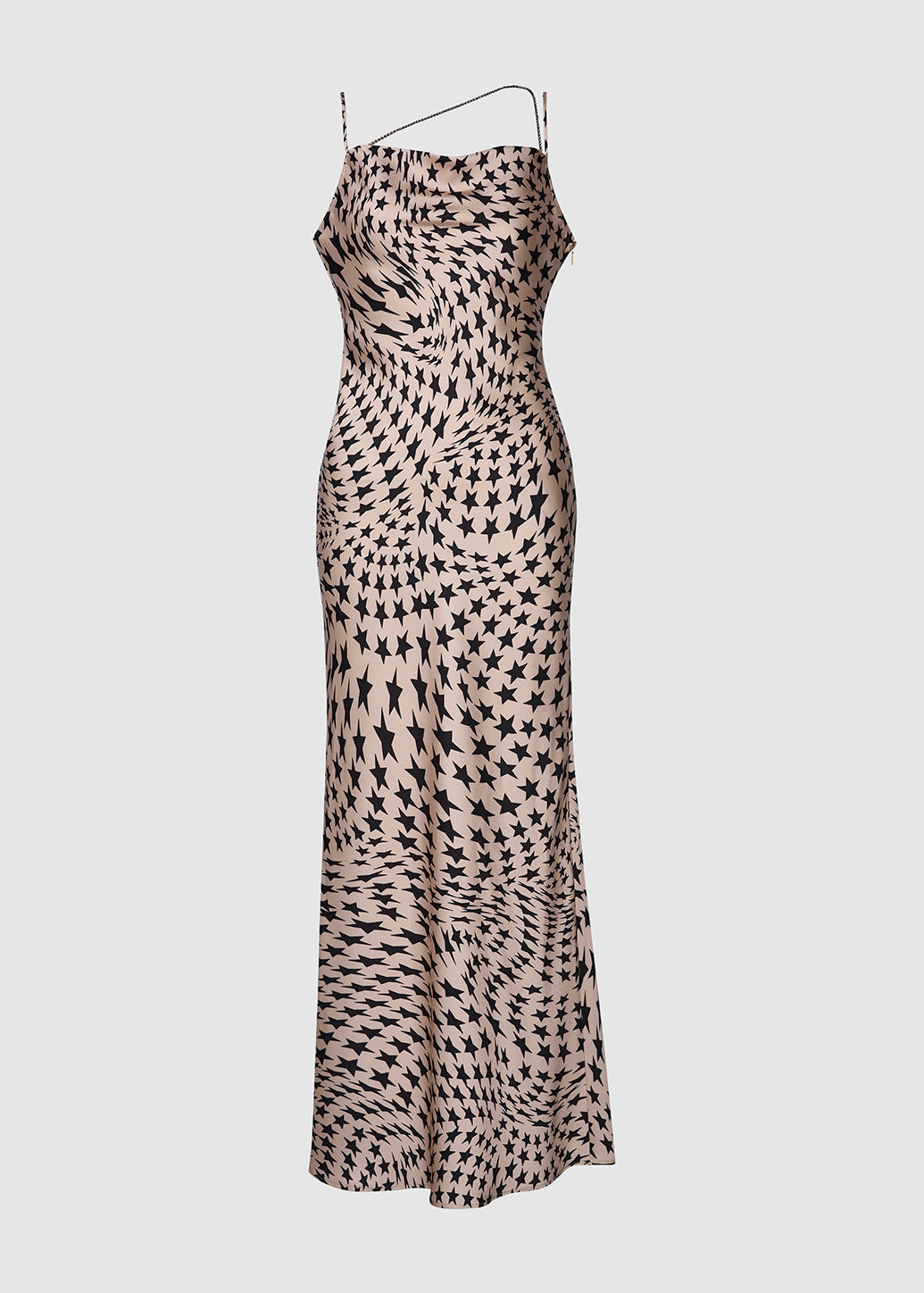 Abstract star-print maxi dress featuring delicate spaghetti straps and a crisscross strap back adorned with rhinestones for a sexy, eye-catching sparkle. Perfect for parties or a night out, it adds a touch of chic and cool style to every occasion.