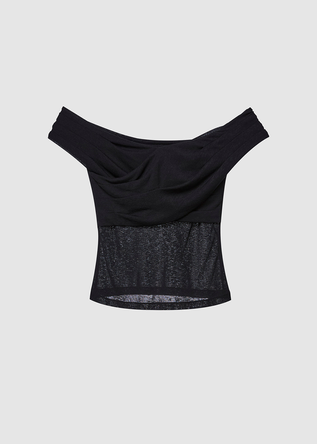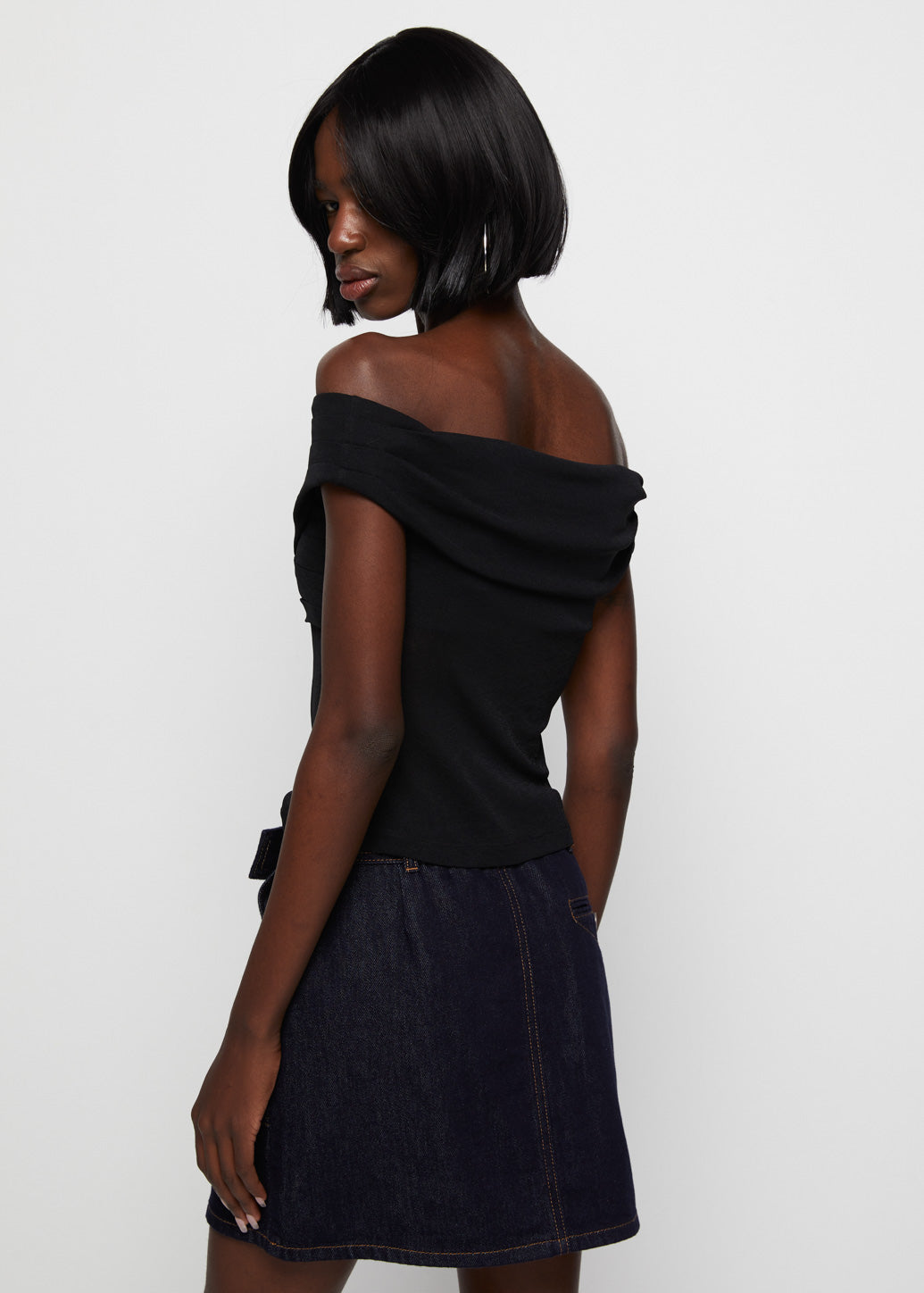 Off-shoulder wrap-front top in a classic black tone, offering a sleek yet subtly sexy look. Pair with a mini skirt or wide-leg jeans, it creates a versatile casual style perfect for effortless day-to-night fashion.