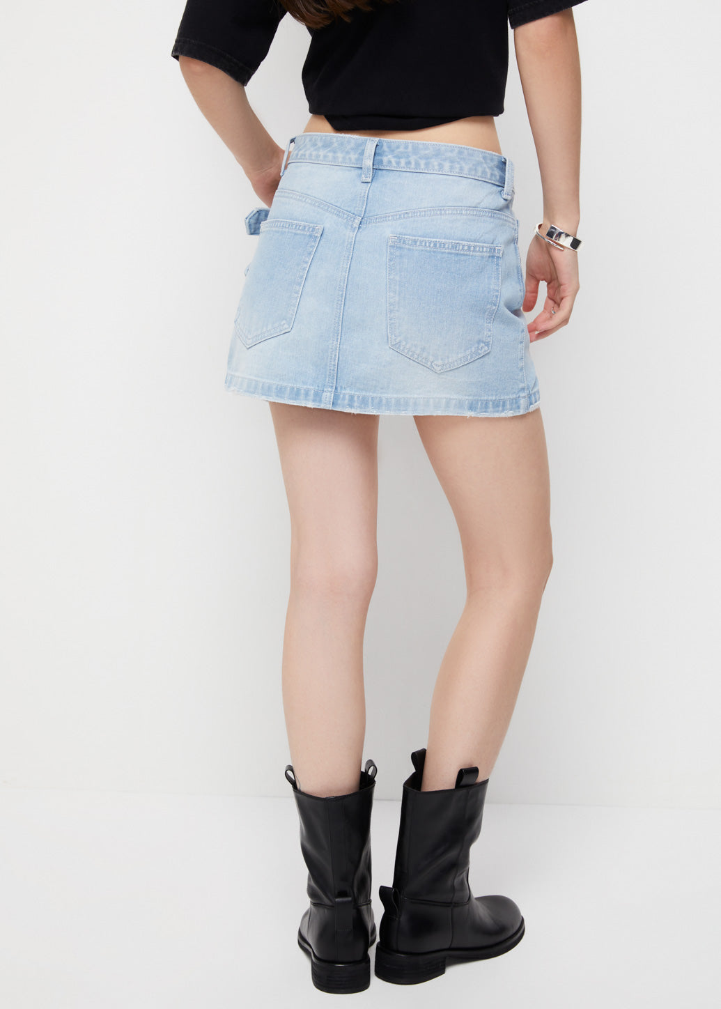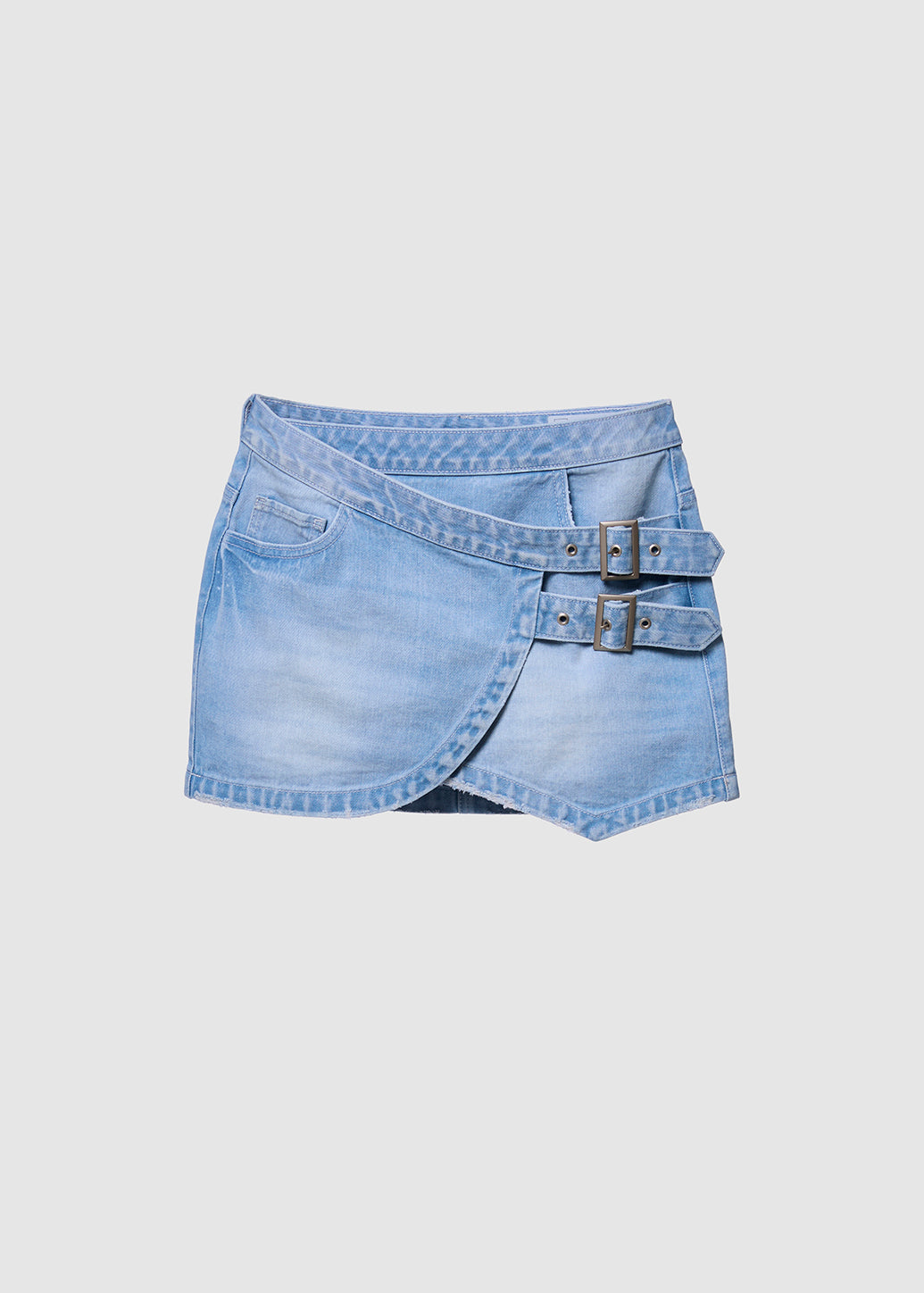 Get wrap denim skirt designed with a double belt detail and washed in a faded finish for a bold, modern edge. Pair it with the studded crop top from the set to elevate your look with effortless style and attitude.