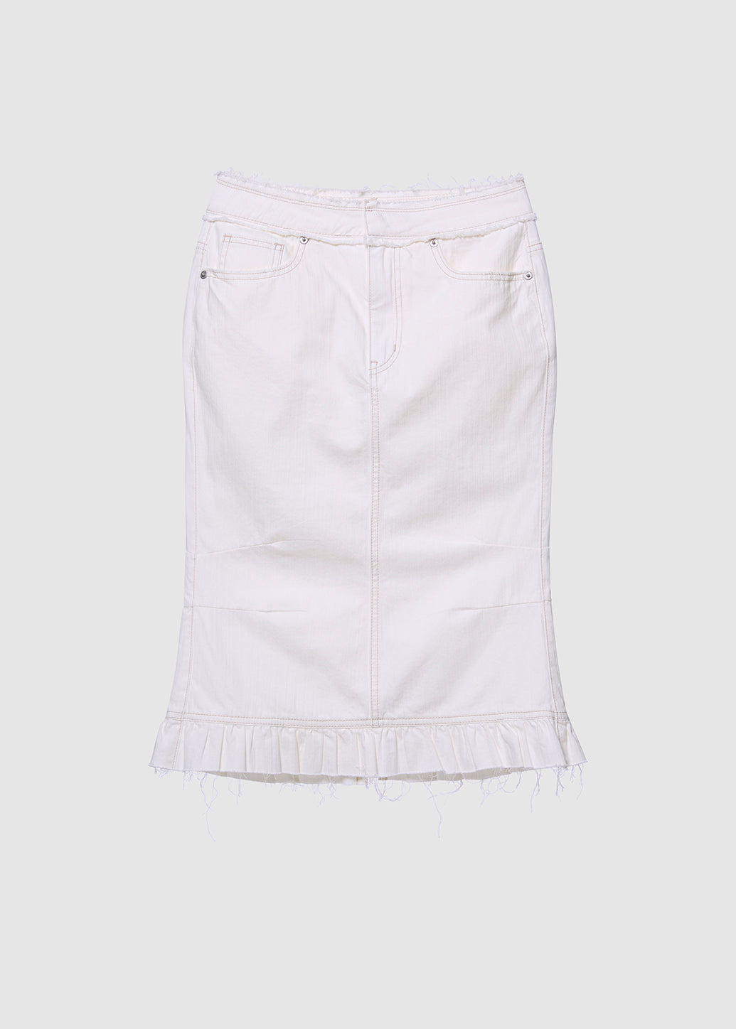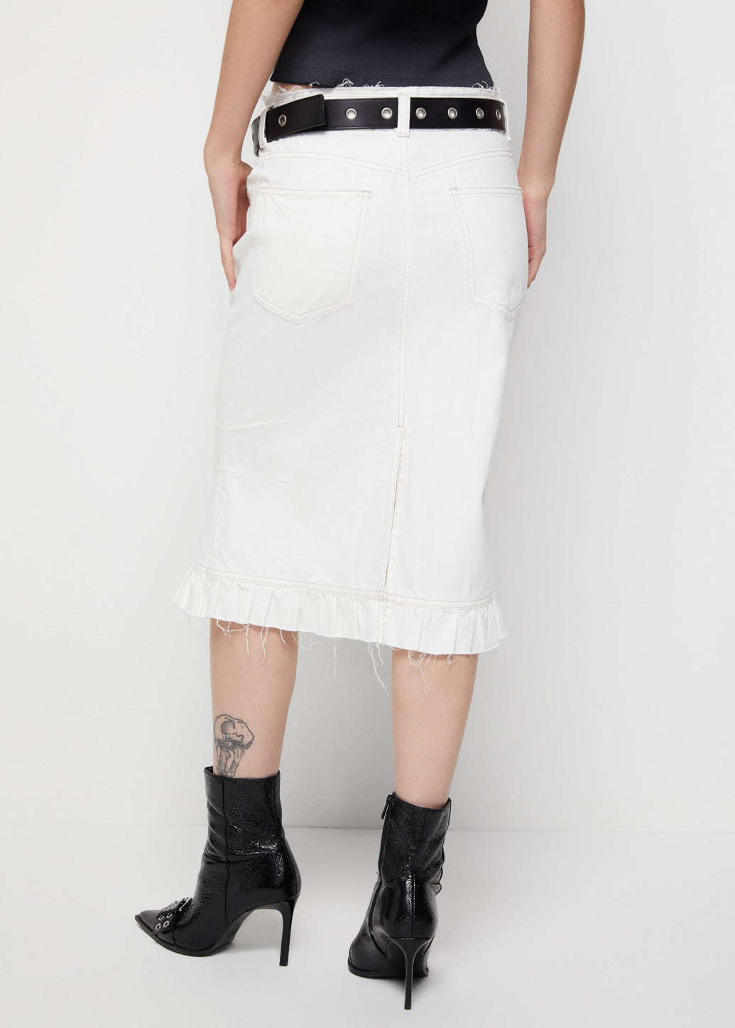 Off-white jeans skirt with a midi length, featuring distressed details at the waistband and subtle ruffles at the hem. A versatile denim piece that pairs effortlessly with different tops, blending edgy style with a feminine touch.
