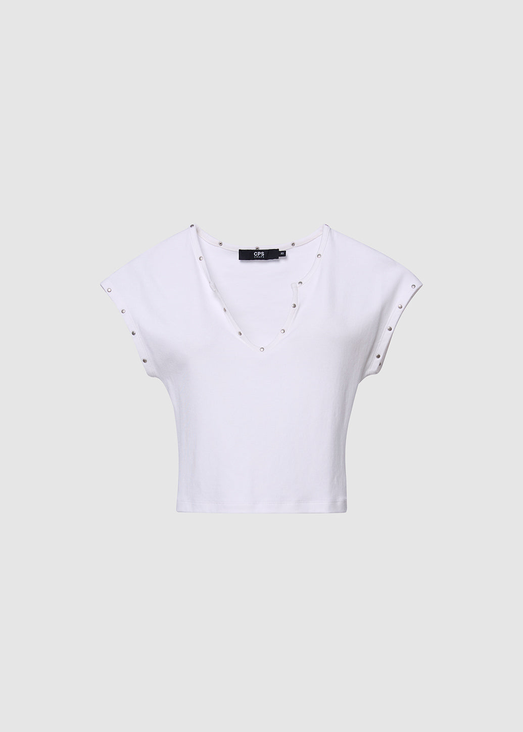 A regular sleeveless top features a bold edge with a deep V-neckline and is finished with studded details along both the neckline and armholes. Cut in a modern cropped silhouette, it pairs effortlessly with denim for a chic casual look that perfectly exudes the signature style of CPS CHAPS.