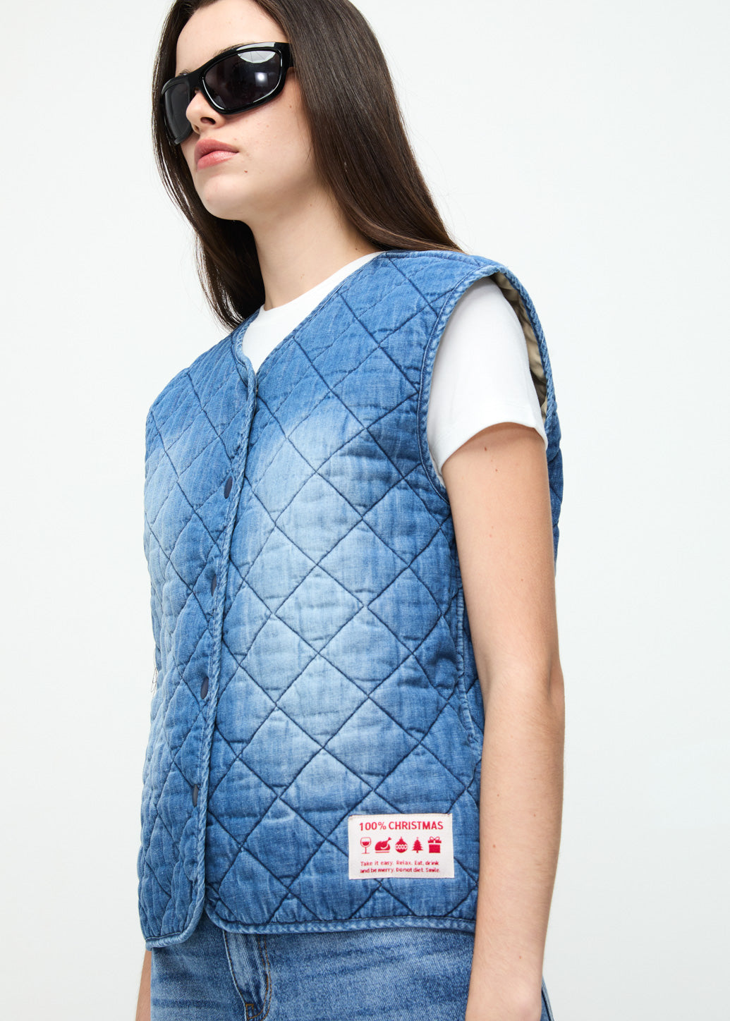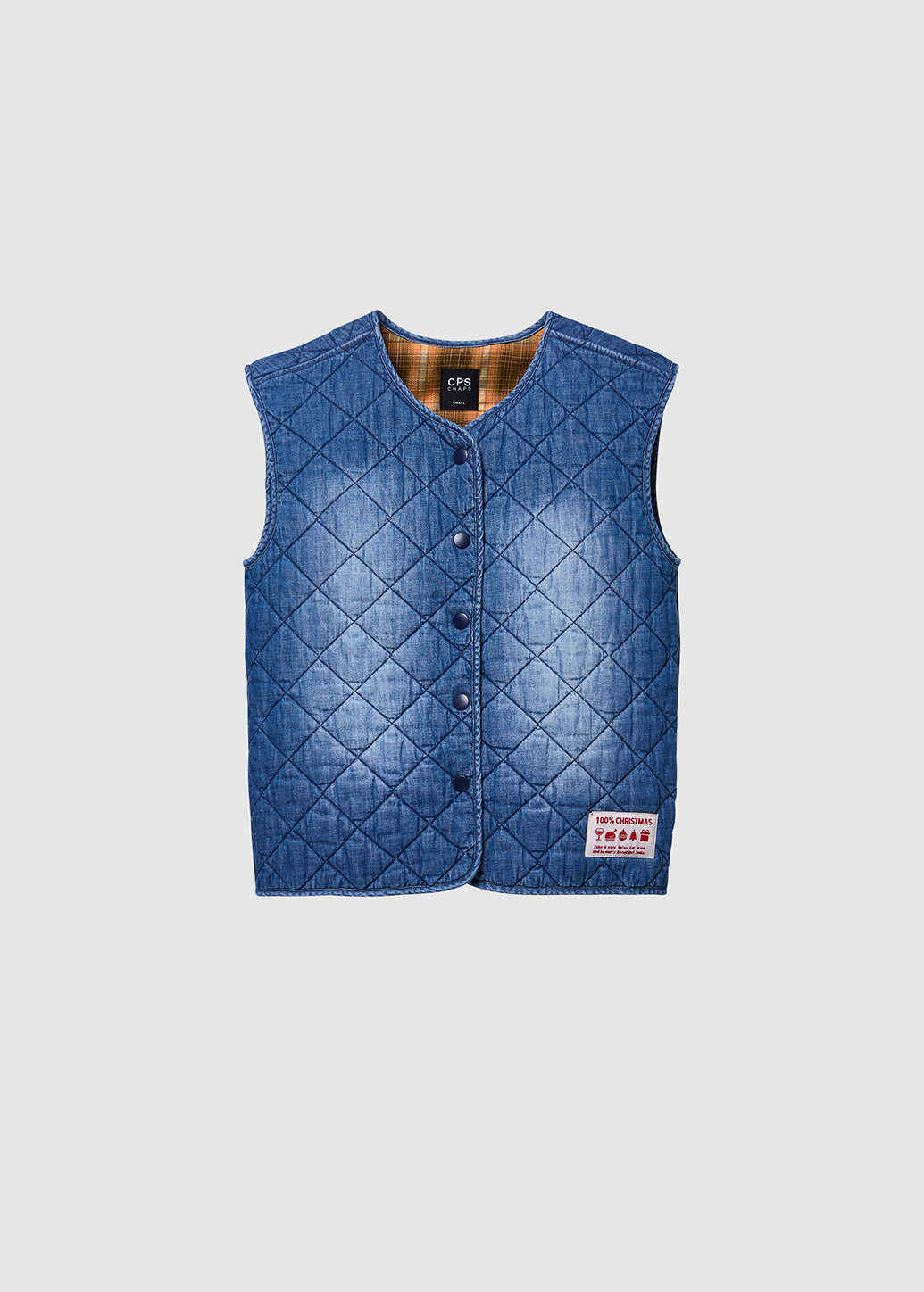 Cool and stylish, this faded denim vest features quilted detailing for a unique texture. Lined with a red checkered pattern perfect for the holiday season, it’s finished with a hem label detail—adding a standout touch to your winter look all day long.