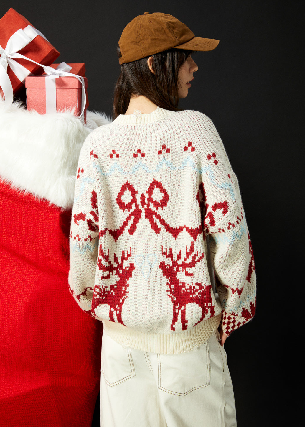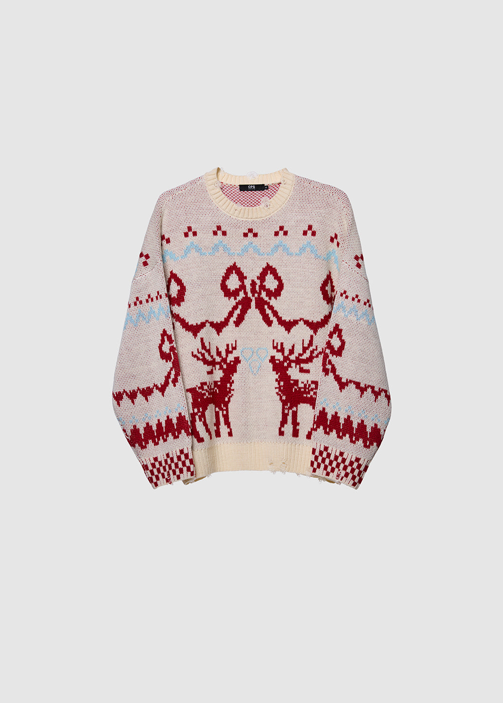 Experience a festive touch to your look with this sweater featuring reindeer and red bow patterns that capture the Christmas spirit. Designed with a raw-cut hem for an edgy vibe, bringing warmth and signature CPS CHAPS style to the season.