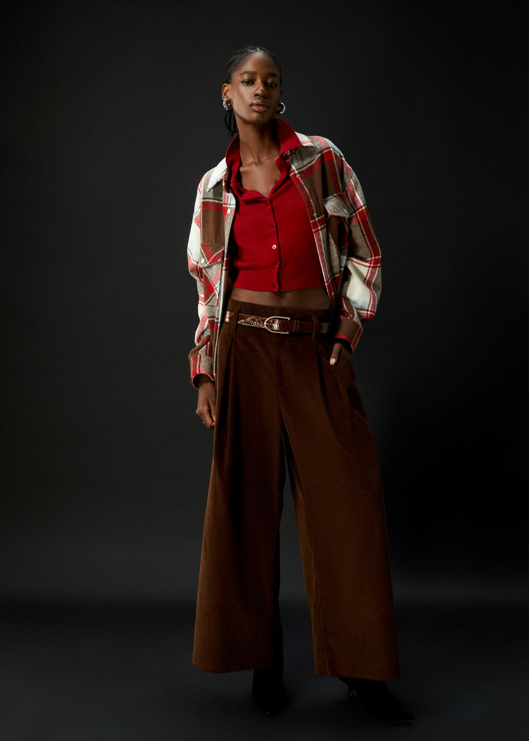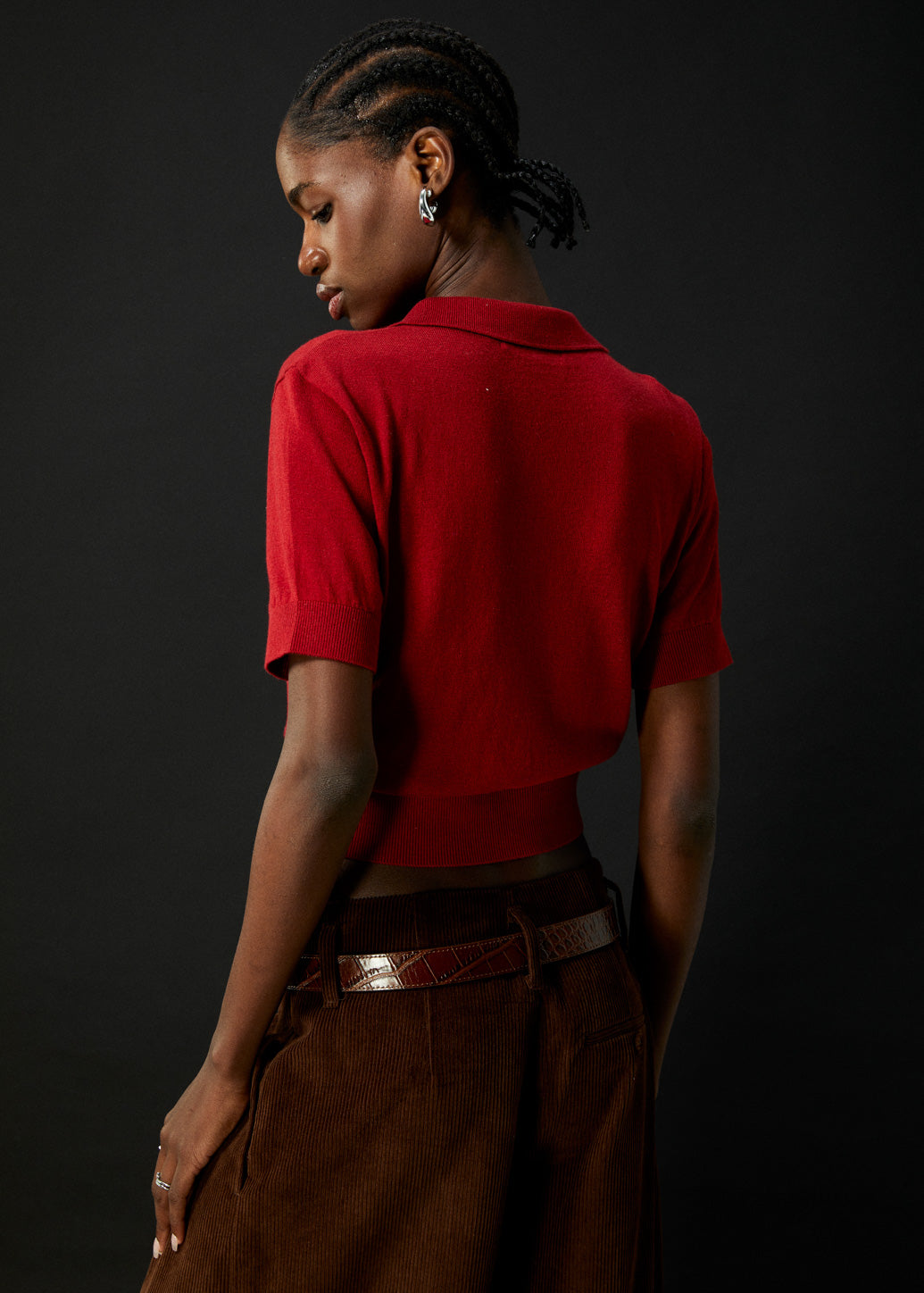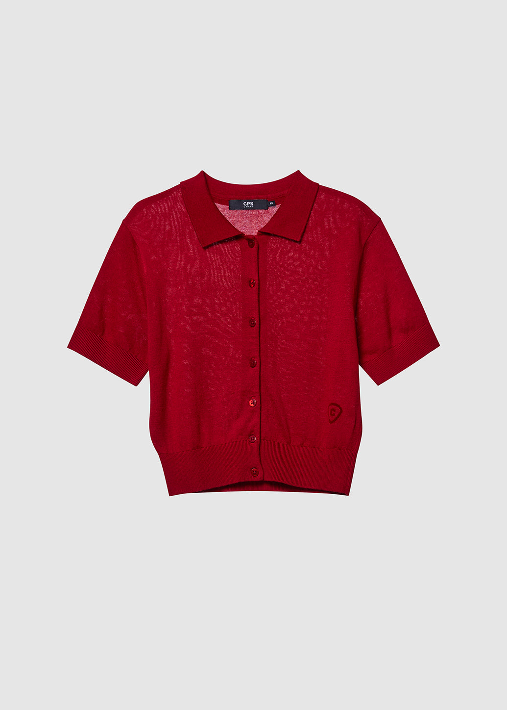 Red short-sleeve polo shirt featuring a full button-down front and a velvet-printed guitar pick logo near the hem. A perfect blend of classic and edgy, it captures the unique signature style of CPS CHAPS.