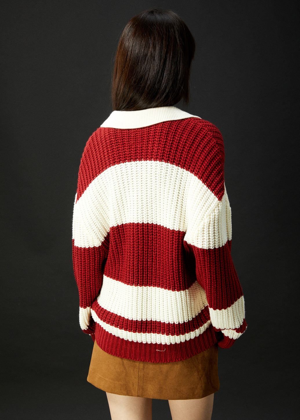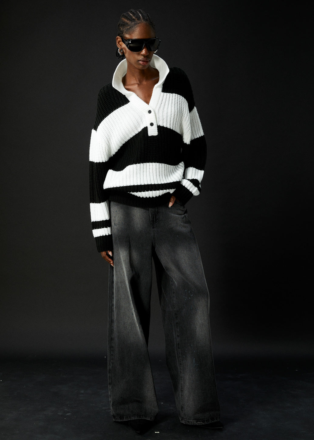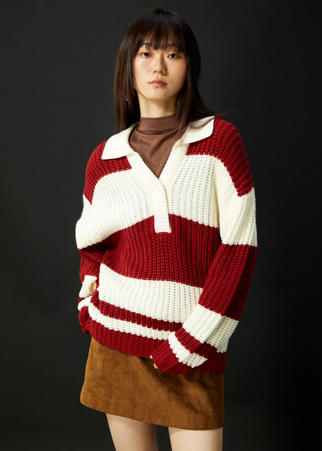 Elevate your casual look with this oversized knit top, inspired by the classic rugby polo. Featuring timeless stripes and a deep V-neck with buttons, it pairs perfectly with corduroy pants for a warm, sporty-minimal vibe—effortless to wear yet a standout in every outfit.