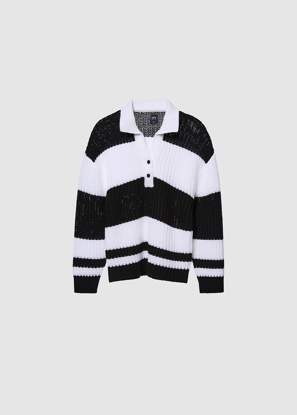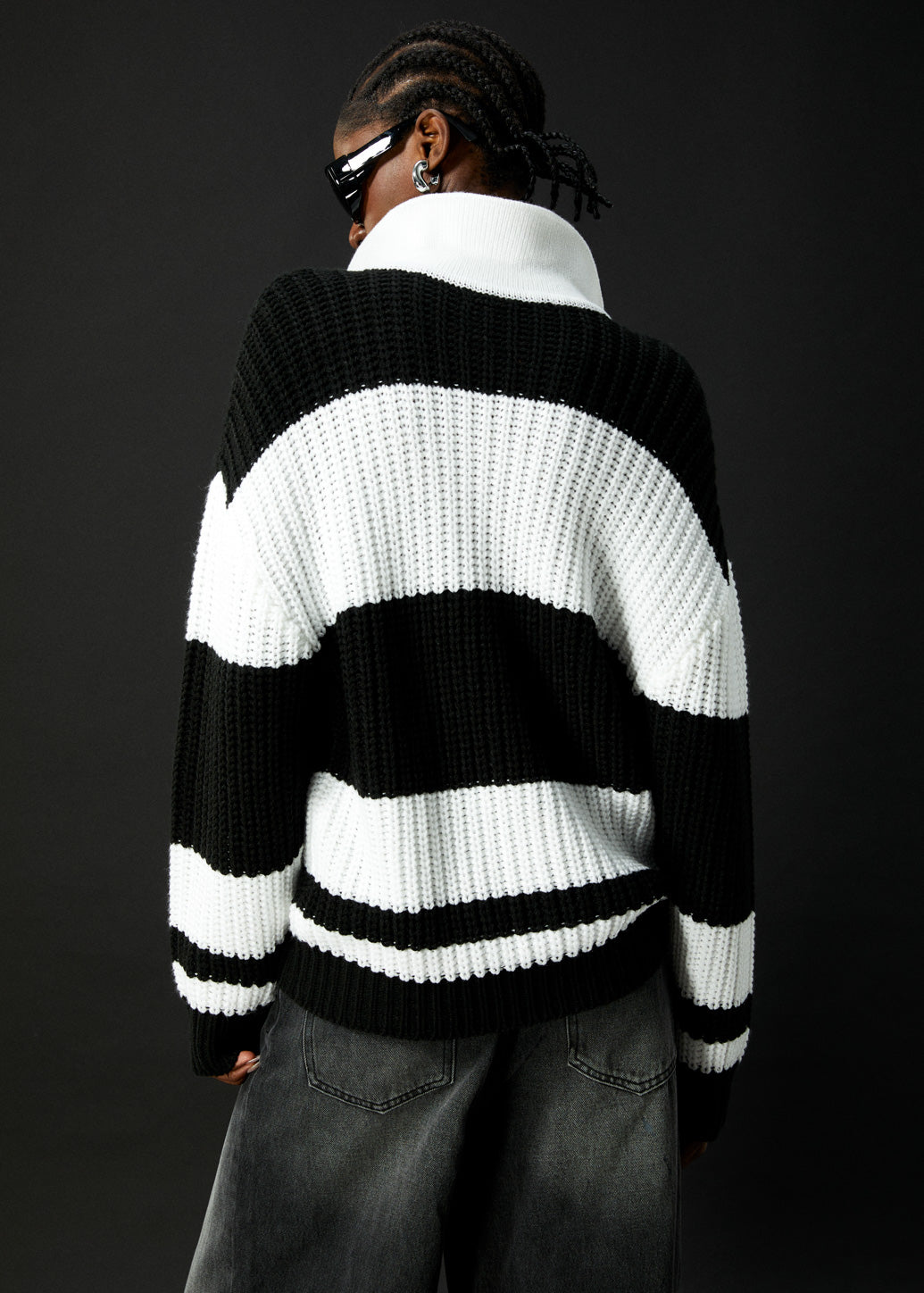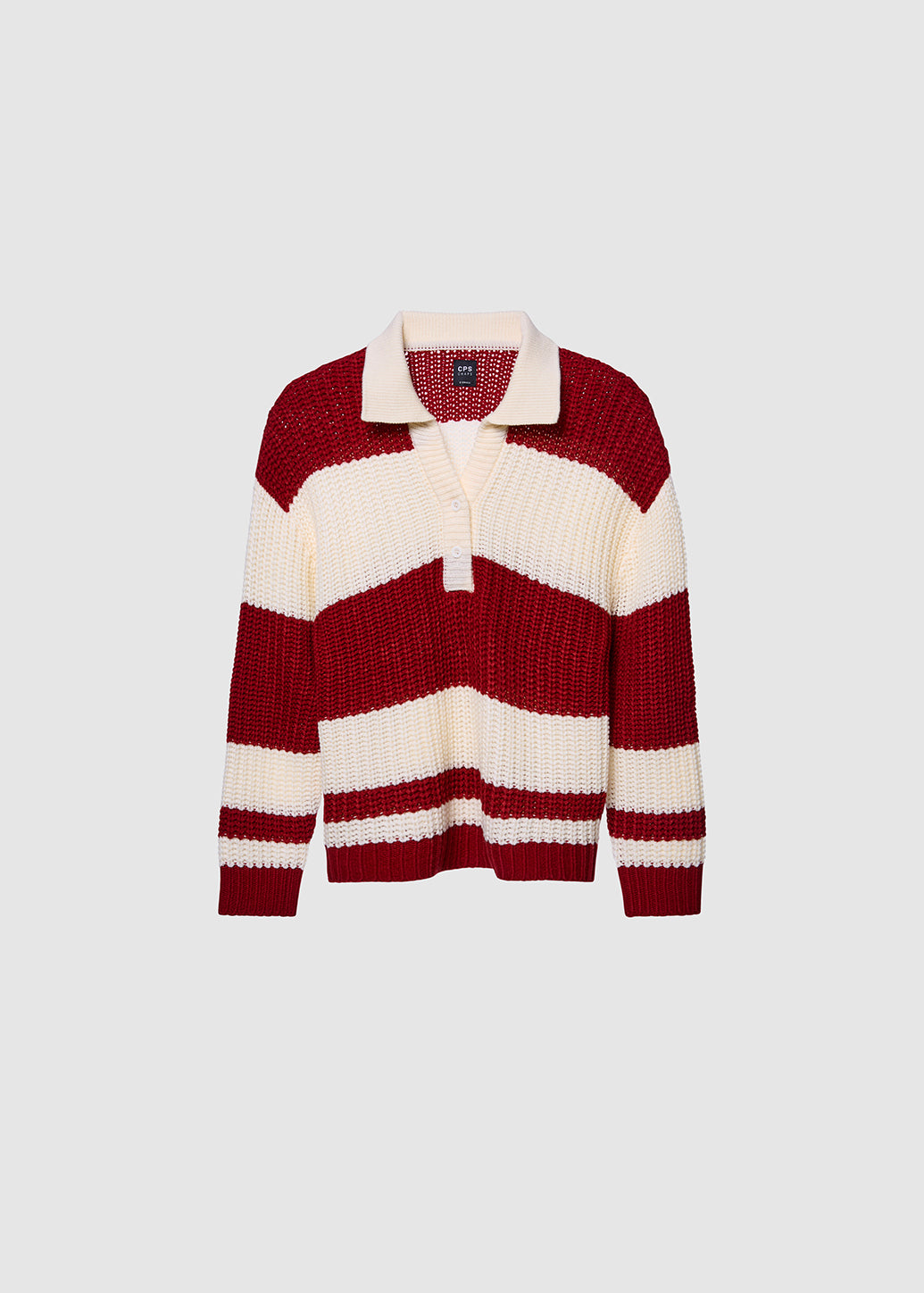 Elevate your casual look with this oversized knit top, inspired by the classic rugby polo. Featuring timeless stripes and a deep V-neck with buttons, it pairs perfectly with corduroy pants for a warm, sporty-minimal vibe—effortless to wear yet a standout in every outfit.