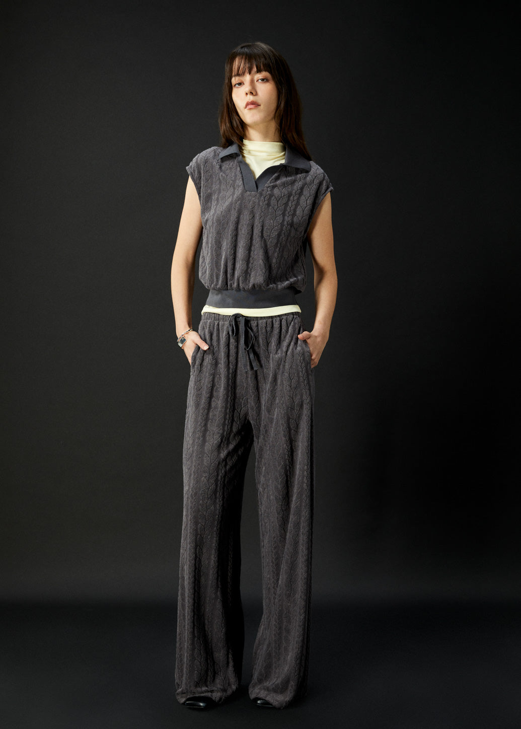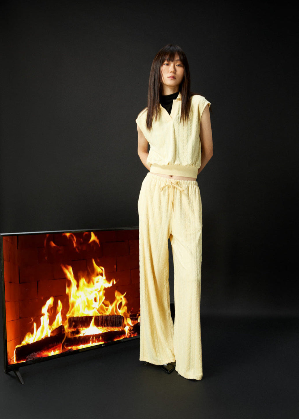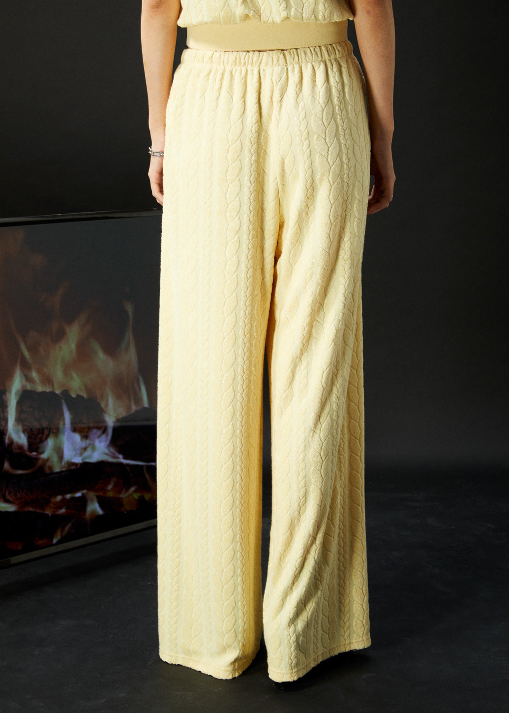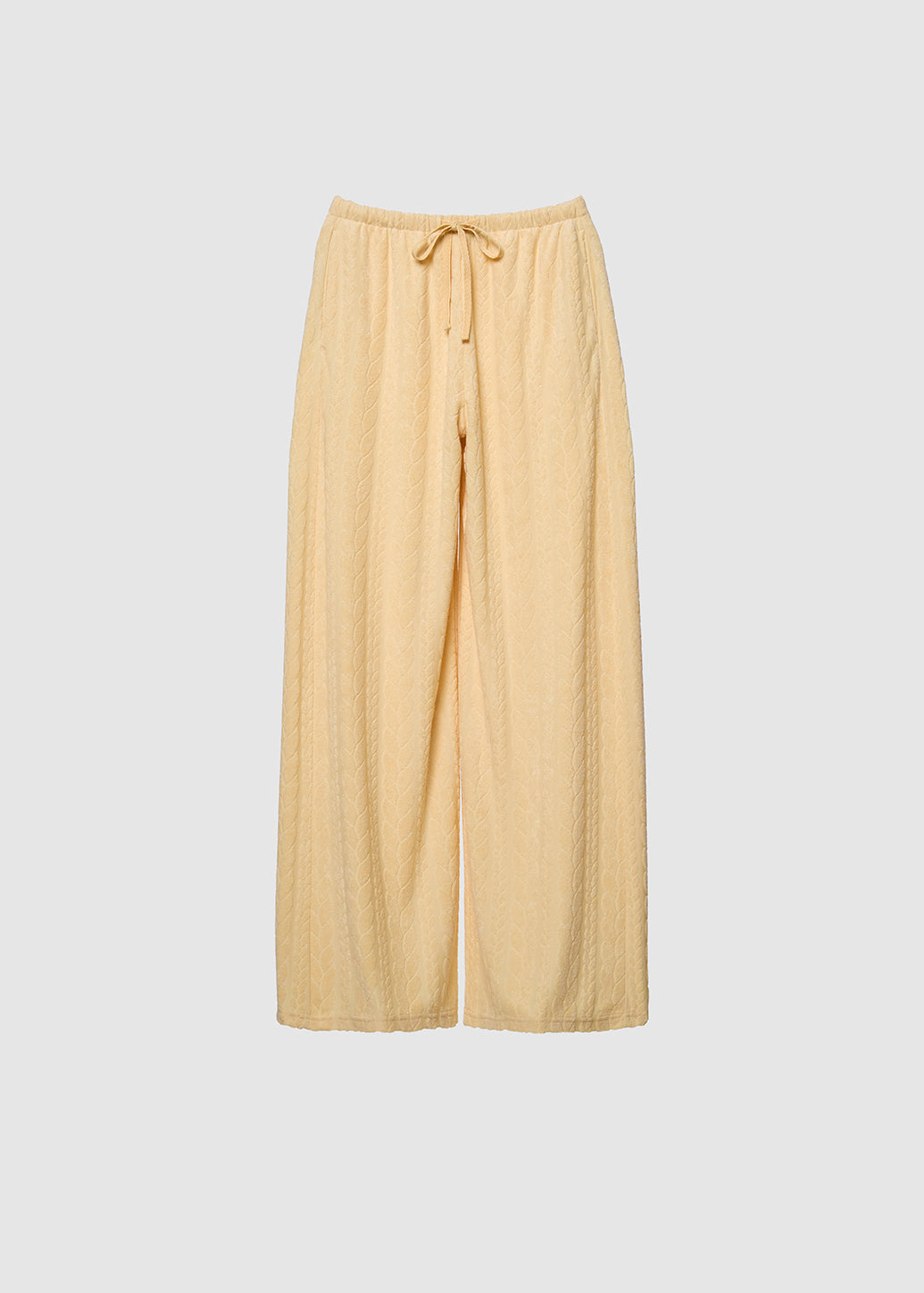 These cable-knit pants feature an elastic waistband with drawstrings for a customizable fit and effortless comfort. Designed with a relaxed fit silhouette, they offer a soft textured feel—perfect for adding warmth and casual style to your laid-back days.