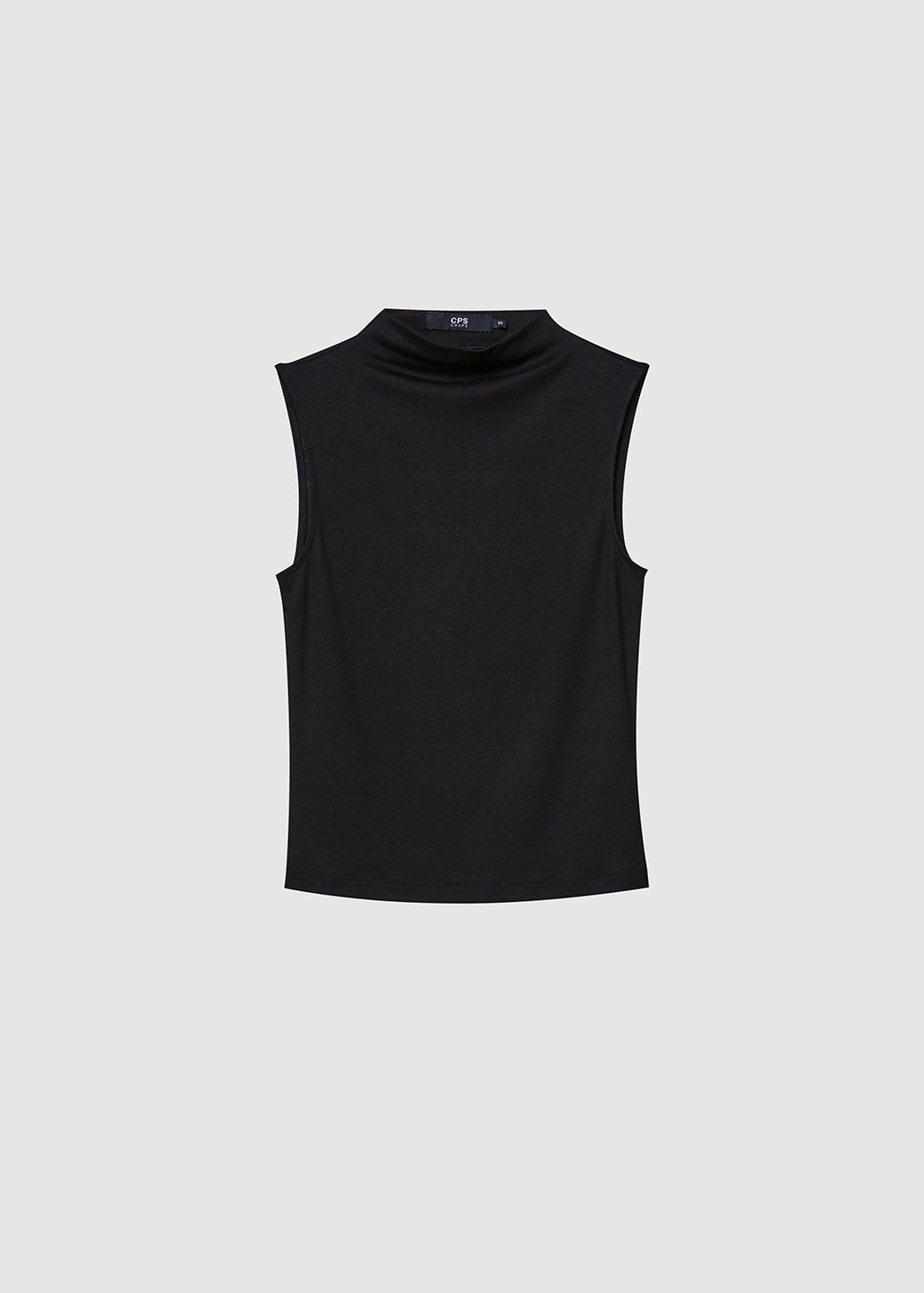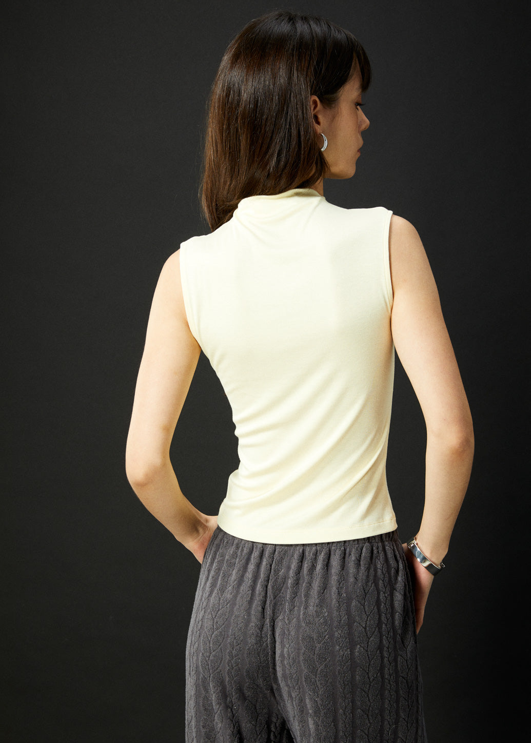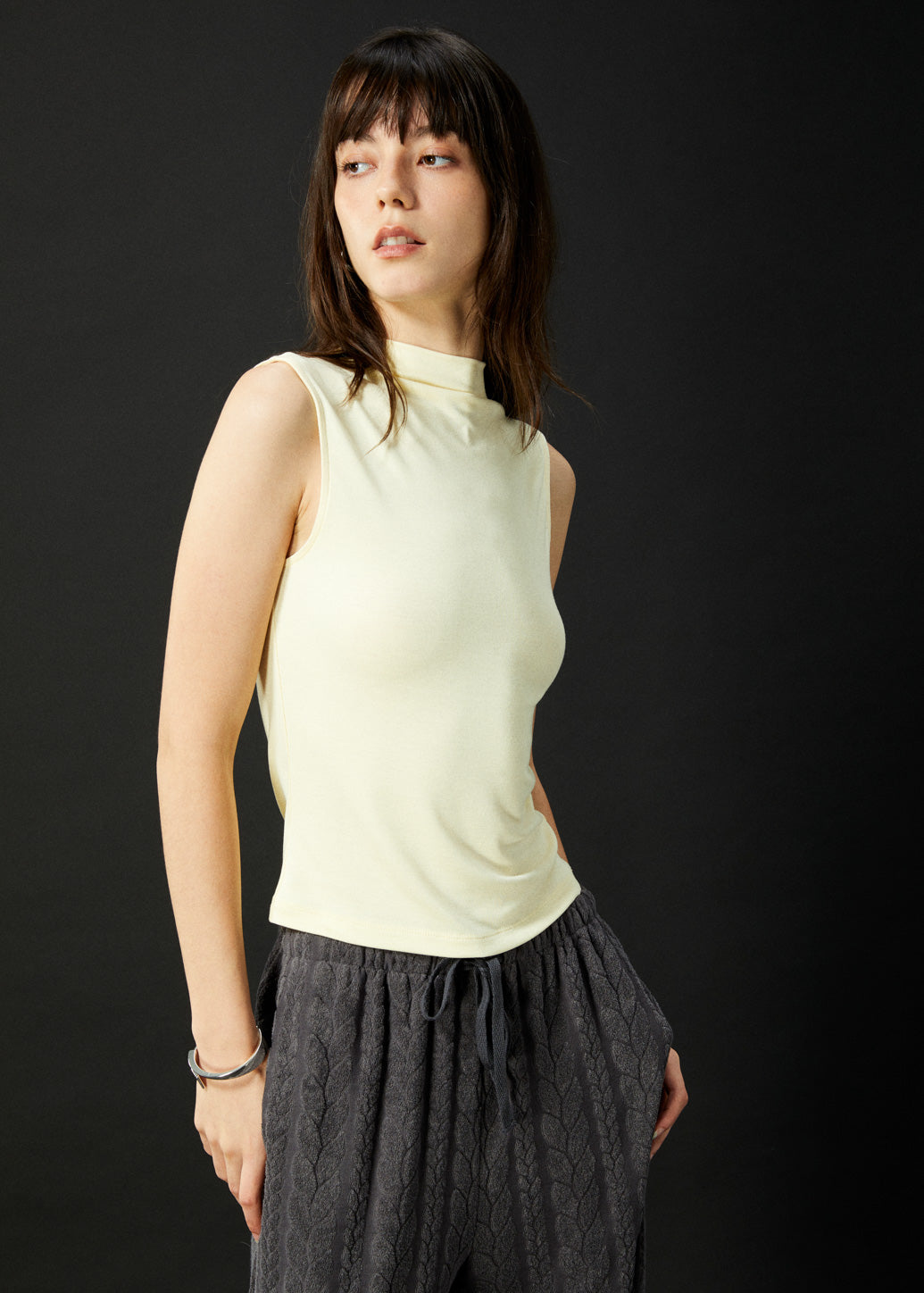 Sleeveless mock-neck top with a subtle draped collar detail, adding a twist to a simple design. The regular fit silhouette enhances a sleek, streamlined look, available in three basic shades—perfect for creating elegant minimal outfits for any occasion.