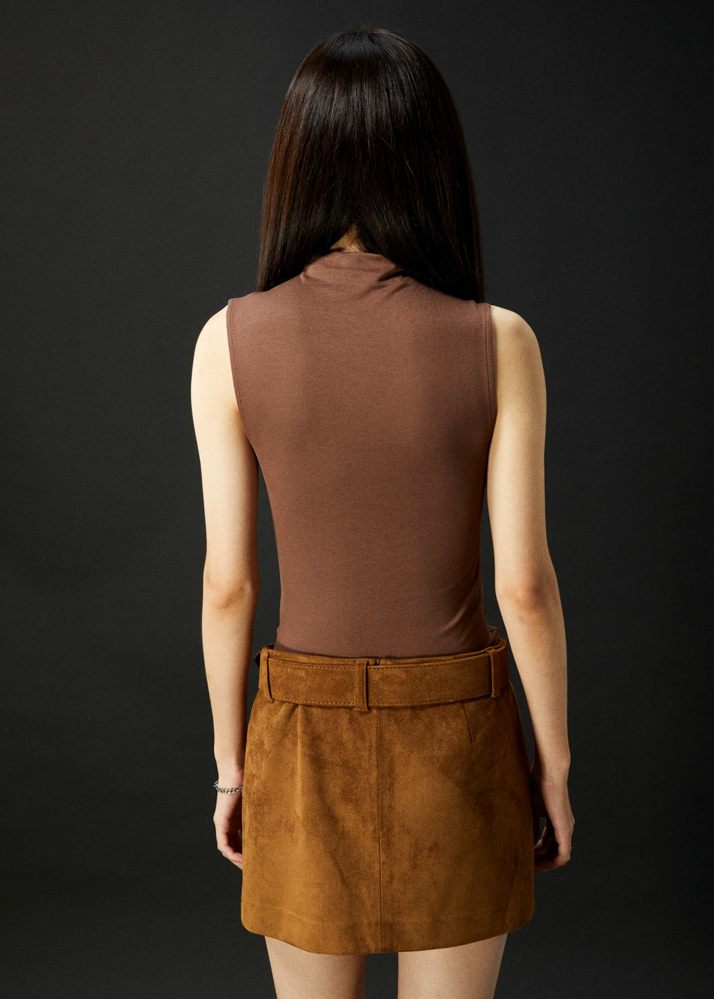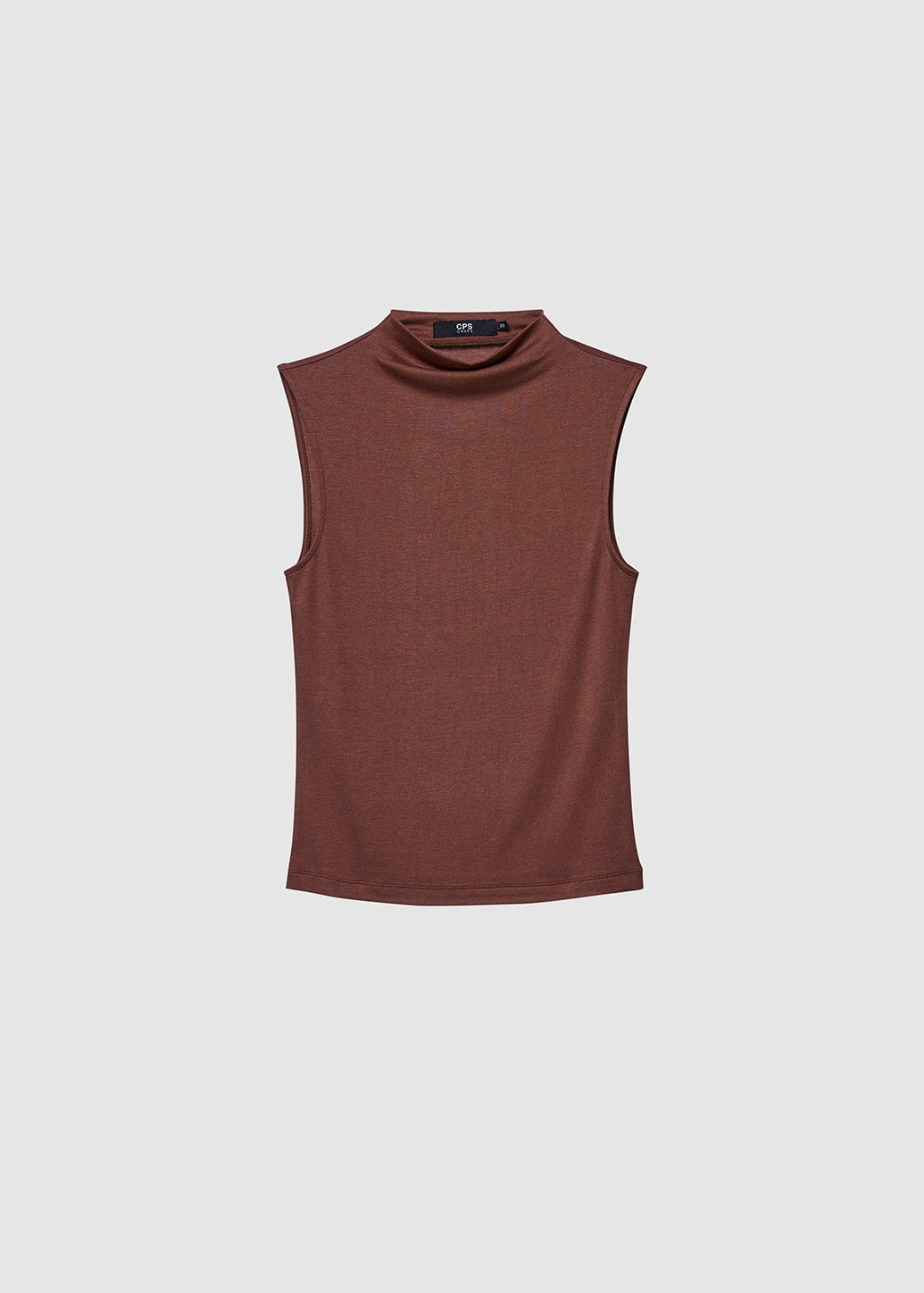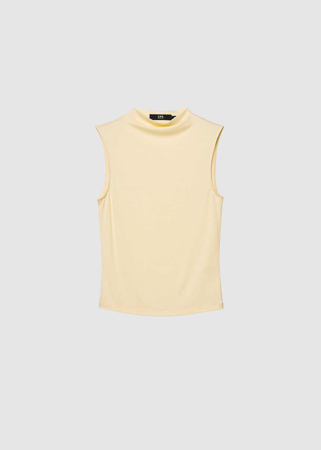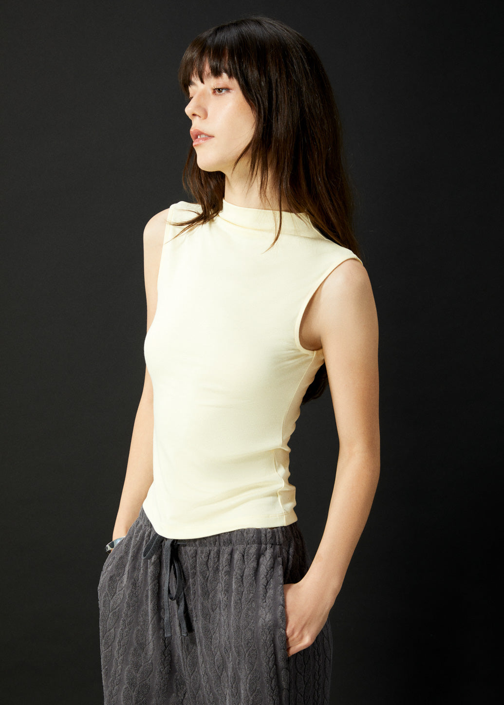 Sleeveless mock-neck top with a subtle draped collar detail, adding a twist to a simple design. The regular fit silhouette enhances a sleek, streamlined look, available in three basic shades—perfect for creating elegant minimal outfits for any occasion.