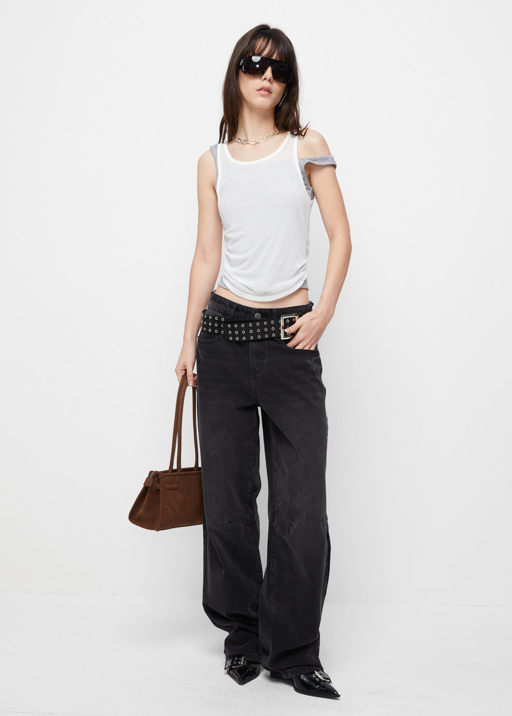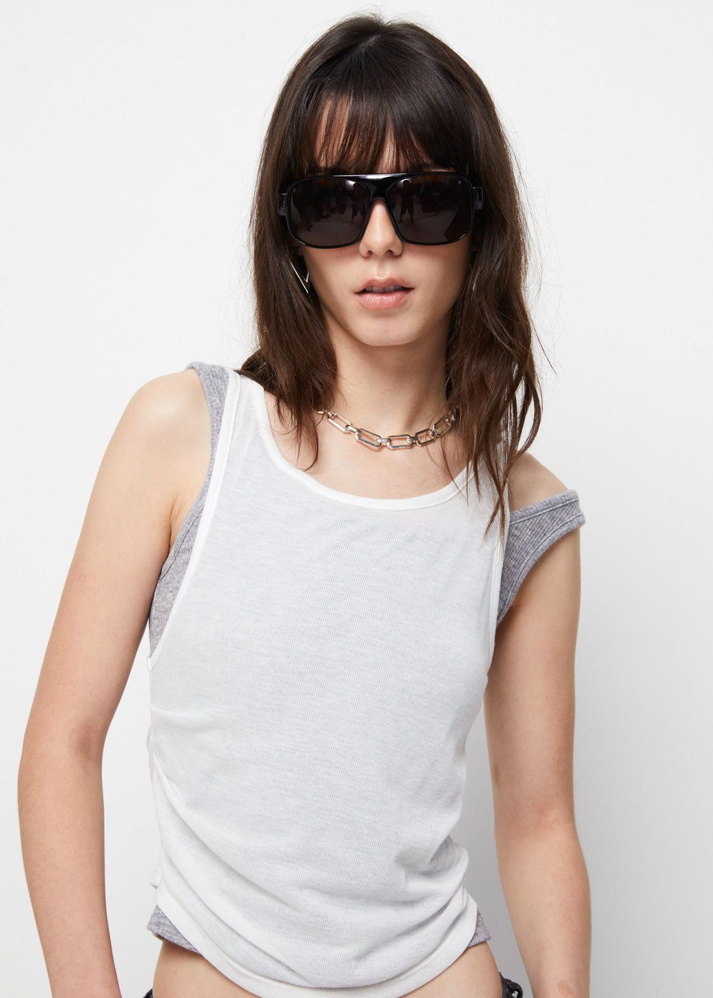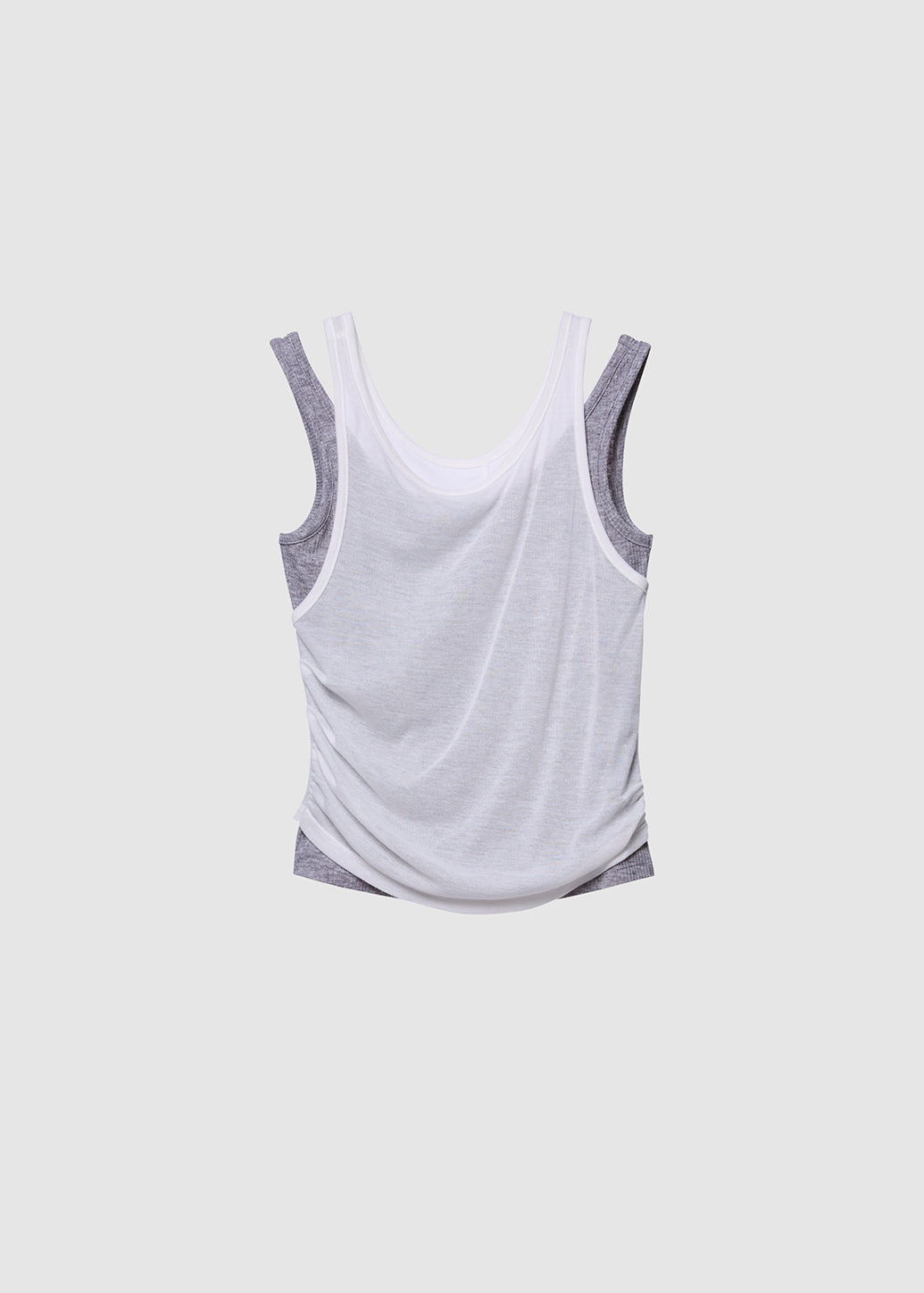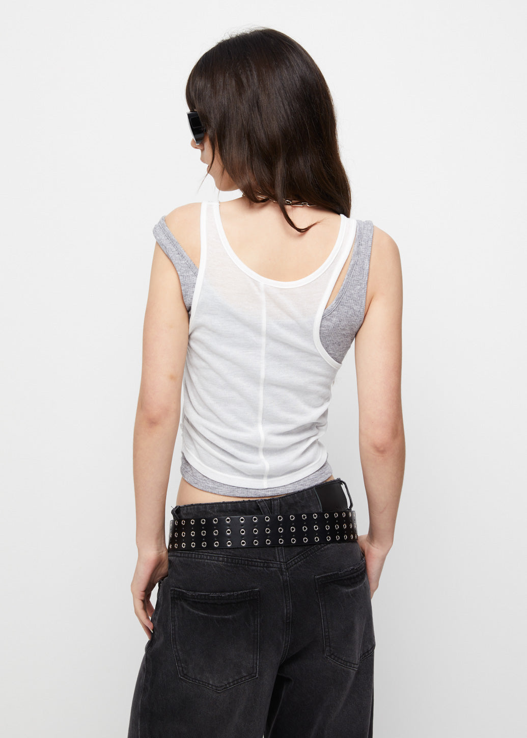 Experience modern style with this white tank top, featuring a trendy double-layer design over a black inner tank for a chic and minimalist look. Pair it with various denim styles; this layered piece adds a chic touch to effortless everyday outfits.