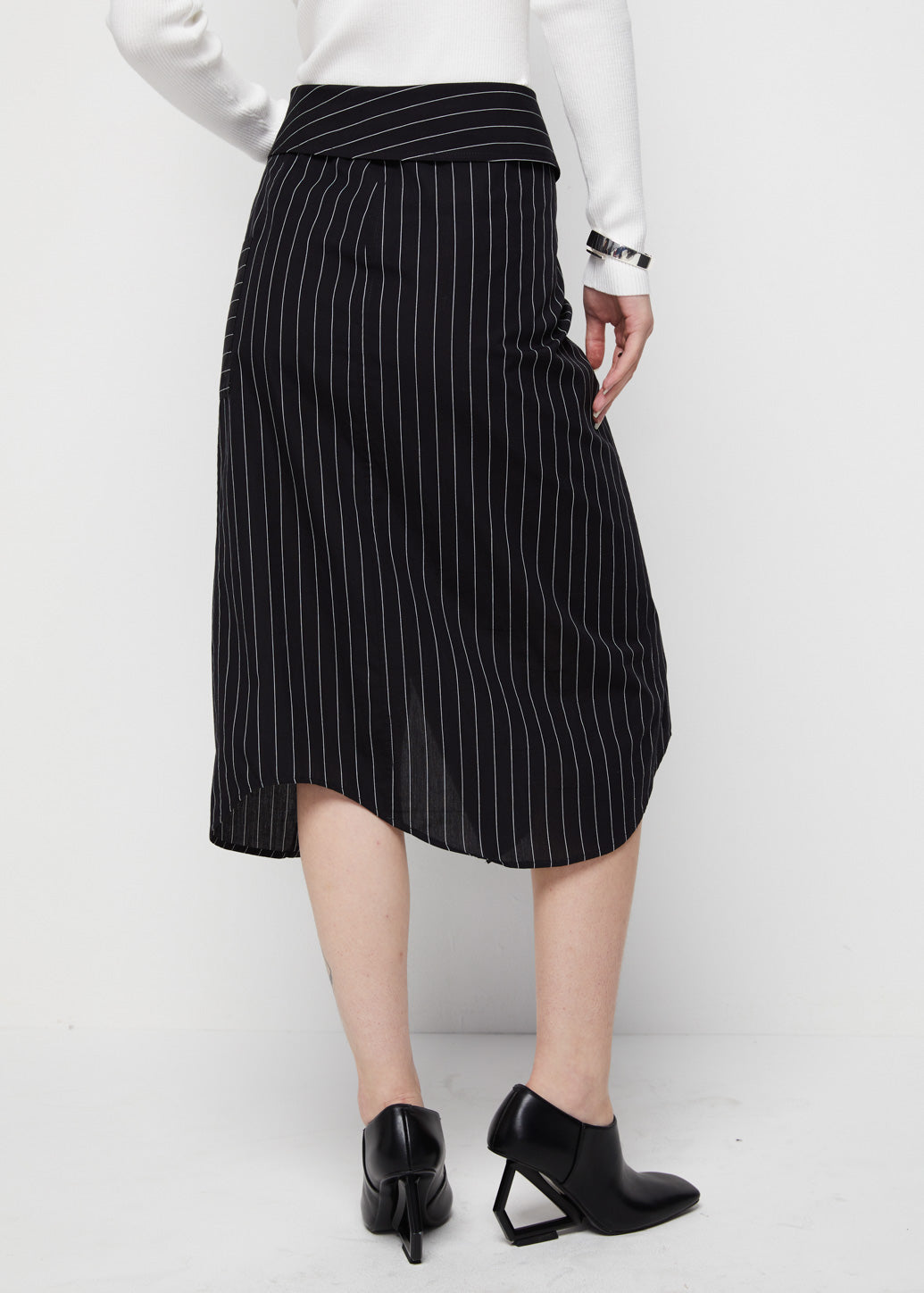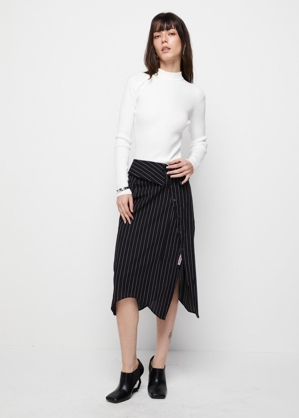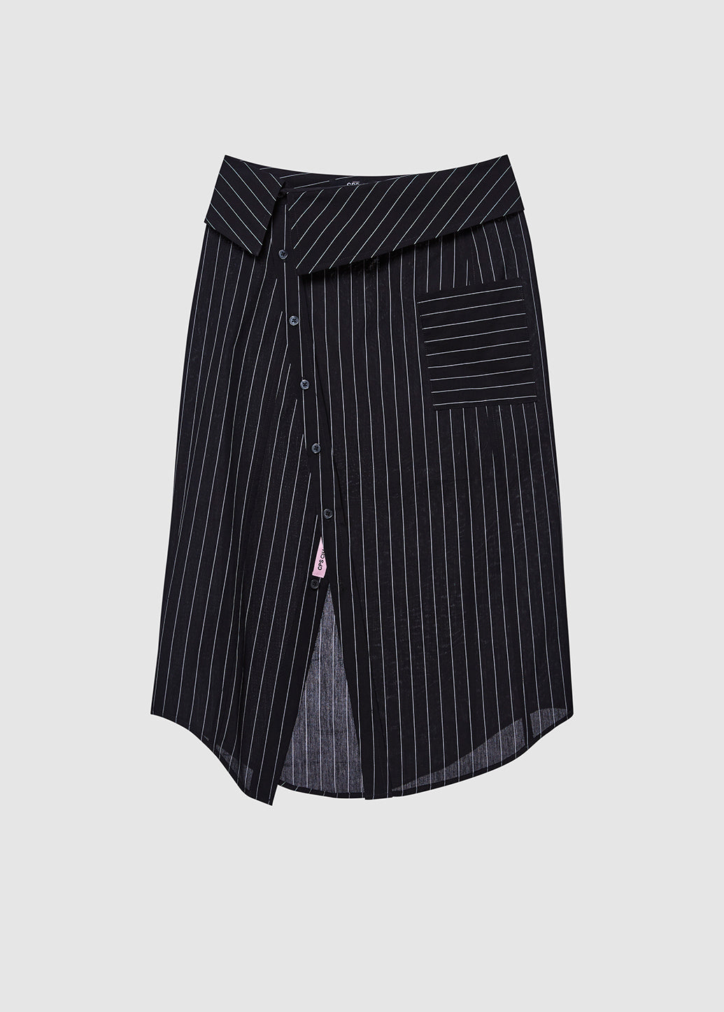 An A-line deconstructed skirt featuring an overlapping hem with a front button slit and hidden label placket detail. Equipped with front pockets, this piece blends minimal and street-style aesthetics, offering comfortable movement while exuding confident and edgy vibes from every outfit.