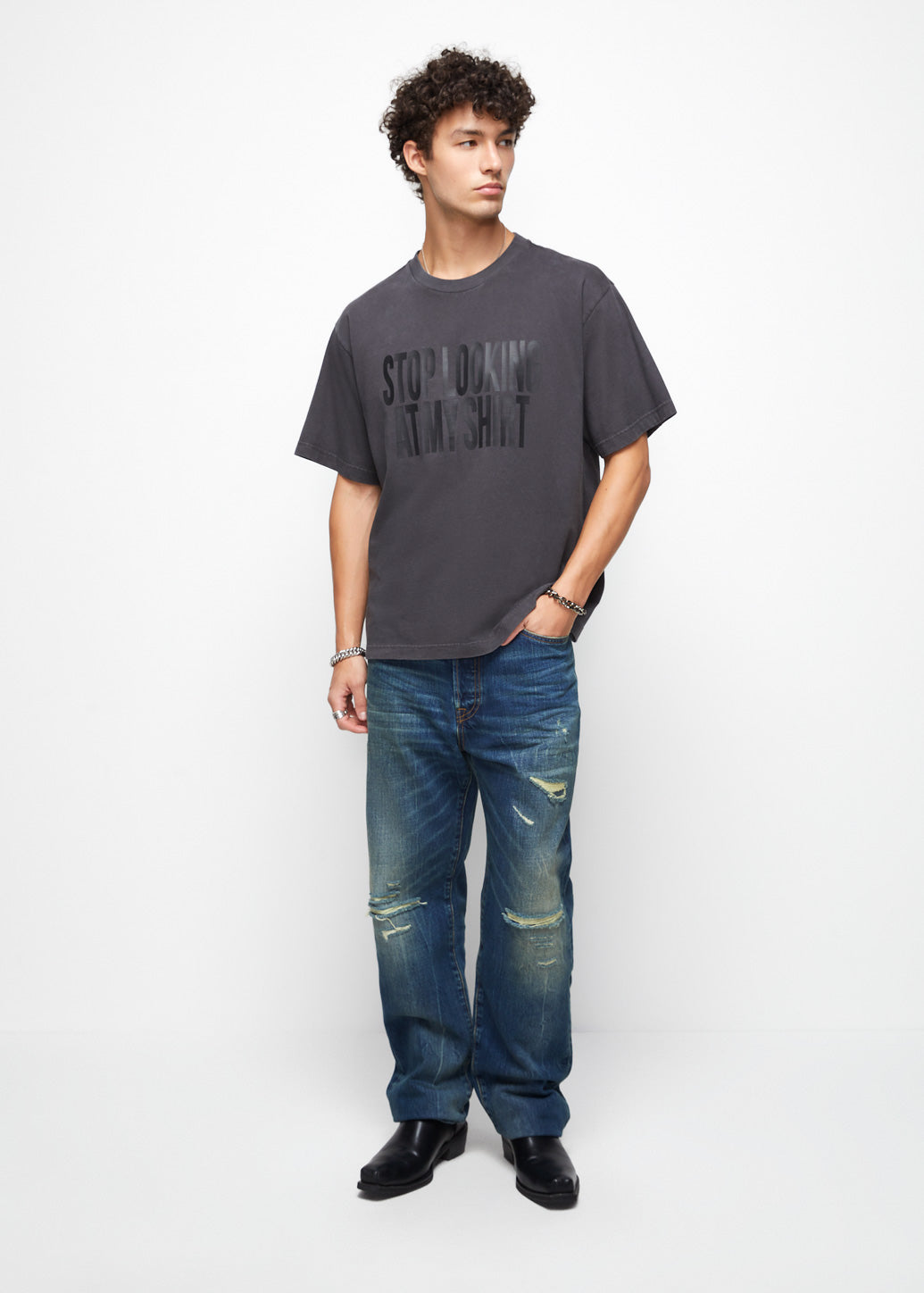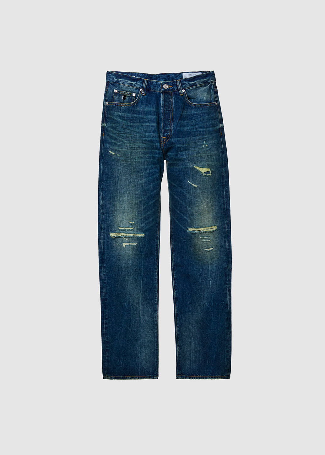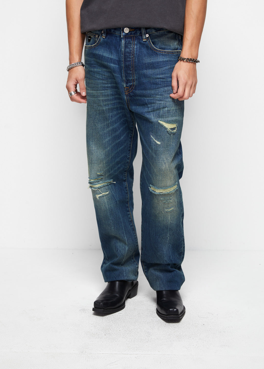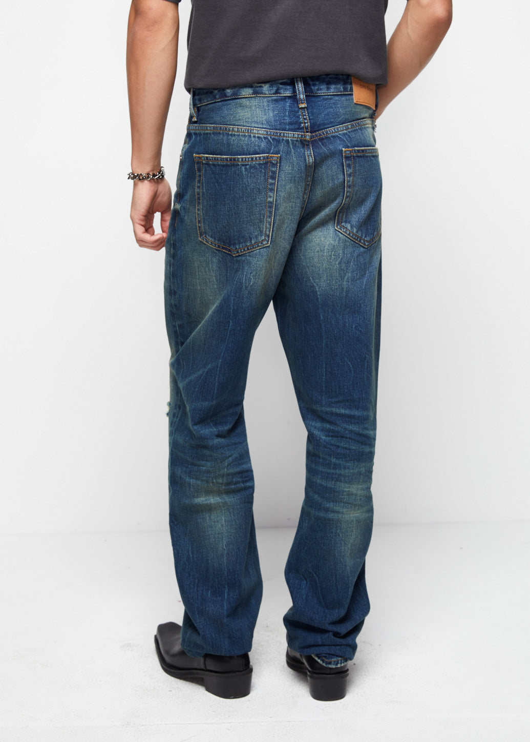 Elevate your denim look with a vintage twist in straight-leg jeans. Featuring a timeless silhouette with faded wash and distressed detailing at the front. Finish with five functional pockets and a signature guitar pick logo charm at the coin pocket—delivering an effortlessly cool CPS CHAPS vibe.