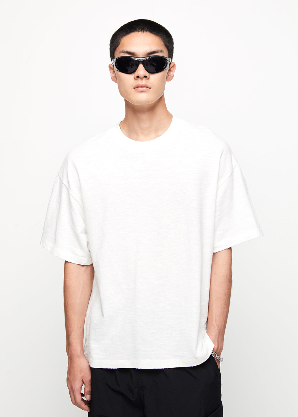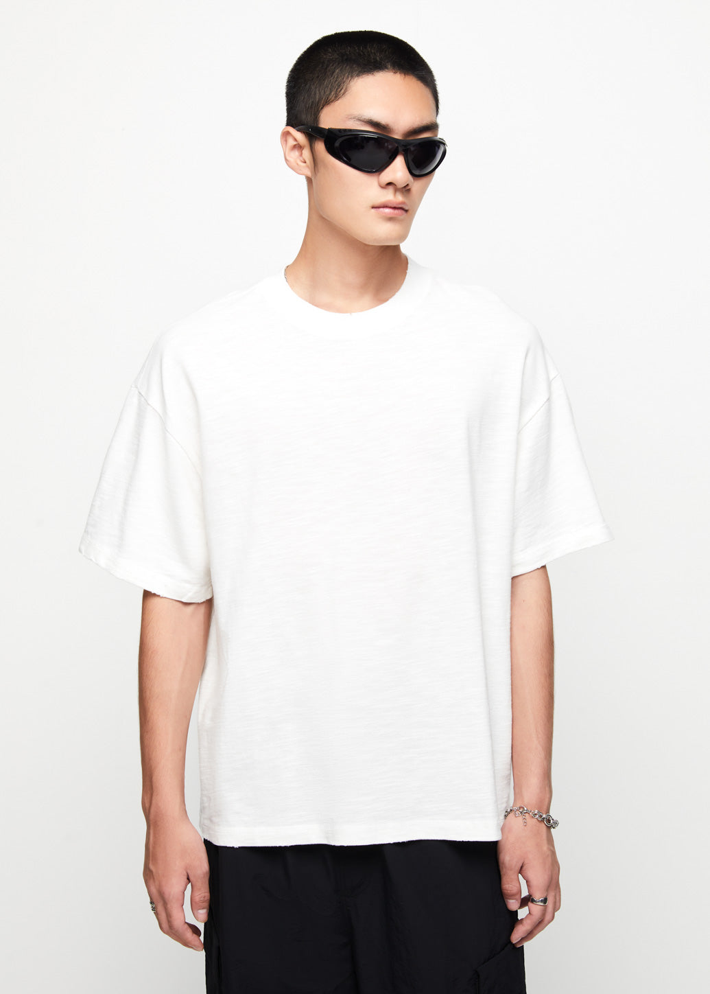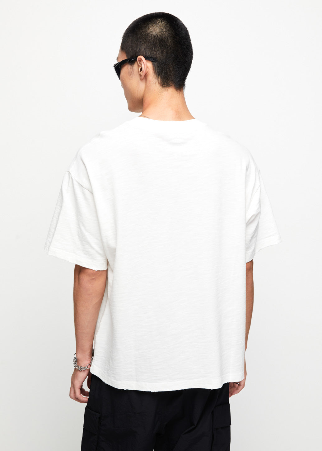 Elevate your T-shirt game with this loose-fit round neck, crafted from thick slub fabric for a soft and comfortable feel. Finished with destroyed edges for a rugged detail, it adds a unique touch to casual street looks.