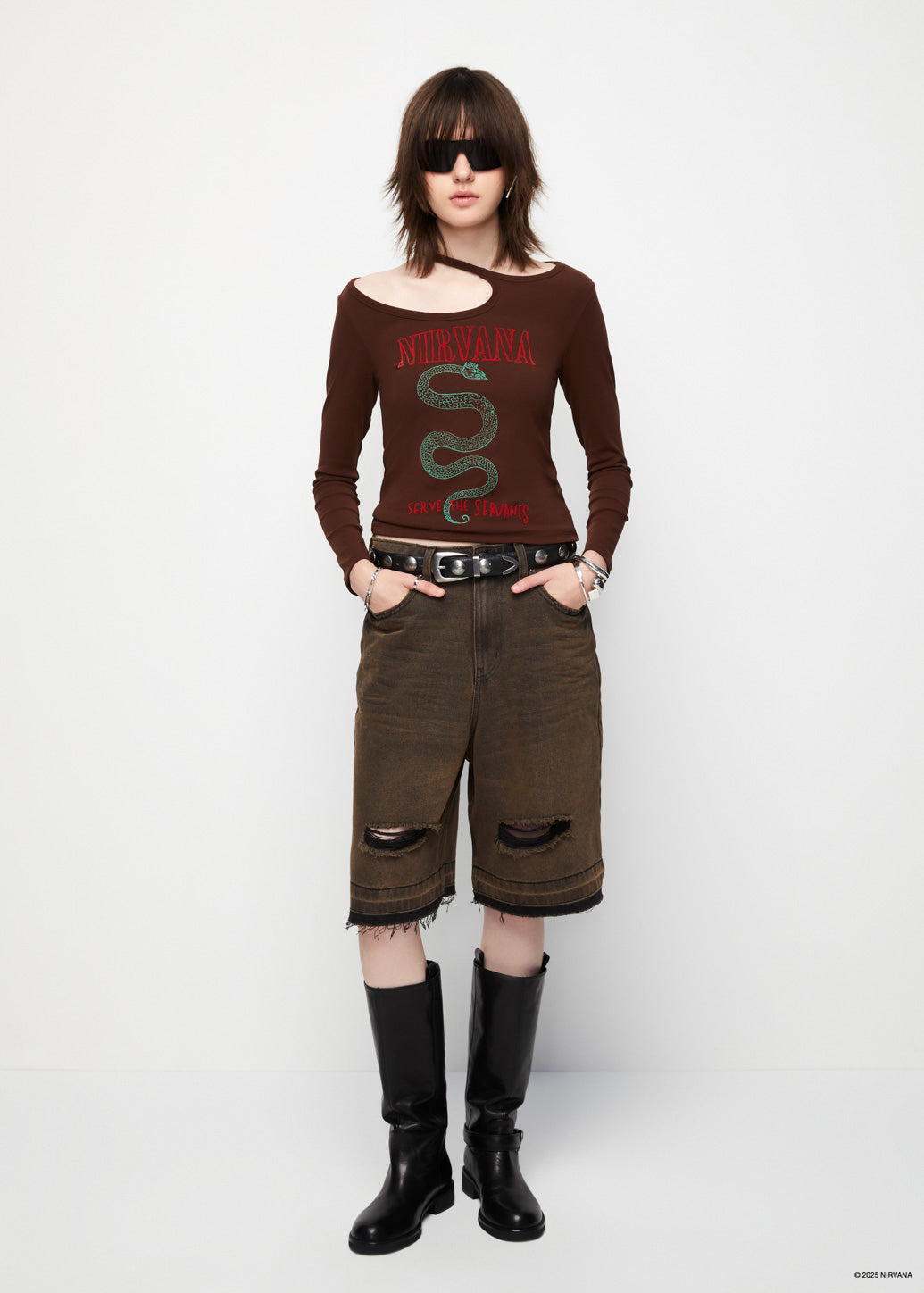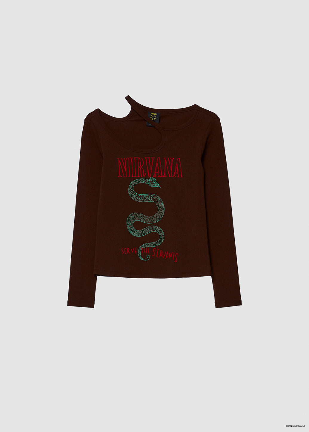The latest drop with our long-sleeve asymmetric-neck top. The front is decorated with an iconic Nirvana Serve the Servants graphic, adding a one-of-a-kind edge. This piece flawlessly fuses fashion with rock music, helping you elevate your style for casual days and street outfits.