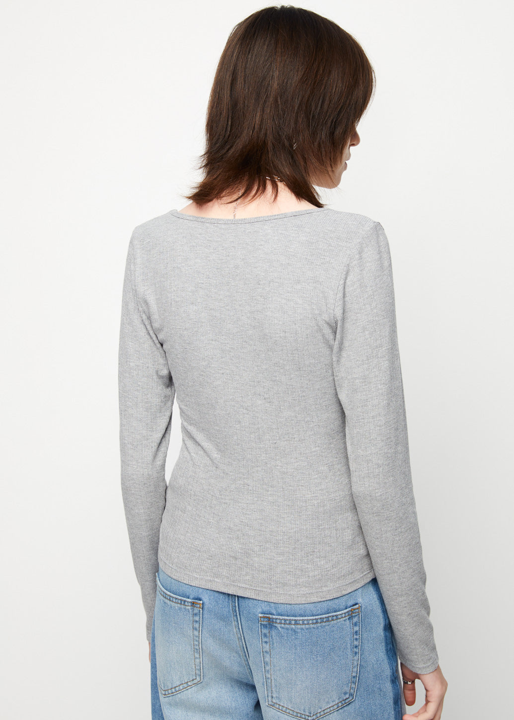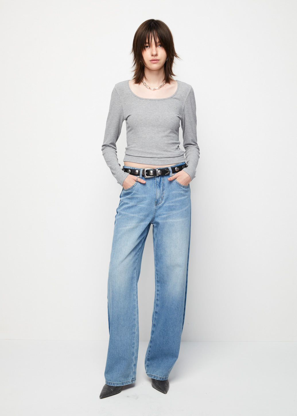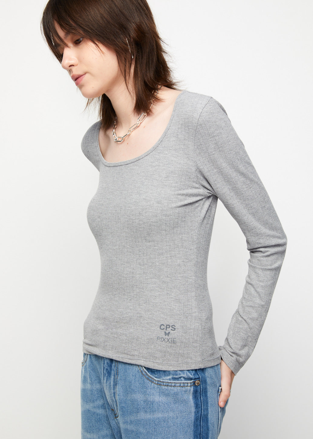 A minimal gray wide-neck long-sleeve top. It stands out with a unique CPS X PIXXIE collaboration logo placed on the side. This piece presents the Pimma fashion style from the girl group PIXXIE, which is perfect for pairing with wide-leg jeans to complete a cool and casual look.