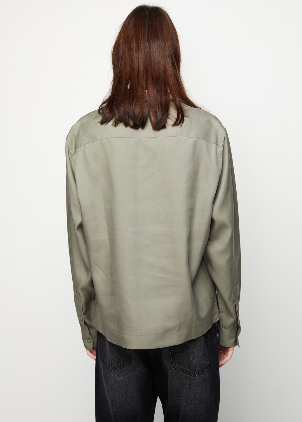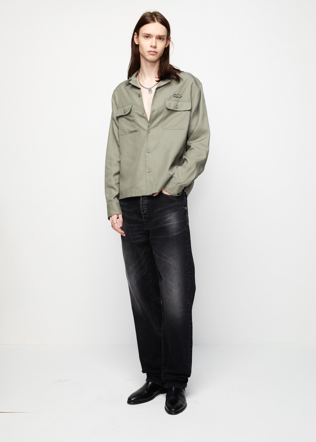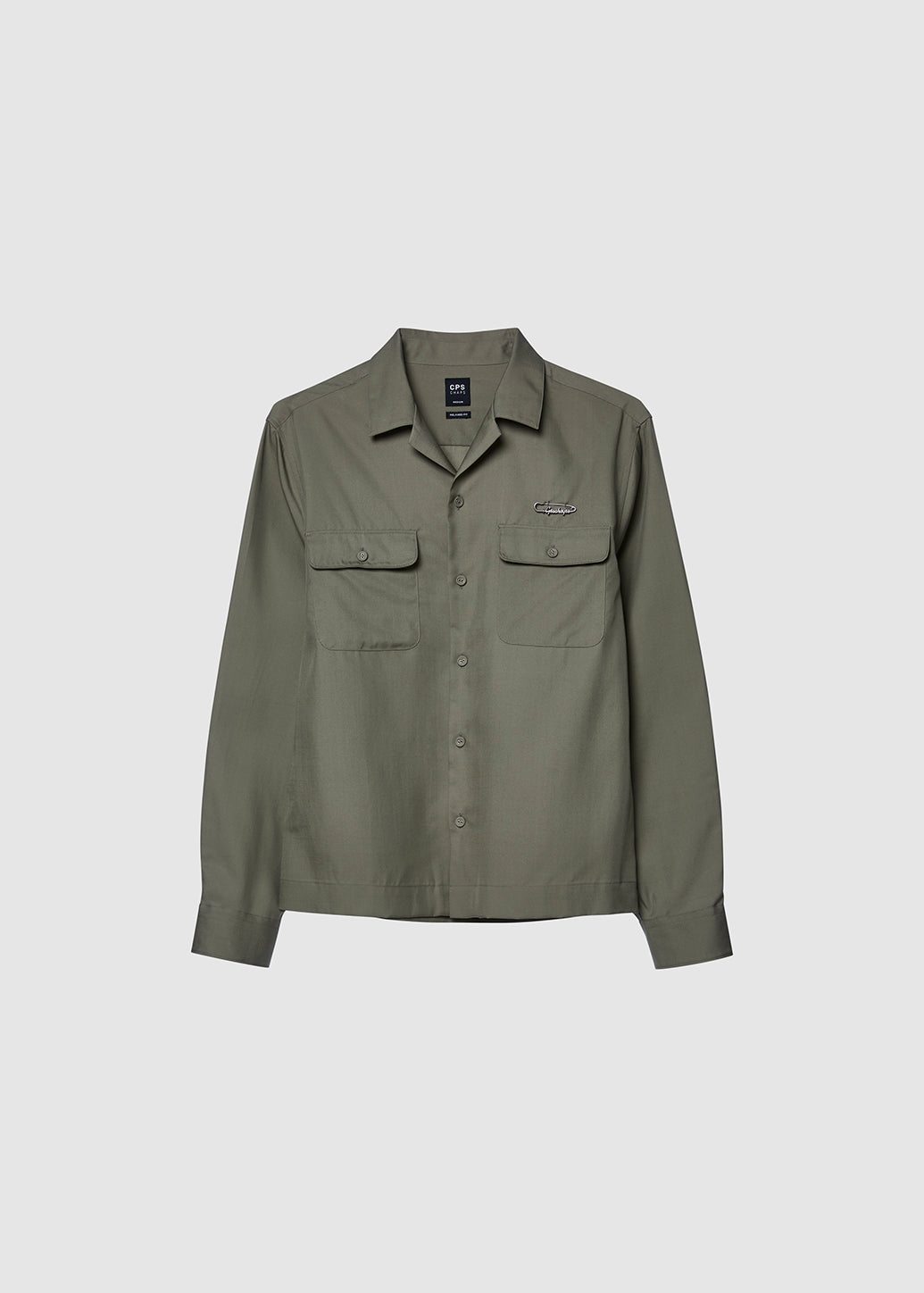 A loose-fit long-sleeve shirt features flap chest pockets, special fabric-covered buttons, and a detachable silver logo pin on the chest. This classic colour shirt is perfect for mixing and matching to create both formal and casual outfits.