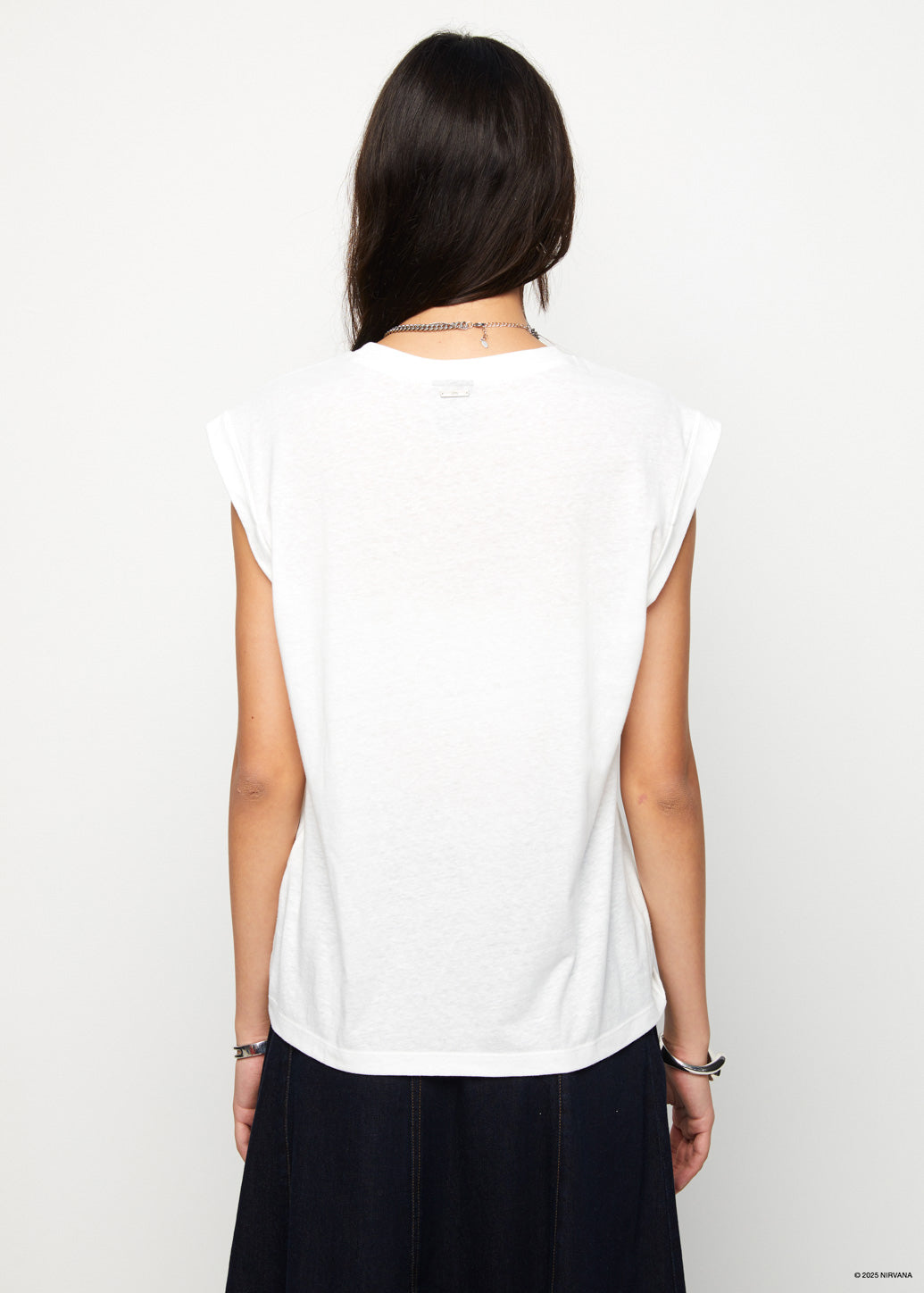A minimal sleeveless t-shirt, with a special CPS X Nirvana collaboration that blends rock music with contemporary fashion. It features a graphic print from the In Utero 1994 album and rolled up for a chic twist. This tee is perfect for pairing with denim or a jacket to create an edgy, casual winter look.