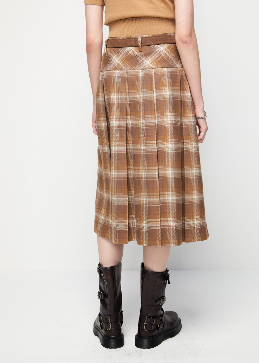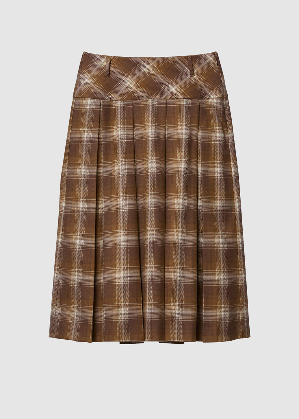 Plaid pleated skirt with a knee-length design, featuring classic pleats and a checkered pattern for a timeless look. Its warm aesthetic makes it perfect to pair with long-sleeve tops or jackets, adding a simple yet standout style for any occasion.