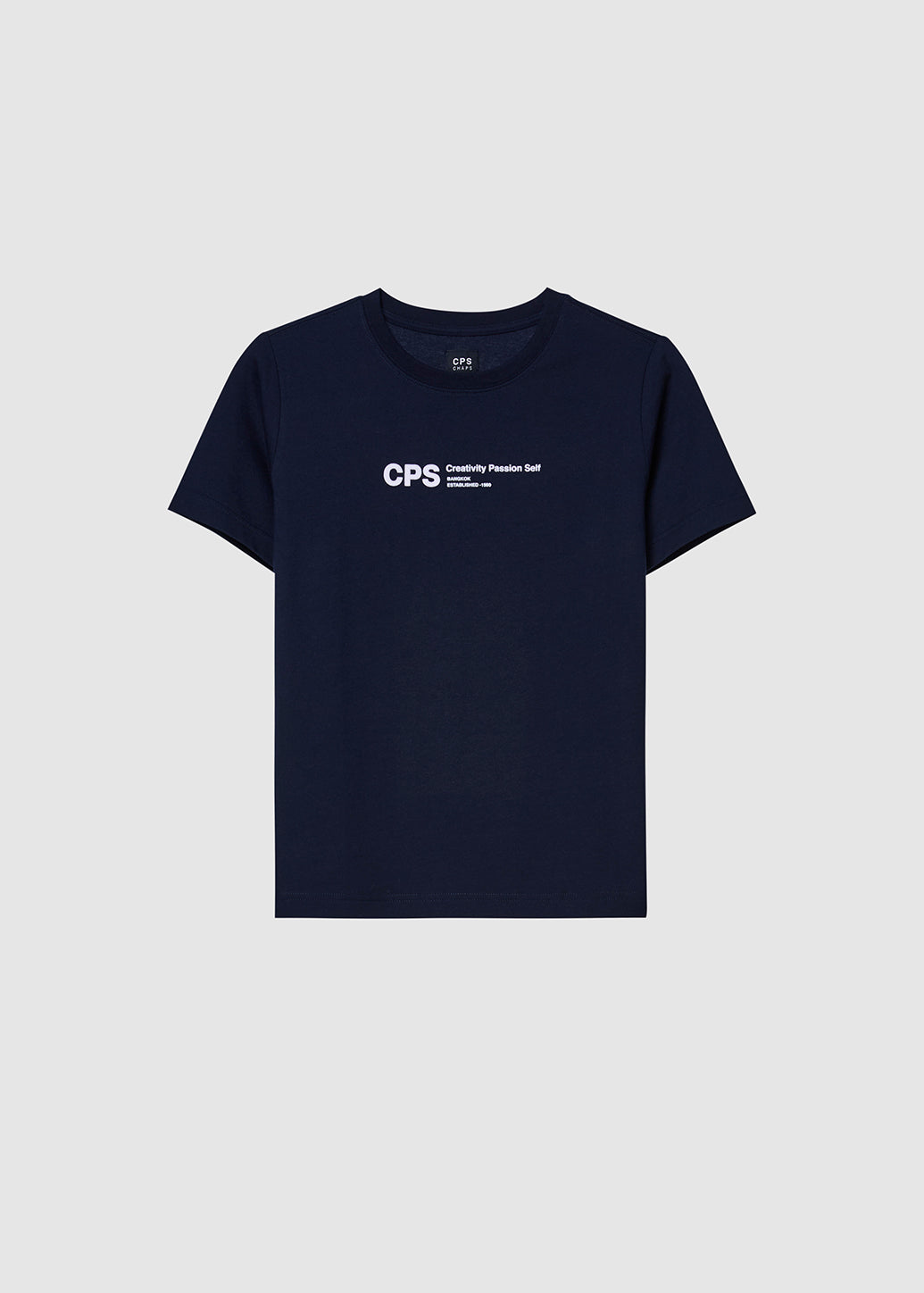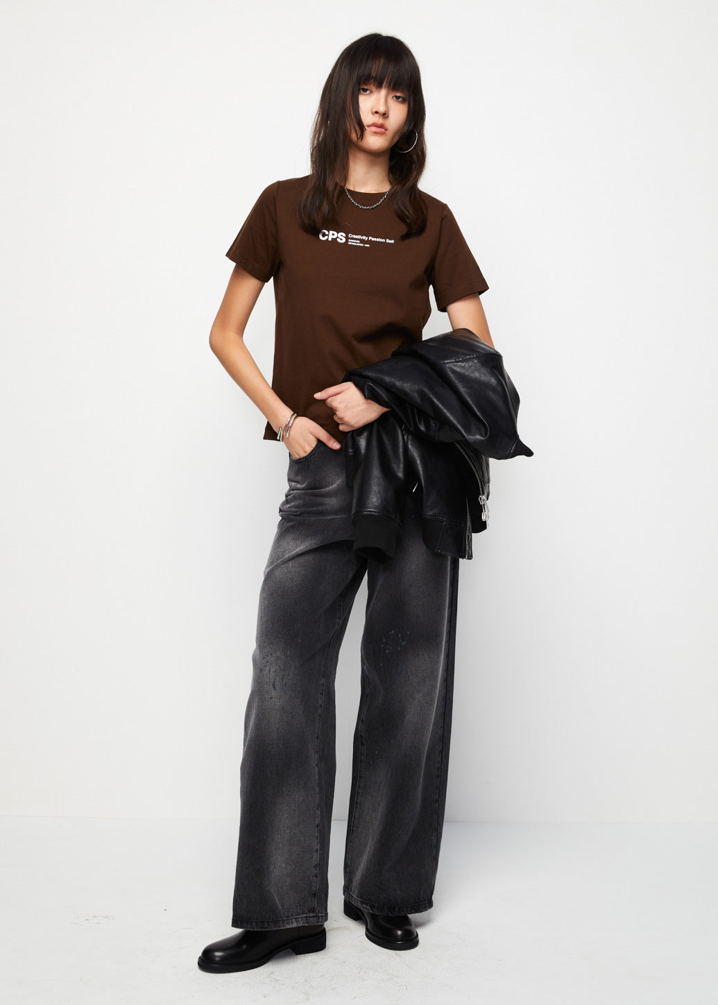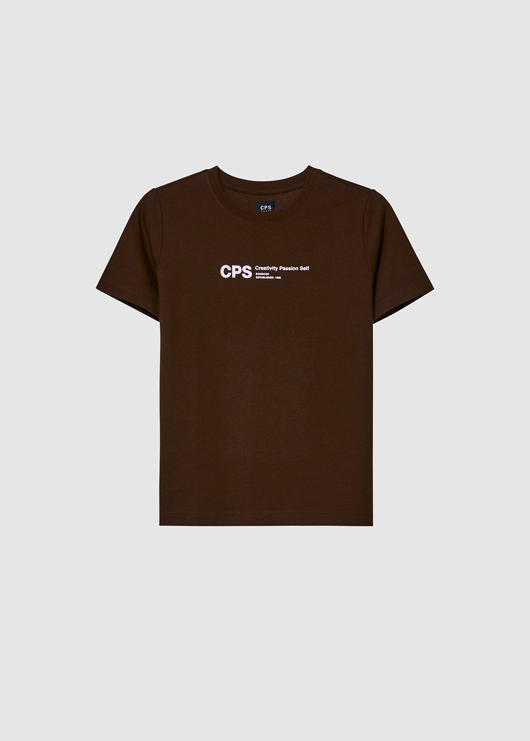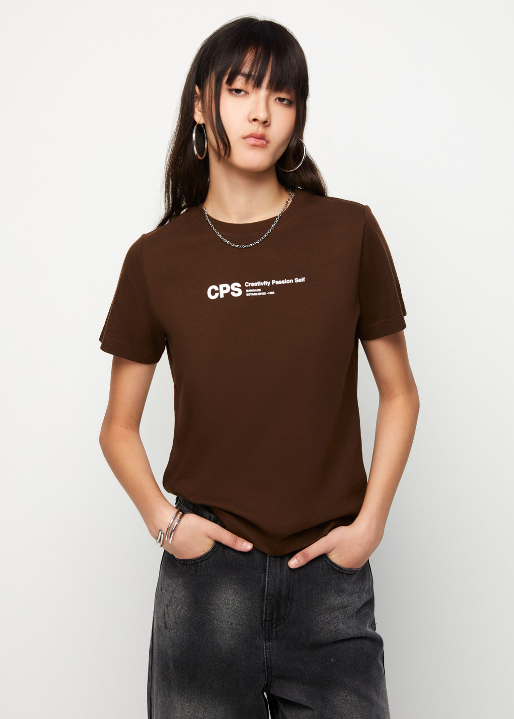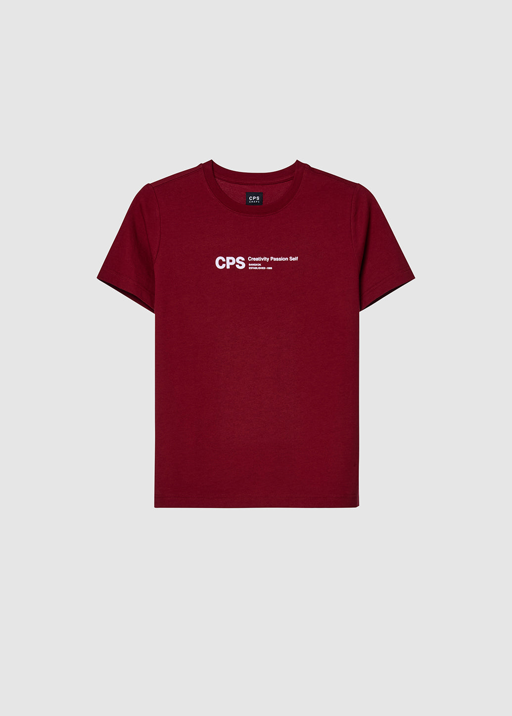 A short-sleeve t-shirt, available in three versatile colors: red, brown, and navy. The minimal design is elevated by a distinctive print of the brand's slogan, "CREATIVITY. PASSION. SELF," on the front. This tee is a must-have for showcasing a confident style, and it pairs perfectly with jeans for a simple and edgy outfit.