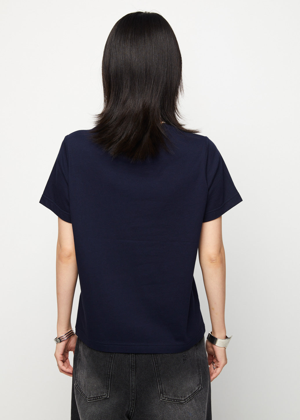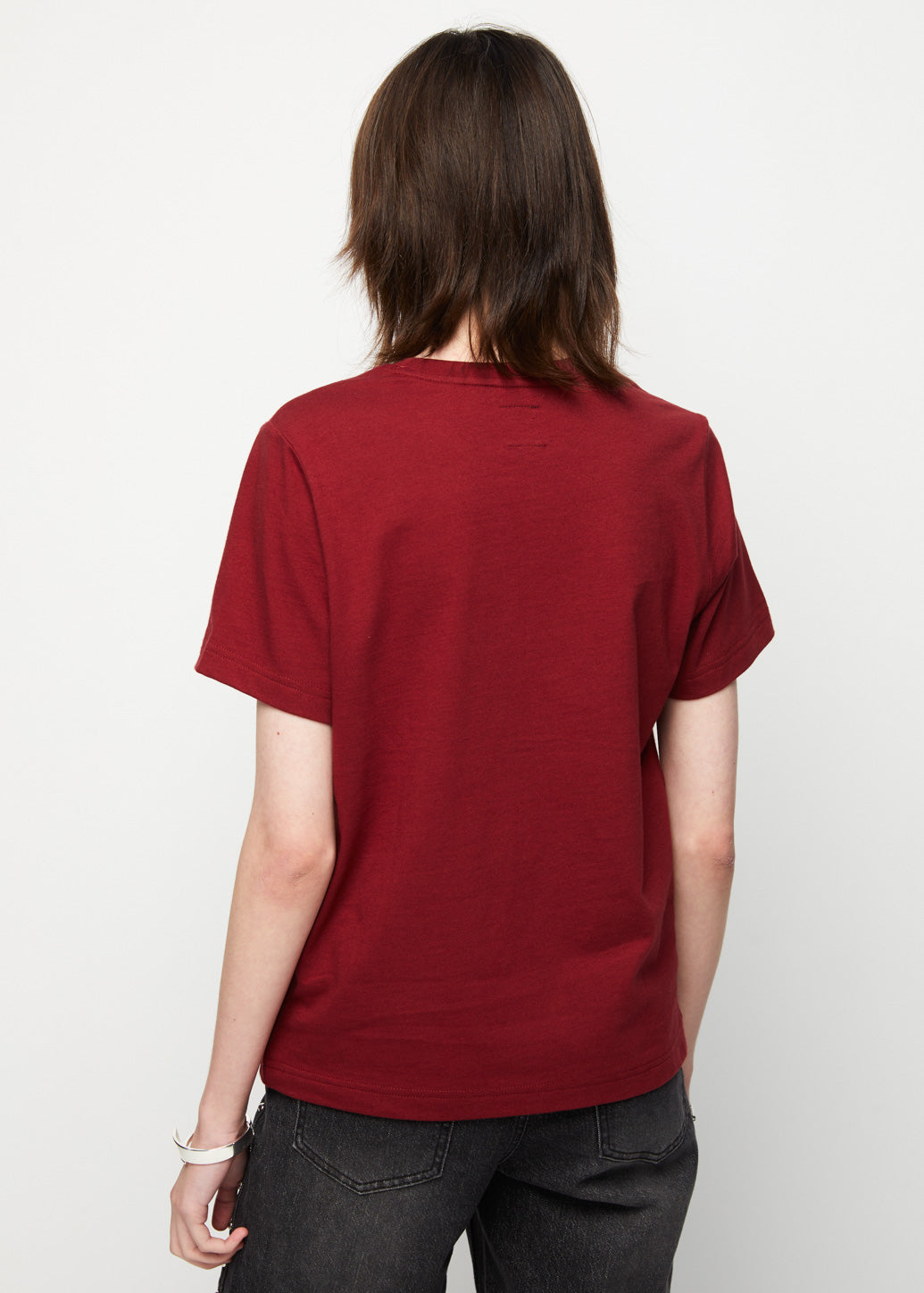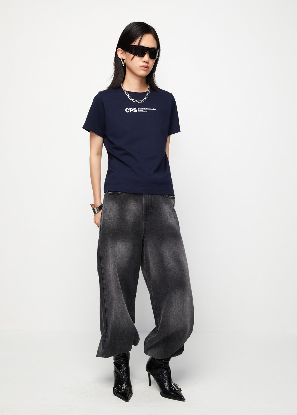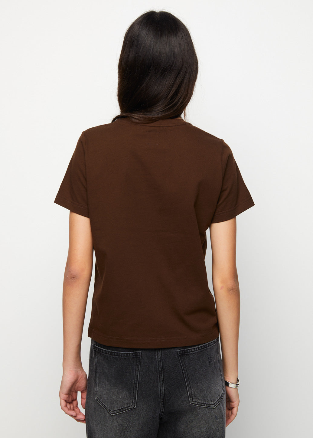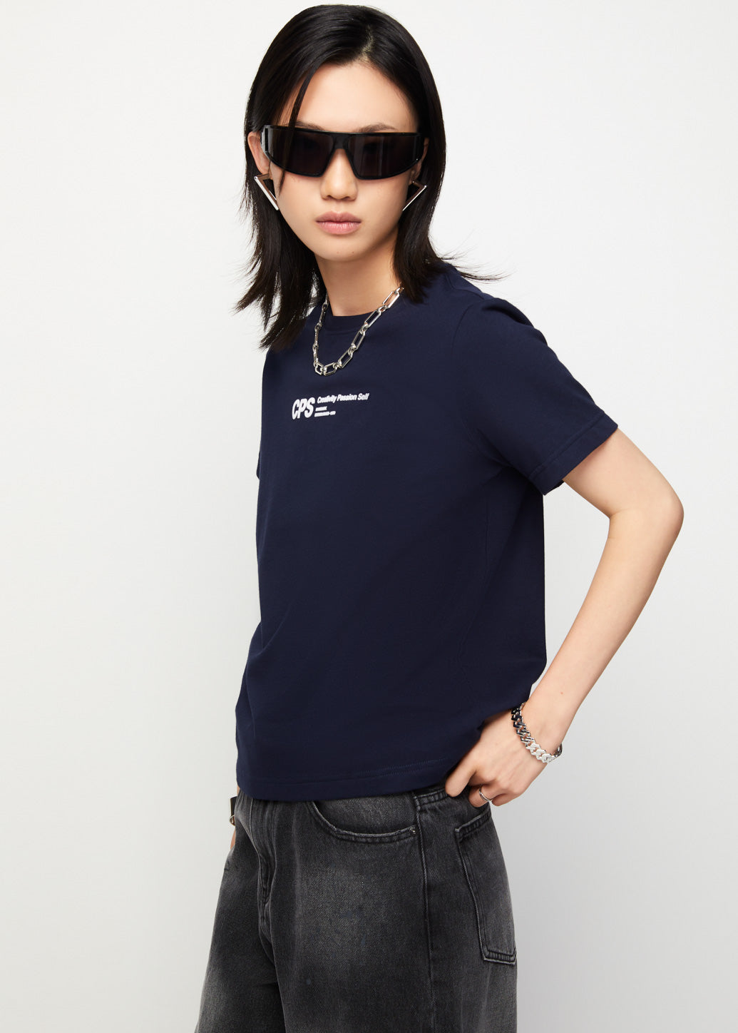 A short-sleeve t-shirt, available in three versatile colors: red, brown, and navy. The minimal design is elevated by a distinctive print of the brand's slogan, "CREATIVITY. PASSION. SELF," on the front. This tee is a must-have for showcasing a confident style, and it pairs perfectly with jeans for a simple and edgy outfit.