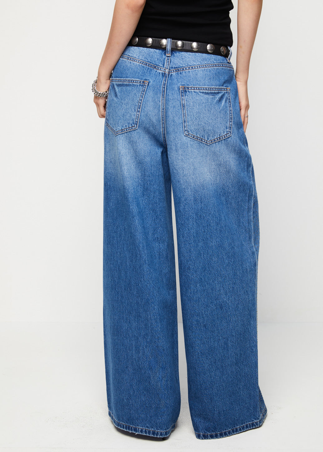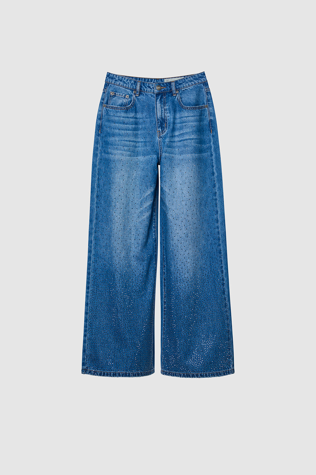Wide-leg jeans, elevated with sparkling rhinestone embellishments all over for a dazzling effect. Designed with five functional pockets, this piece combines practicality with standout style. Pair it with a T-shirt or the matching top to create a standout chic, casual look.