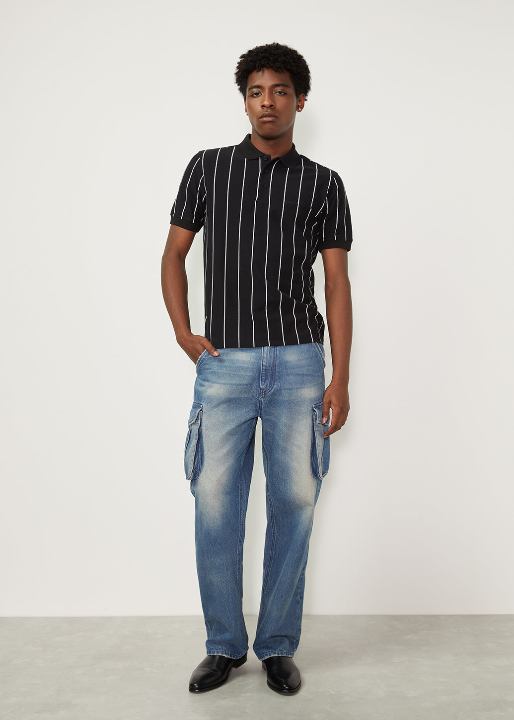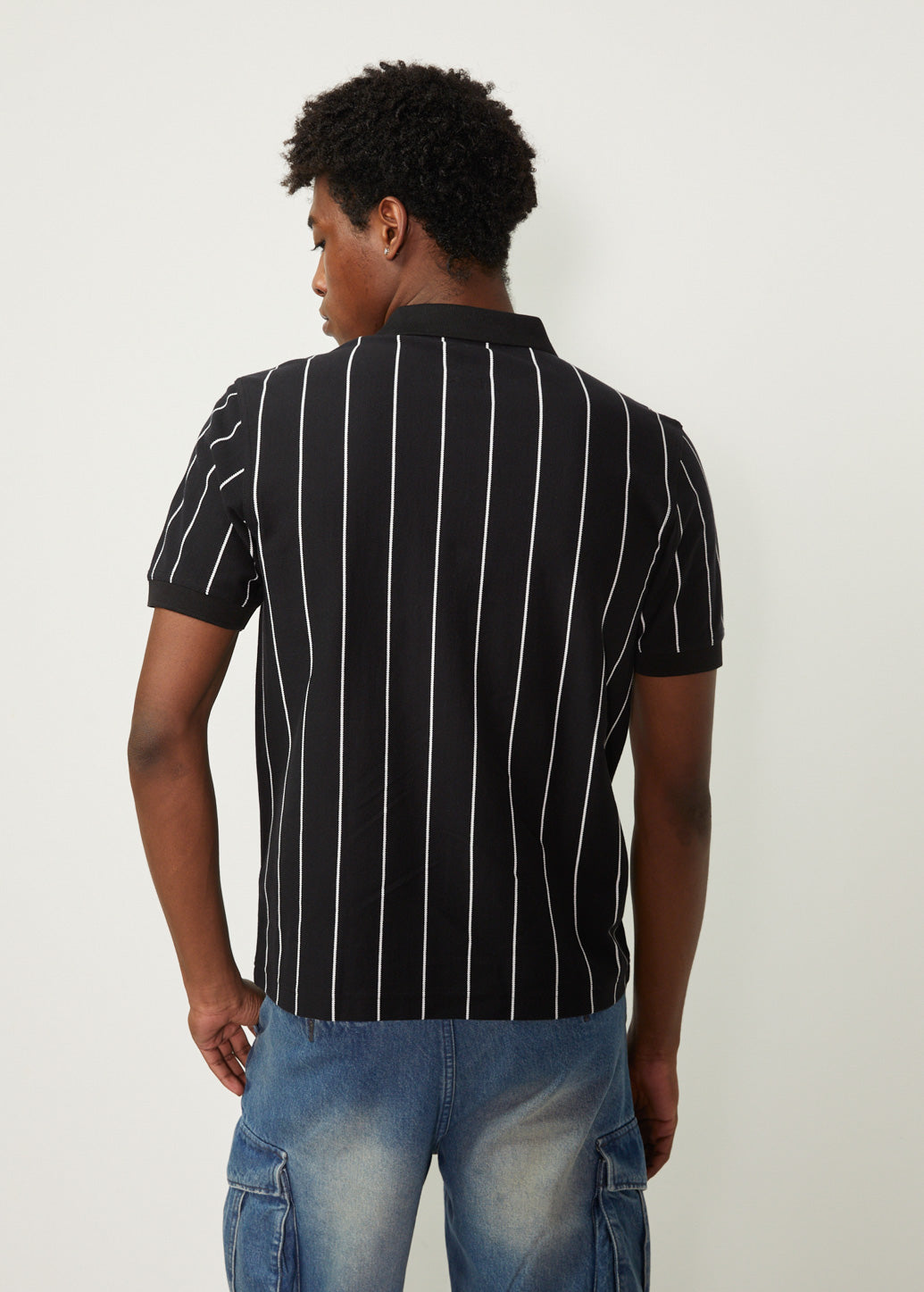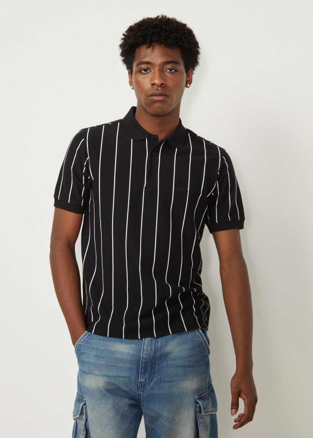 Black striped polo shirt in a fitted silhouette with a sleek yet standout design. Versatile for both casual and smart looks, it features subtle stripes that add depth and style to your everyday outfit. Pair it with your favorite trousers to create a timeless yet modern look.