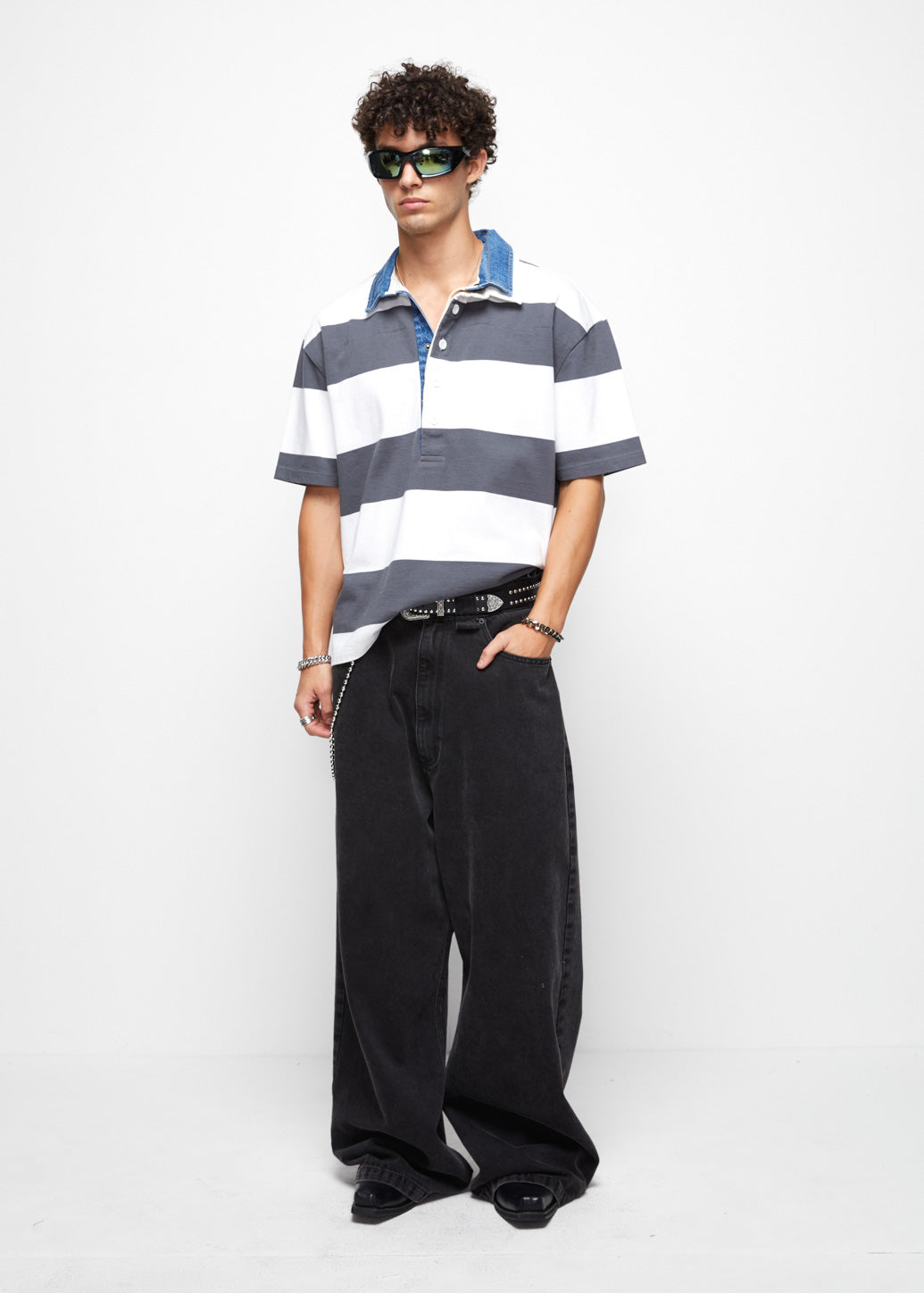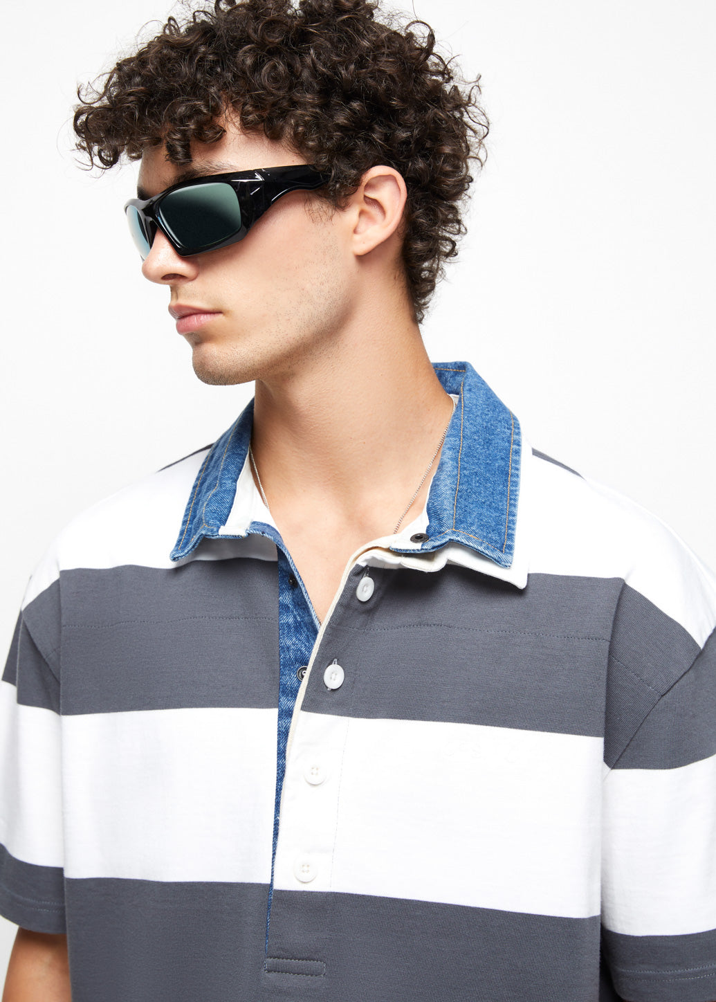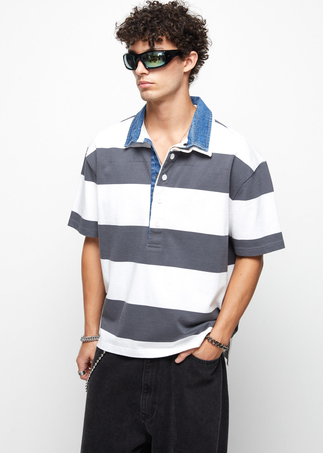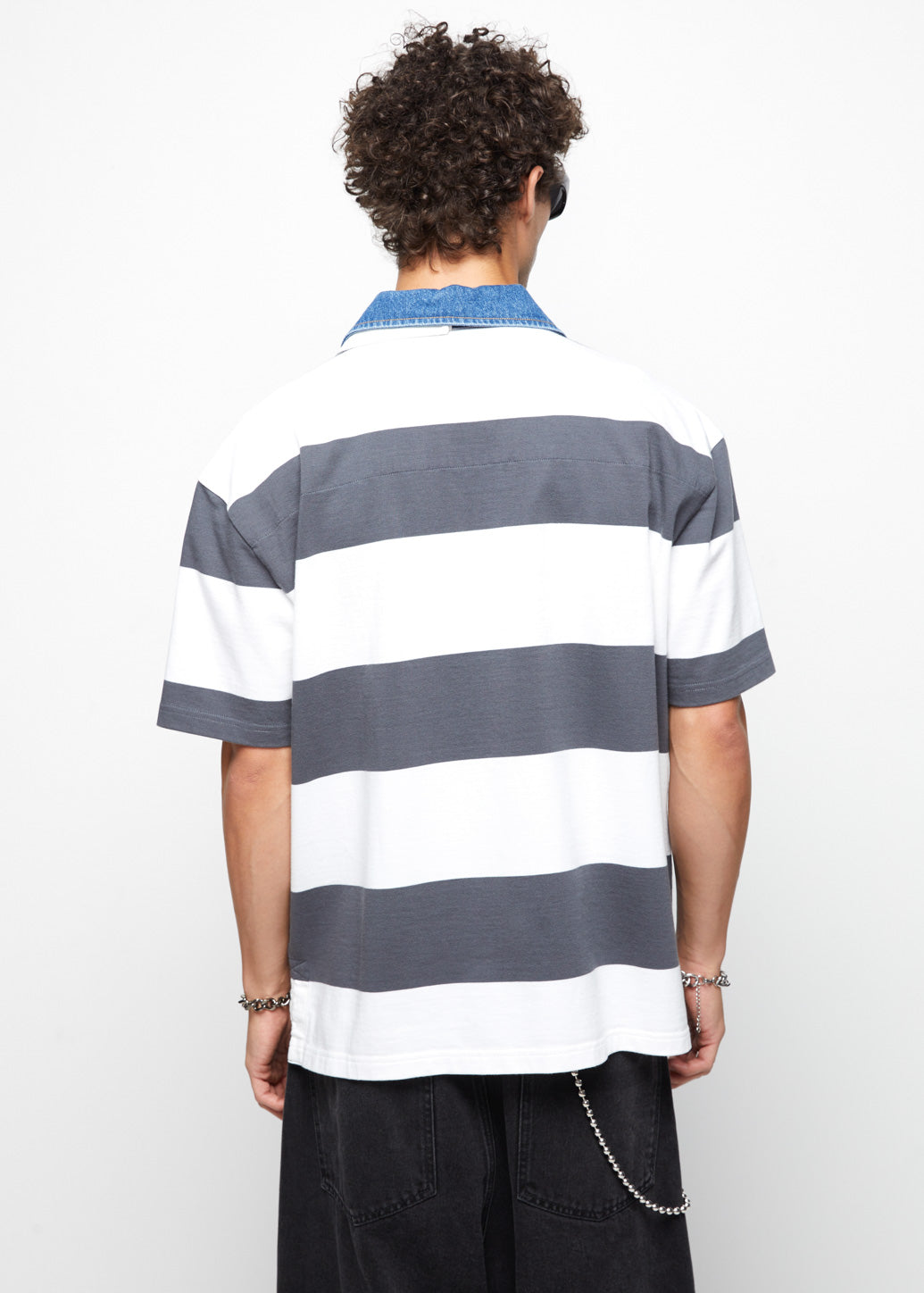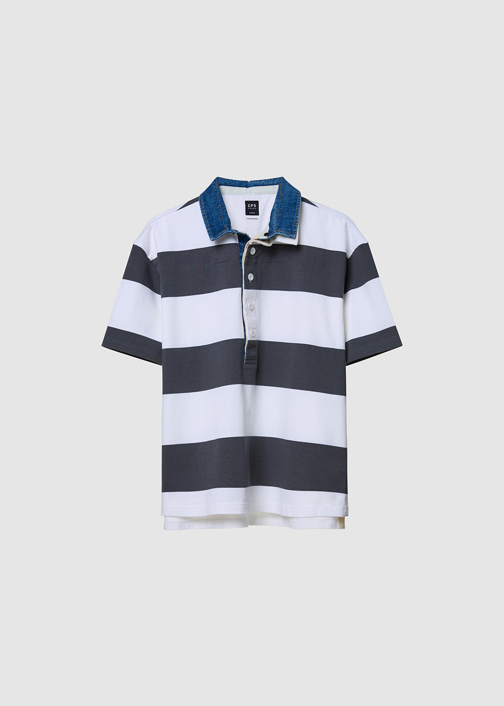 Short-sleeve polo shirt with bold navy stripes that make a standout statement. Pair it with jeans or shorts jeans for a fun yet effortlessly cool look—perfect for casual style that works for any occasion.